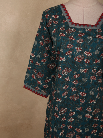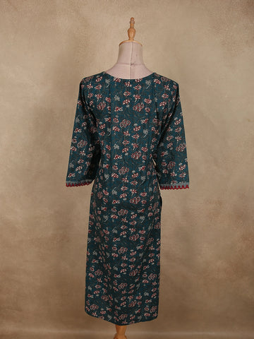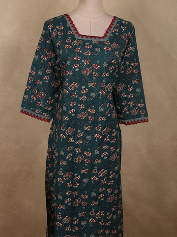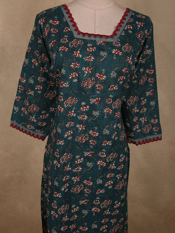 Deep Teal Blue Floral Printed Design Cotton Kurti