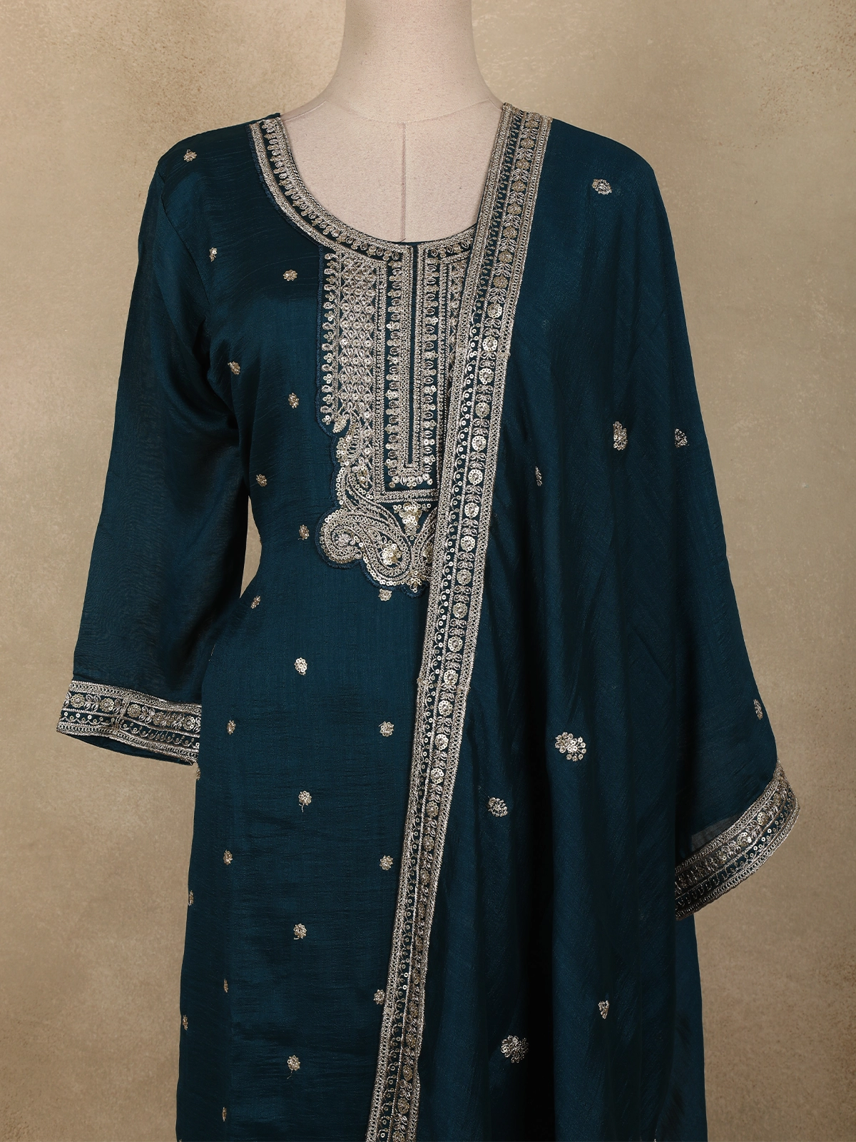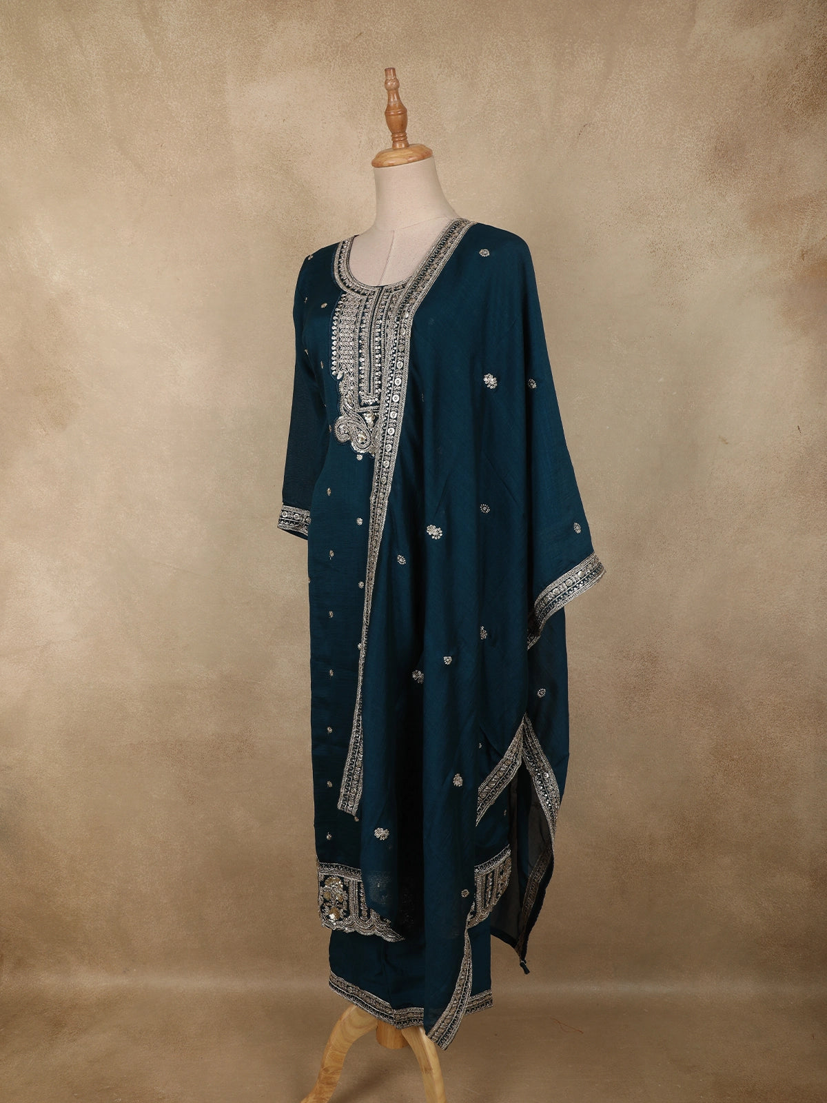 Deep Teal Blue Floral Sequins & Thread Embroidered Design Georgette Palazzo Suit with Dupatta