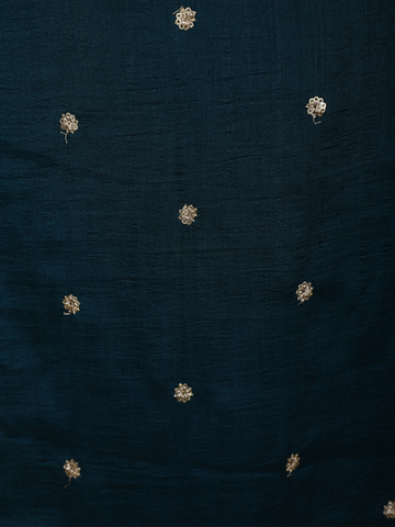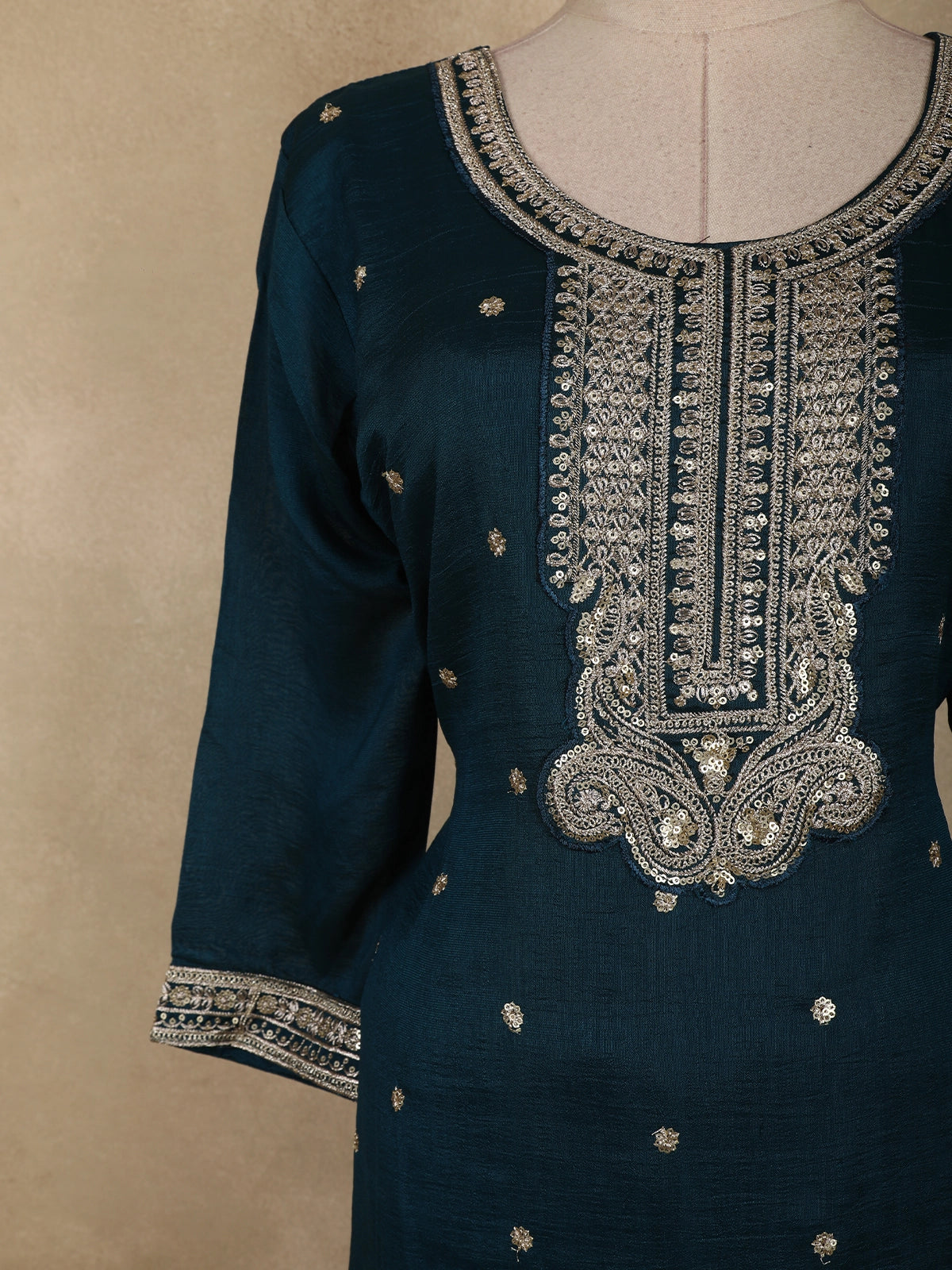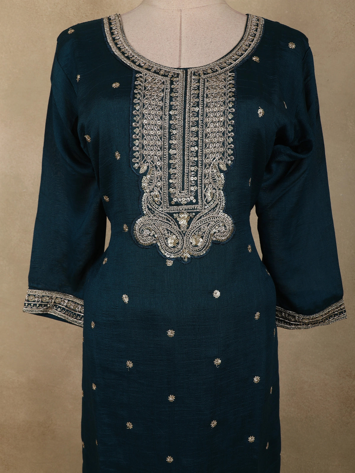 Step into timeless elegance with this stunning deep teal blue georgette palazzo suit, designed to reflect refined craftsmanship and graceful festive charm. The kurta is adorned with intricate floral thread embroidery and subtle sequin highlights, arranged beautifully along the neckline and front panel to create a slimming and elegant silhouette.