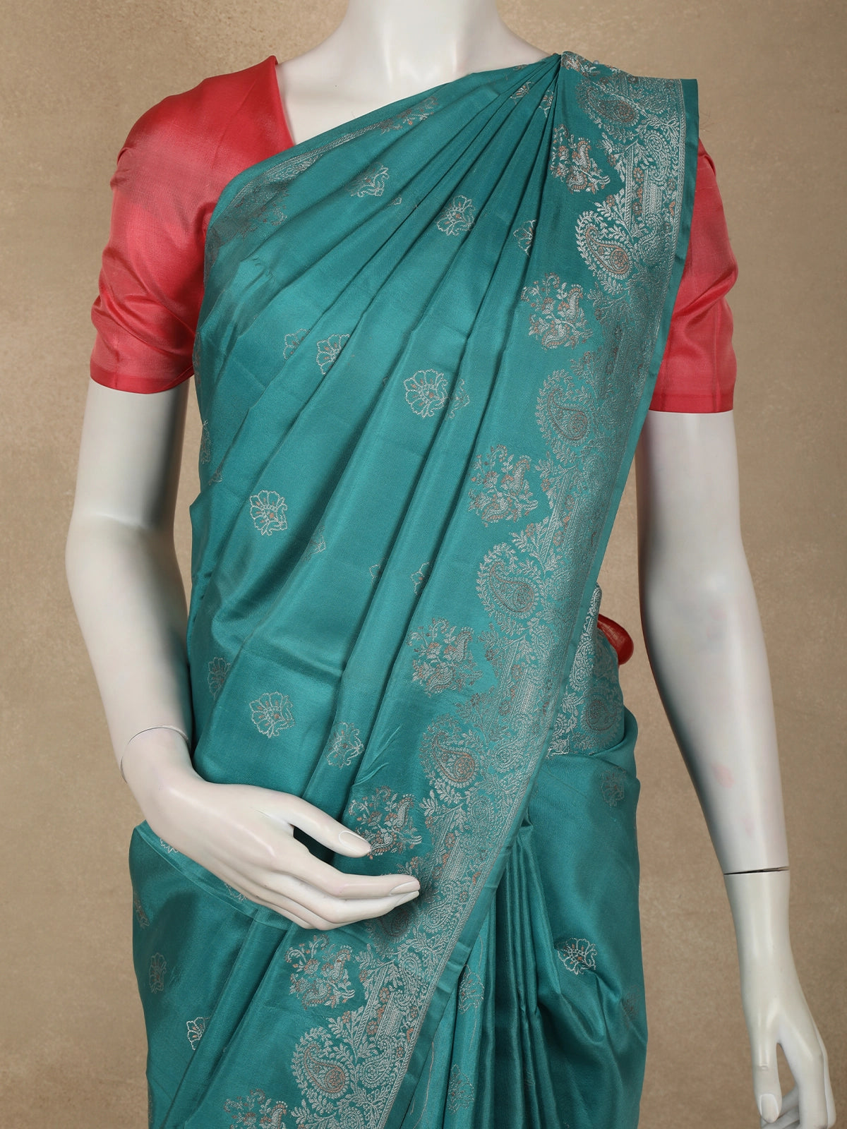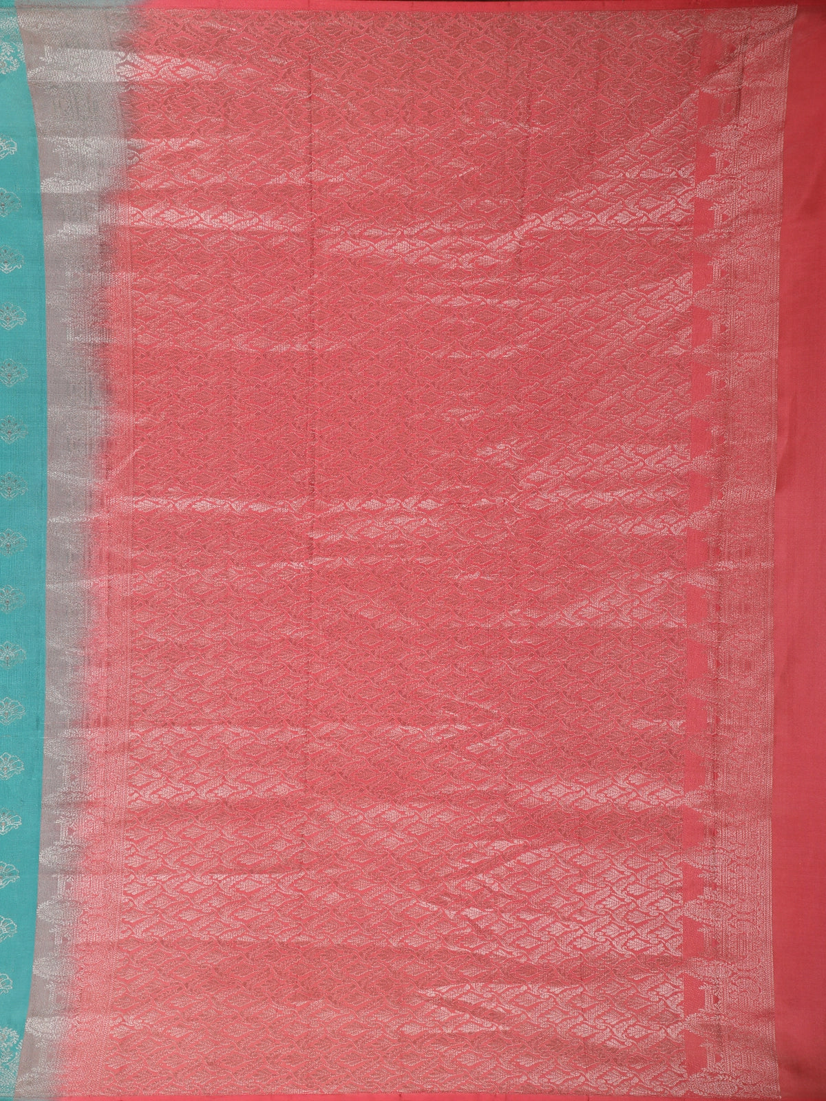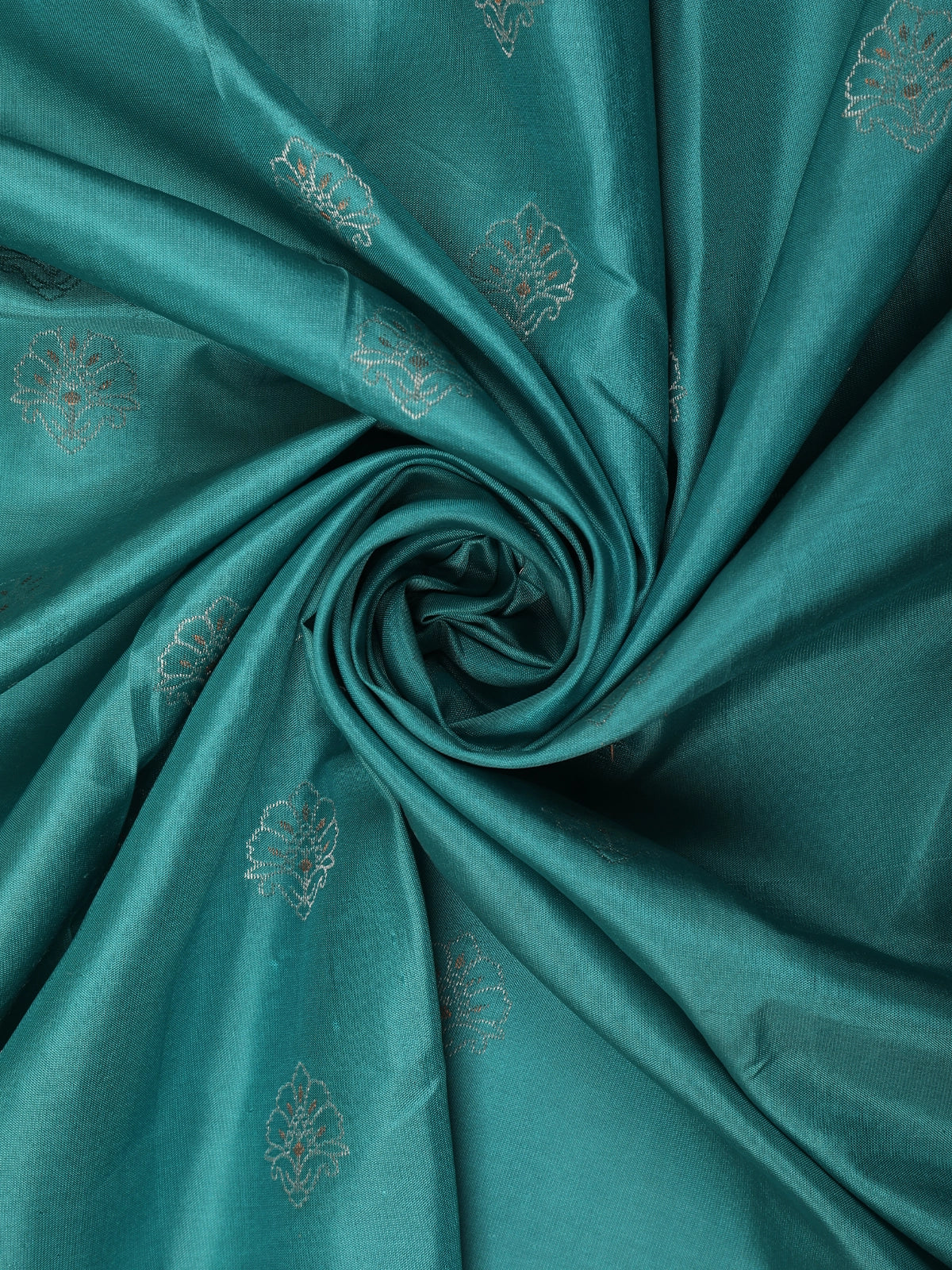 Immerse yourself in timeless elegance with this Deep Teal Blue Pure Kanchipuram Silk Saree, crafted to celebrate the beauty of traditional artistry. The rich teal blue base exudes a regal charm, beautifully enhanced by delicate floral zari motifs woven evenly across the body, adding subtle shimmer and depth to the drape.