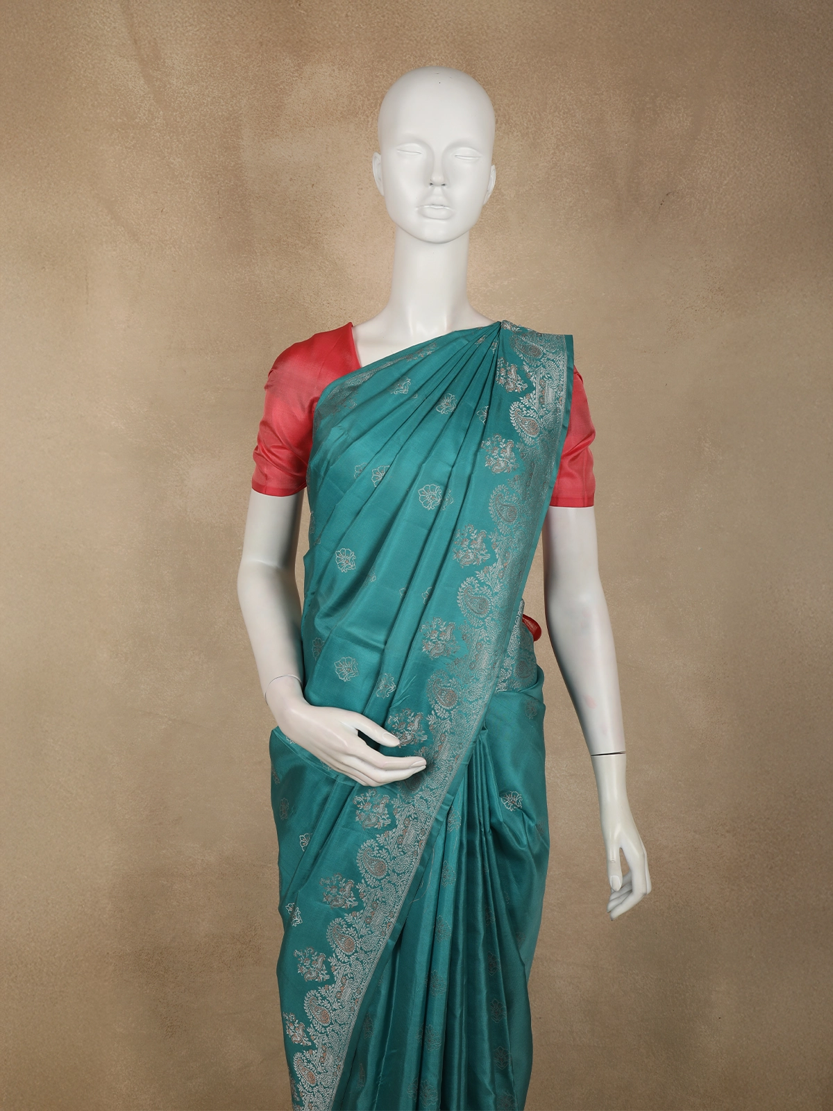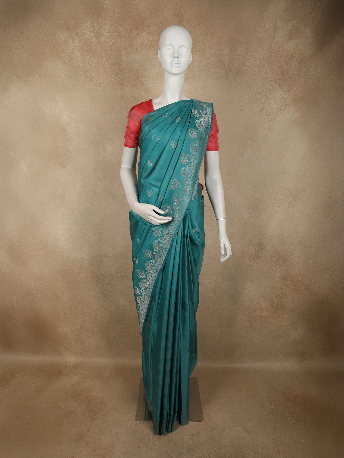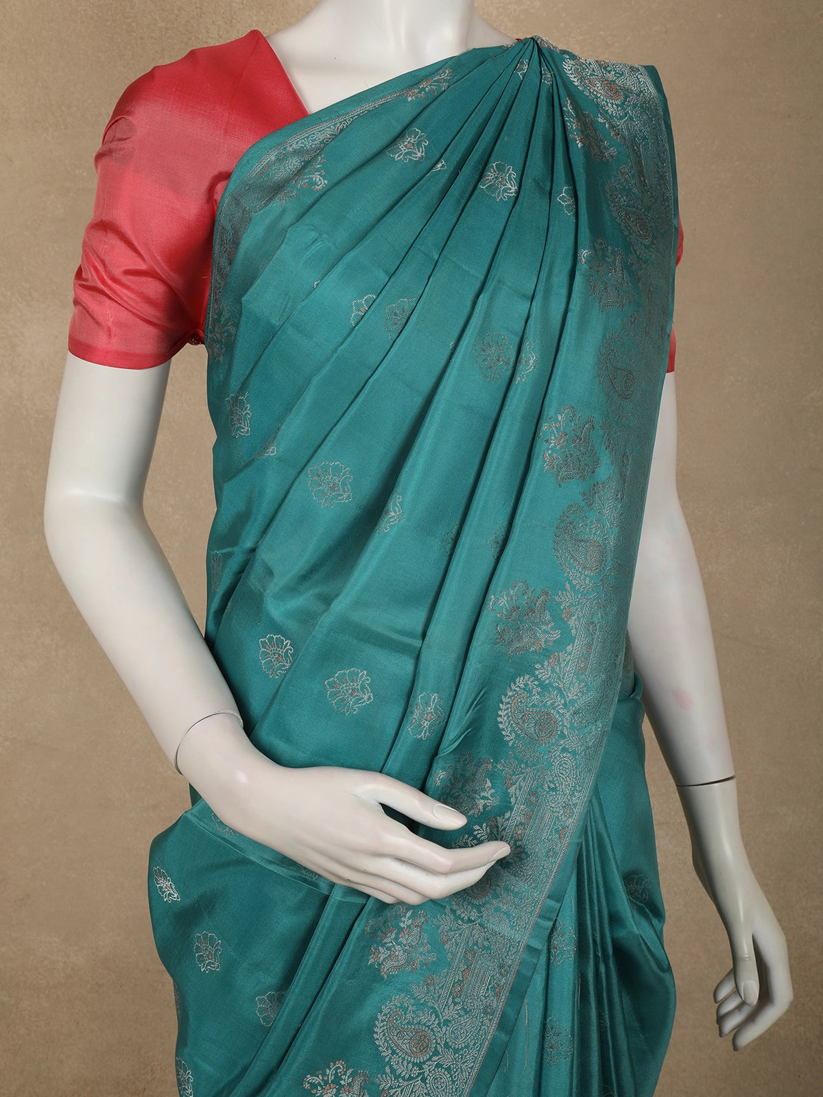 Immerse yourself in timeless elegance with this Deep Teal Blue Pure Kanchipuram Silk Saree, crafted to celebrate the beauty of traditional artistry. The rich teal blue base exudes a regal charm, beautifully enhanced by delicate floral zari motifs woven evenly across the body, adding subtle shimmer and depth to the drape.