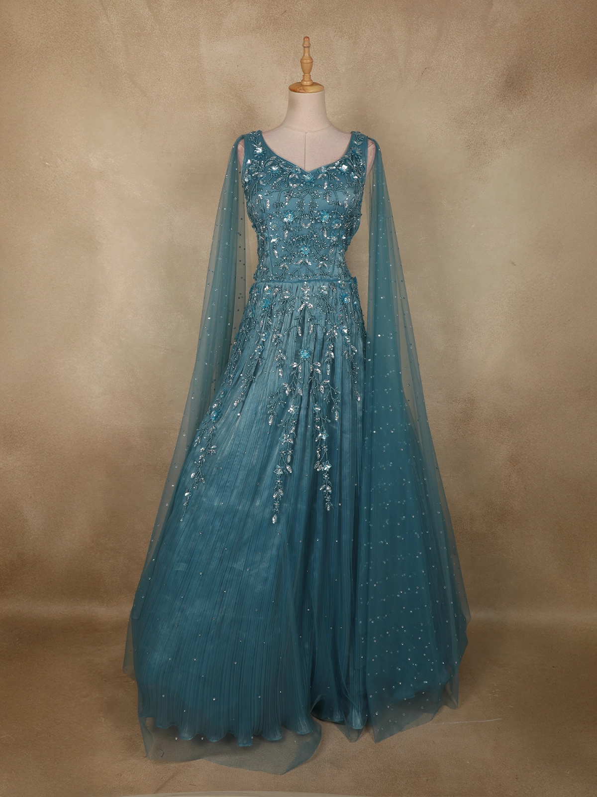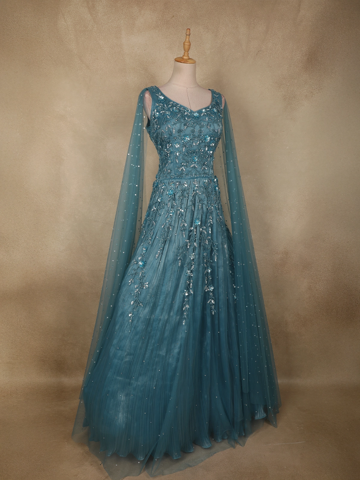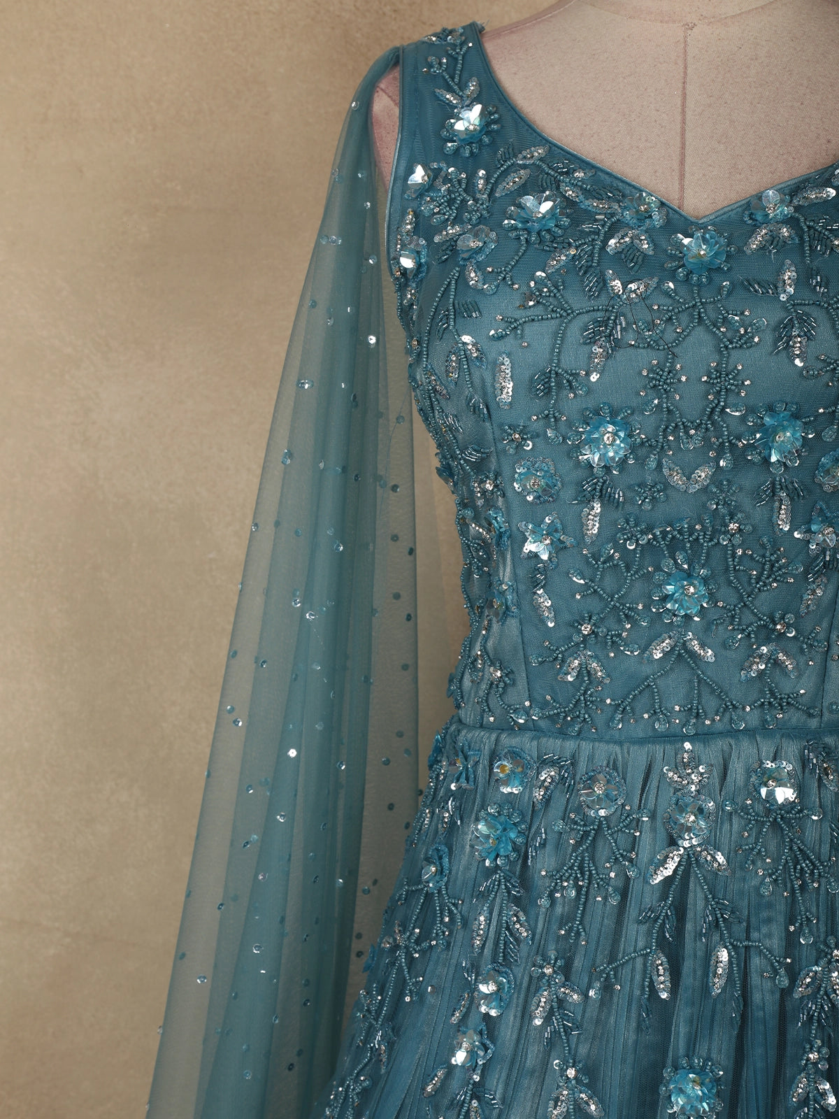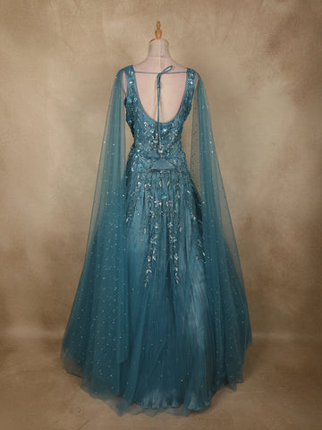 The deep teal blue hue adds a regal charm, making this gown an ideal choice for evening parties, receptions, festive celebrations, and special occasions where sophistication and glamour are essential.