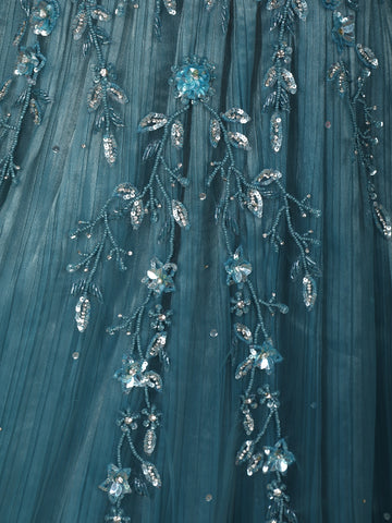 Make a striking statement with this Deep Teal Blue Heavy Sequins and Beads Embroidered Design Net Party Gown, designed to capture attention with its luxurious detailing and elegant silhouette. The richly embellished bodice features intricate floral and vine-inspired embroidery highlighted with heavy sequins and beads, creating a dazzling shimmer against the deep teal blue base.