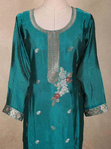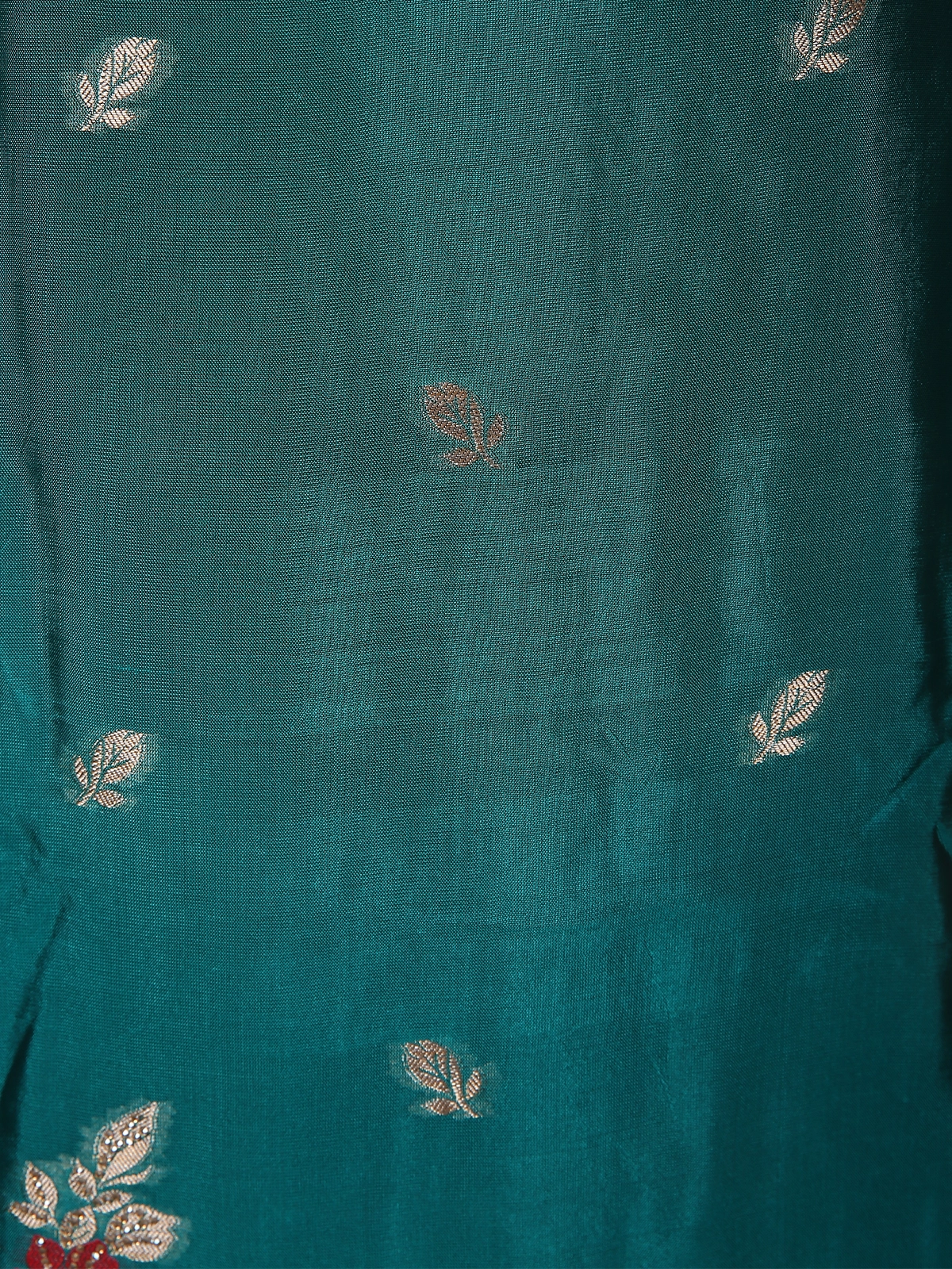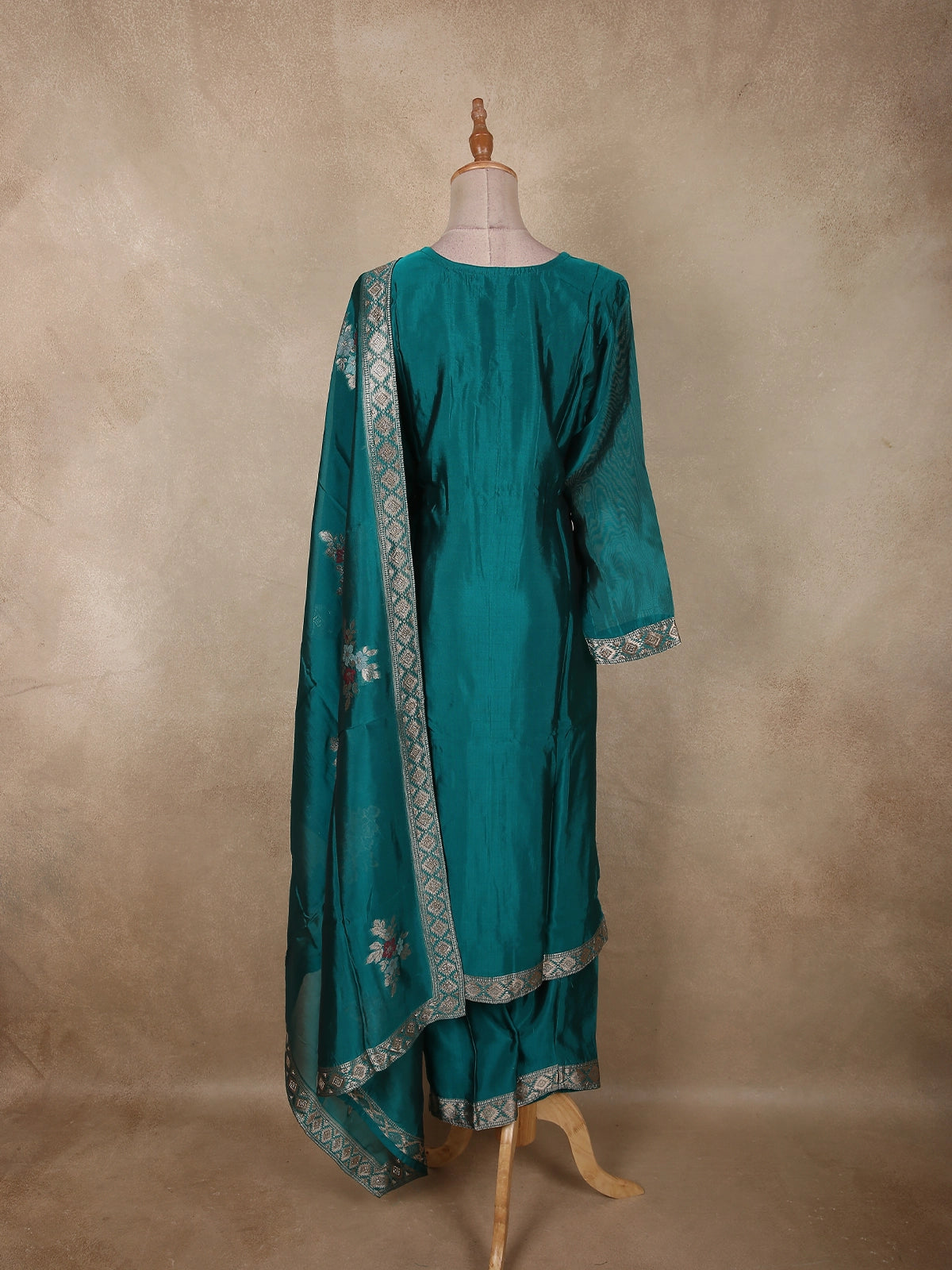Grace your festive wardrobe with this Deep Teal Blue Floral Embroidered Design Tissue Organza Salwar Suit with Dupatta, crafted to reflect refined elegance and timeless charm. Made from premium tissue organza, the ensemble features a rich deep teal green hue enhanced with a subtle sheen that adds depth and sophistication.
