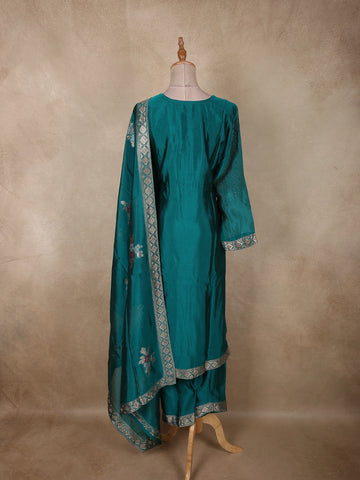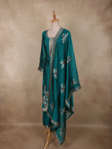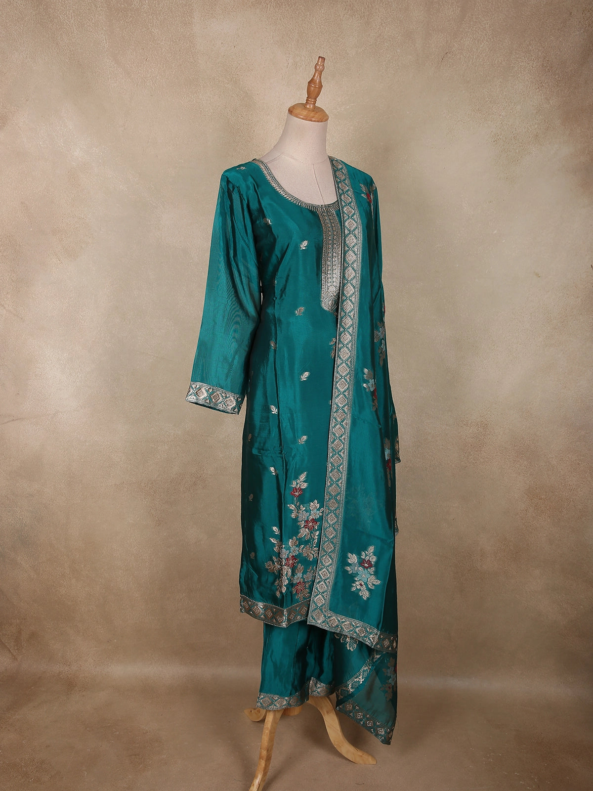 Deep Teal Blue Floral Embroidered Design Tissue Organza Salwar Suit with Dupatta