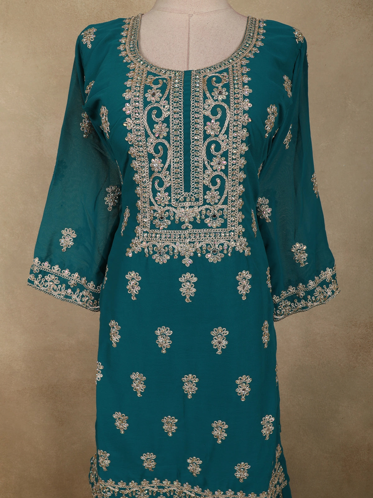 The georgette kurti features finely detailed floral motifs woven with shimmering zari work, gracefully adorning the neckline, yoke, sleeves, and hem. The straight-cut silhouette offers a flattering fit while maintaining ease of movement, making it ideal for extended celebrations. Delicate embroidery accents on the three-quarter sleeves add a refined touch to the overall design.
