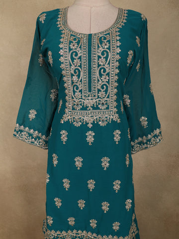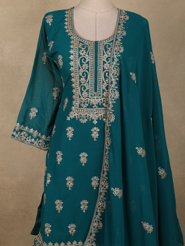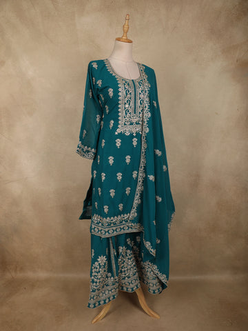 Deep Teal Blue Floral Zari Embroidered Design Georgette Palazzo Suit with Dupatta