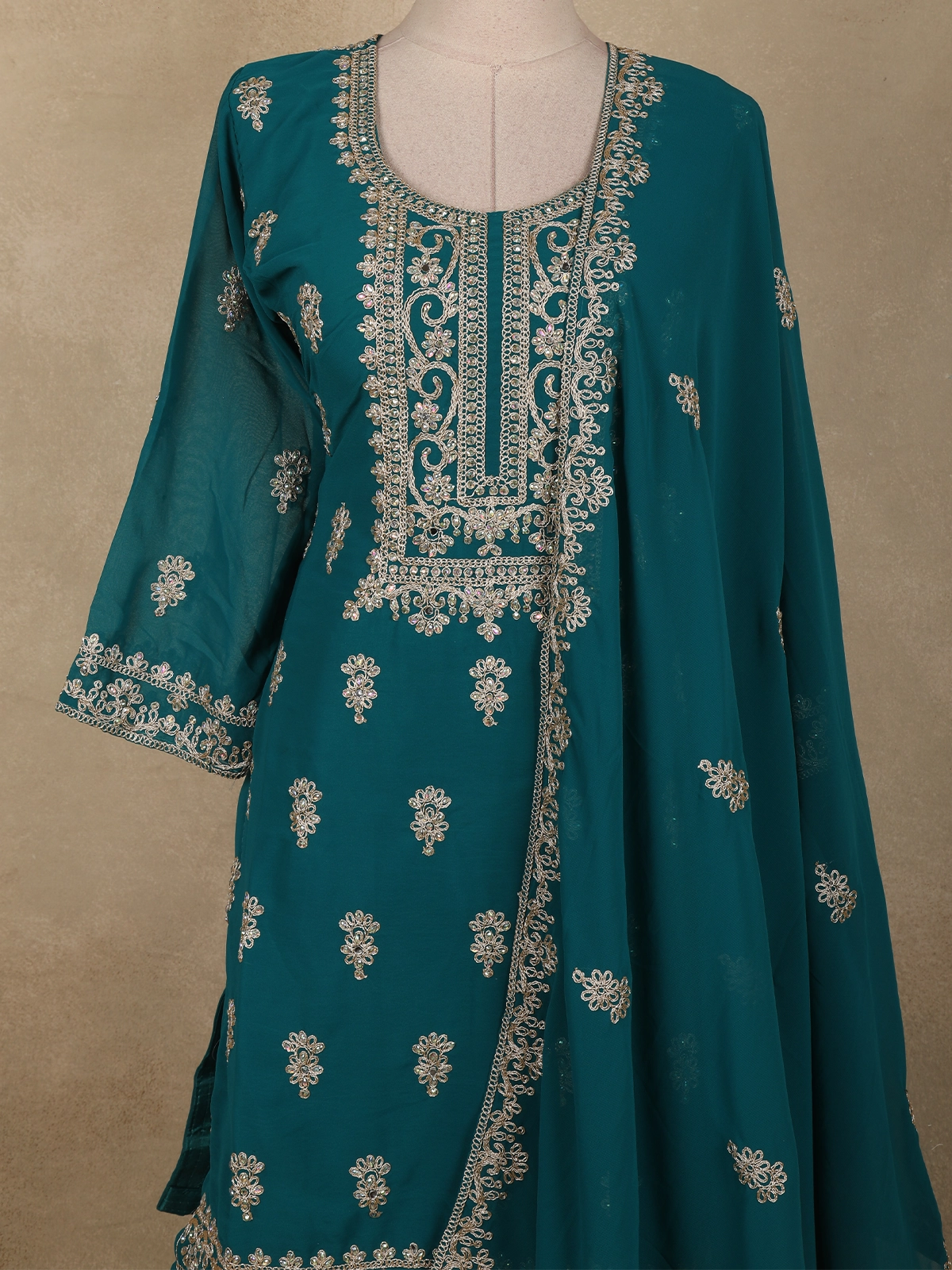 Elevate your festive wardrobe with this Deep Teal Green Floral Zari Embroidered Georgette Palazzo Suit with Dupatta, a perfect blend of elegance, comfort, and timeless craftsmanship. Rendered in a rich deep teal green hue, this ensemble exudes understated luxury, beautifully enhanced with intricate floral zari embroidery.