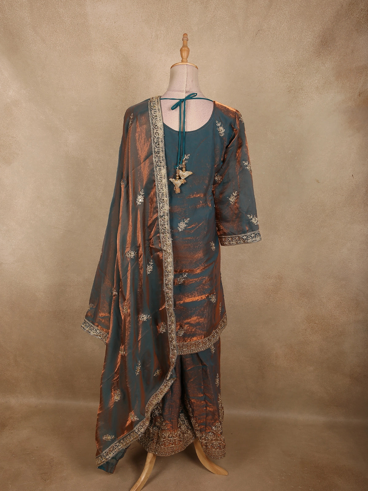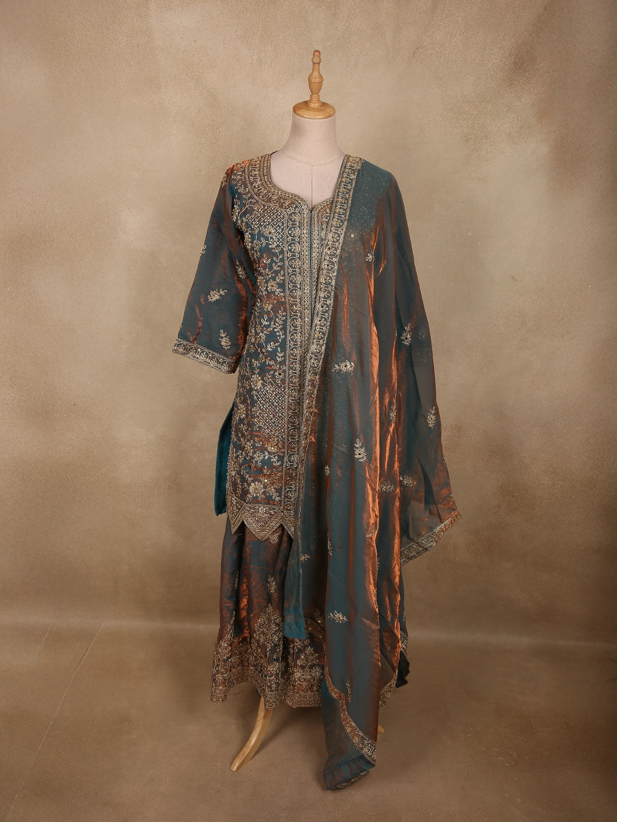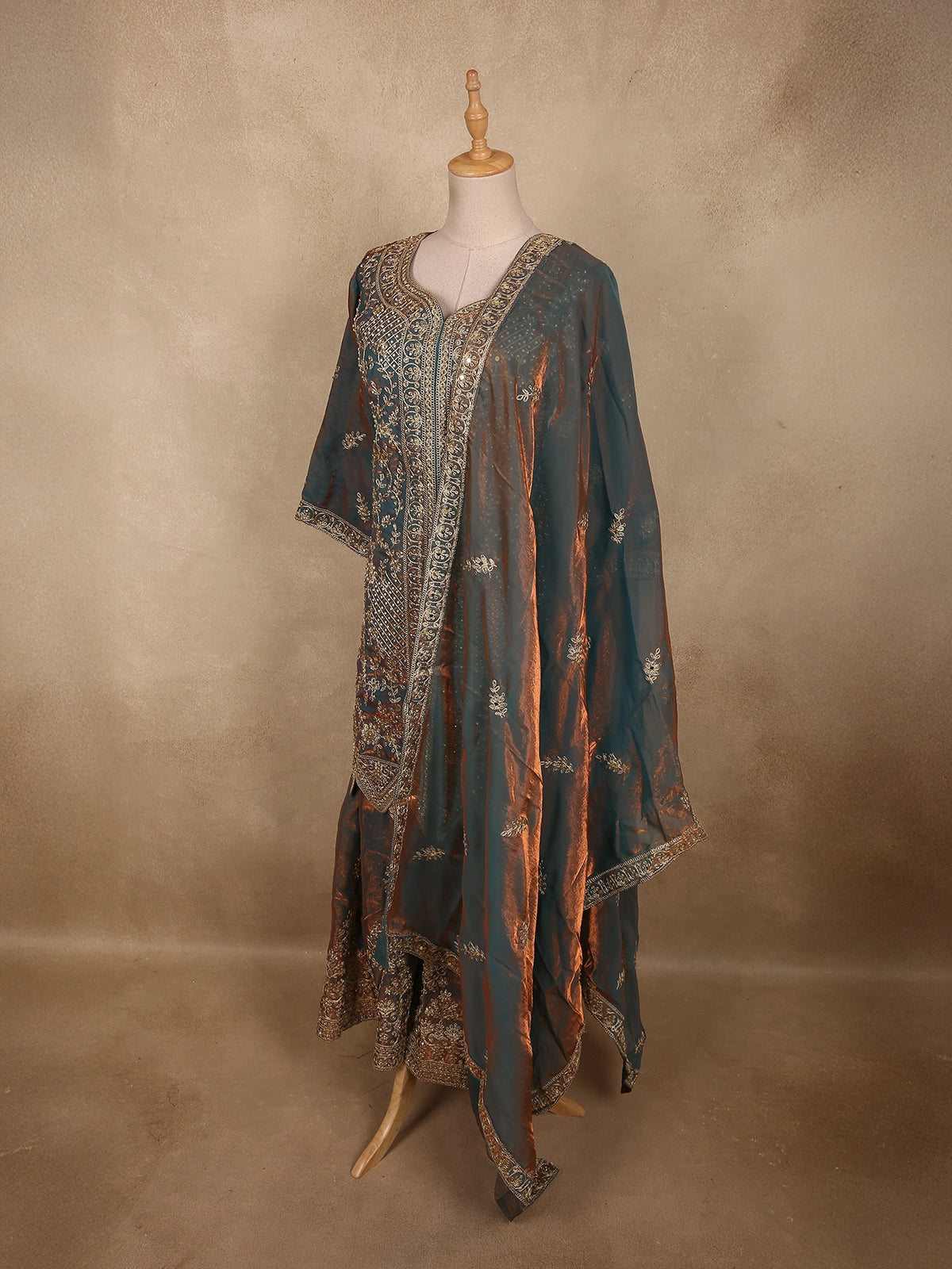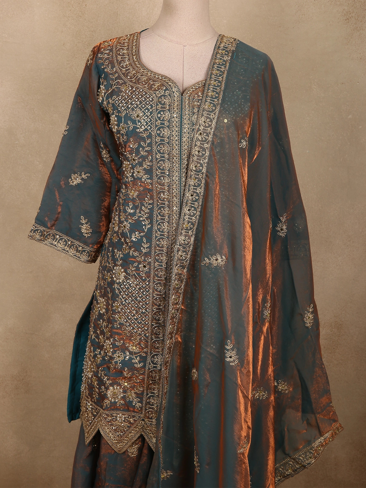 Make a striking statement with this deep teal green palazzo suit, crafted in luxurious organza that offers a light, graceful drape with a subtle sheen. The rich teal base is beautifully enriched with warm undertones, creating a depth of colour that feels both regal and contemporary.