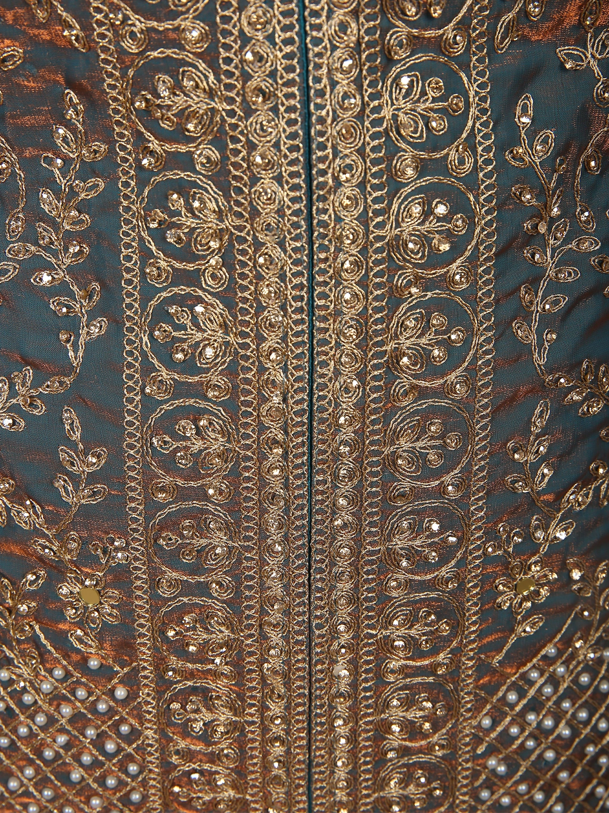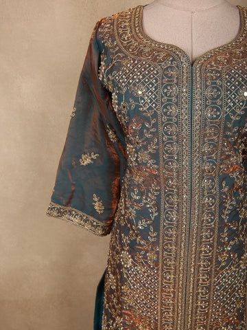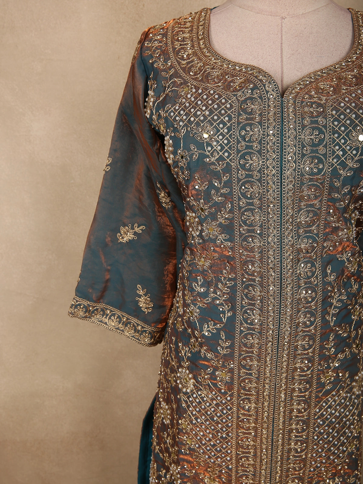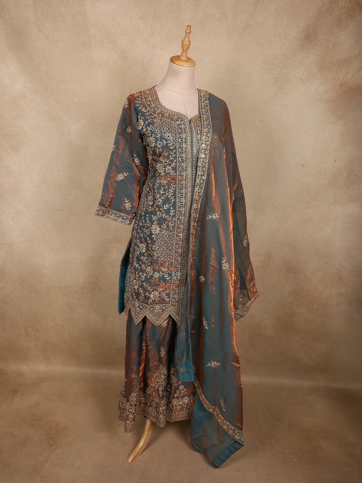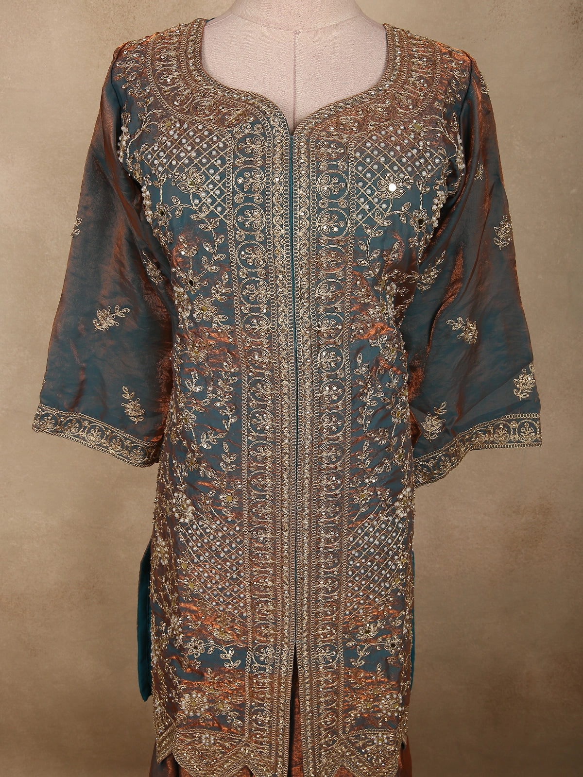 Make a striking statement with this deep teal green palazzo suit, crafted in luxurious organza that offers a light, graceful drape with a subtle sheen. The rich teal base is beautifully enriched with warm undertones, creating a depth of colour that feels both regal and contemporary.