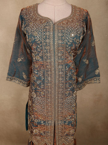The kurta showcases intricate floral zari embroidery along the neckline, front panels, sleeves, and hem, forming an elegant, elongated silhouette. Delicately placed motifs across the fabric add refined detailing, while the ornate borders lend a couture-inspired finish. The sheer organza texture enhances the richness of the embroidery, allowing the zari work to shimmer softly with every movement.