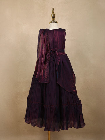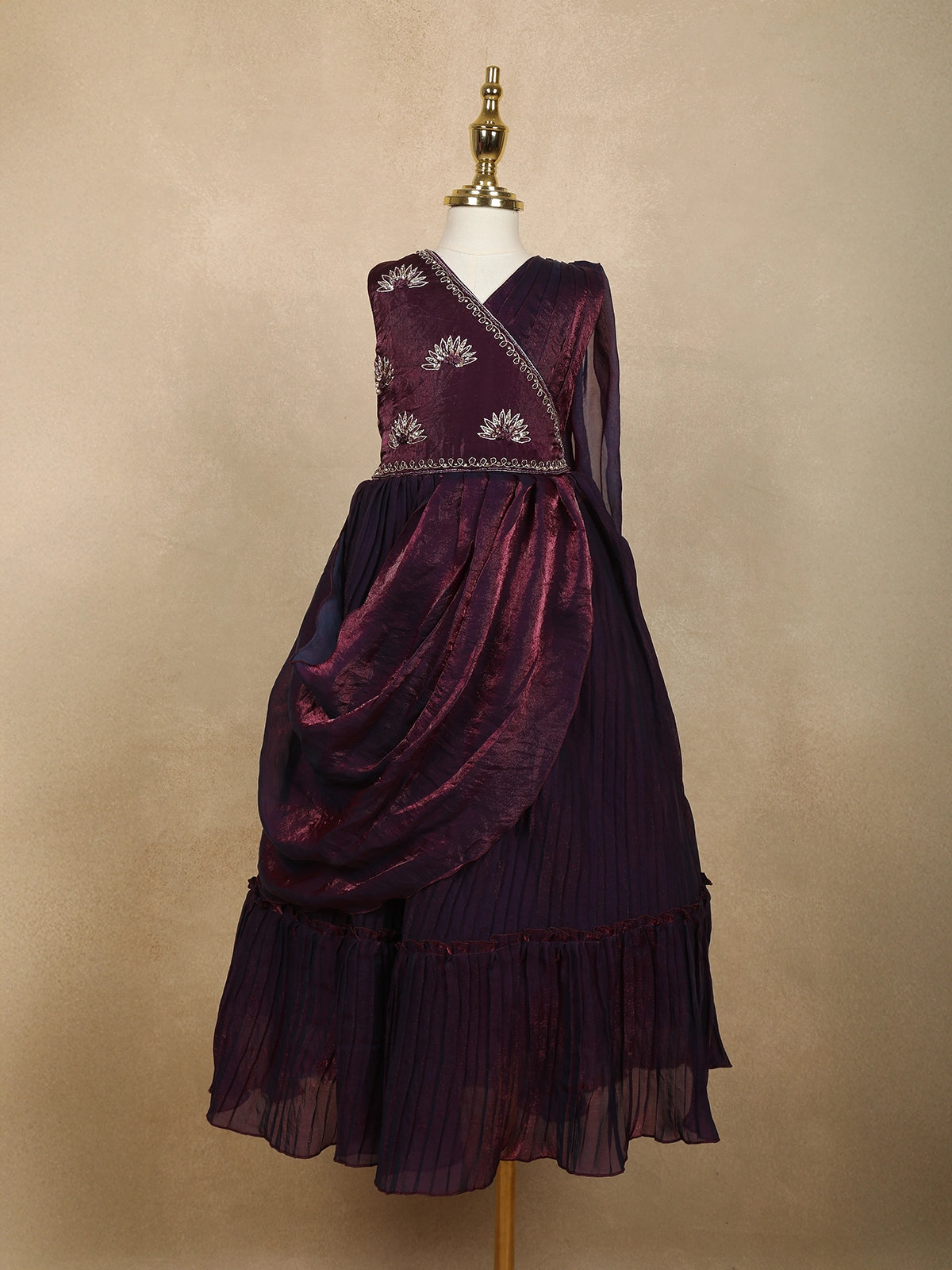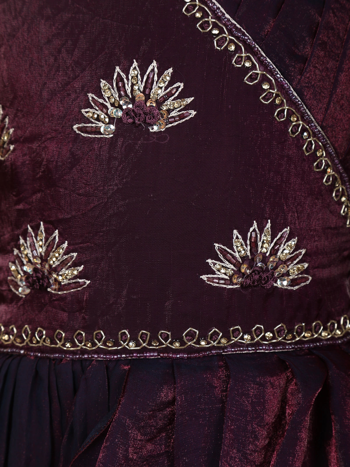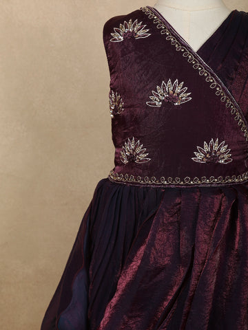 Deep Wine Floral Sequins and Beads Embroidered Design Satin Kids Gown with Attached Dupatta