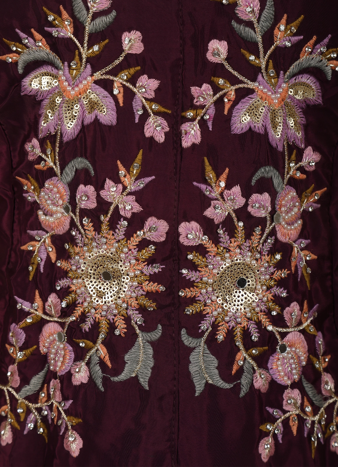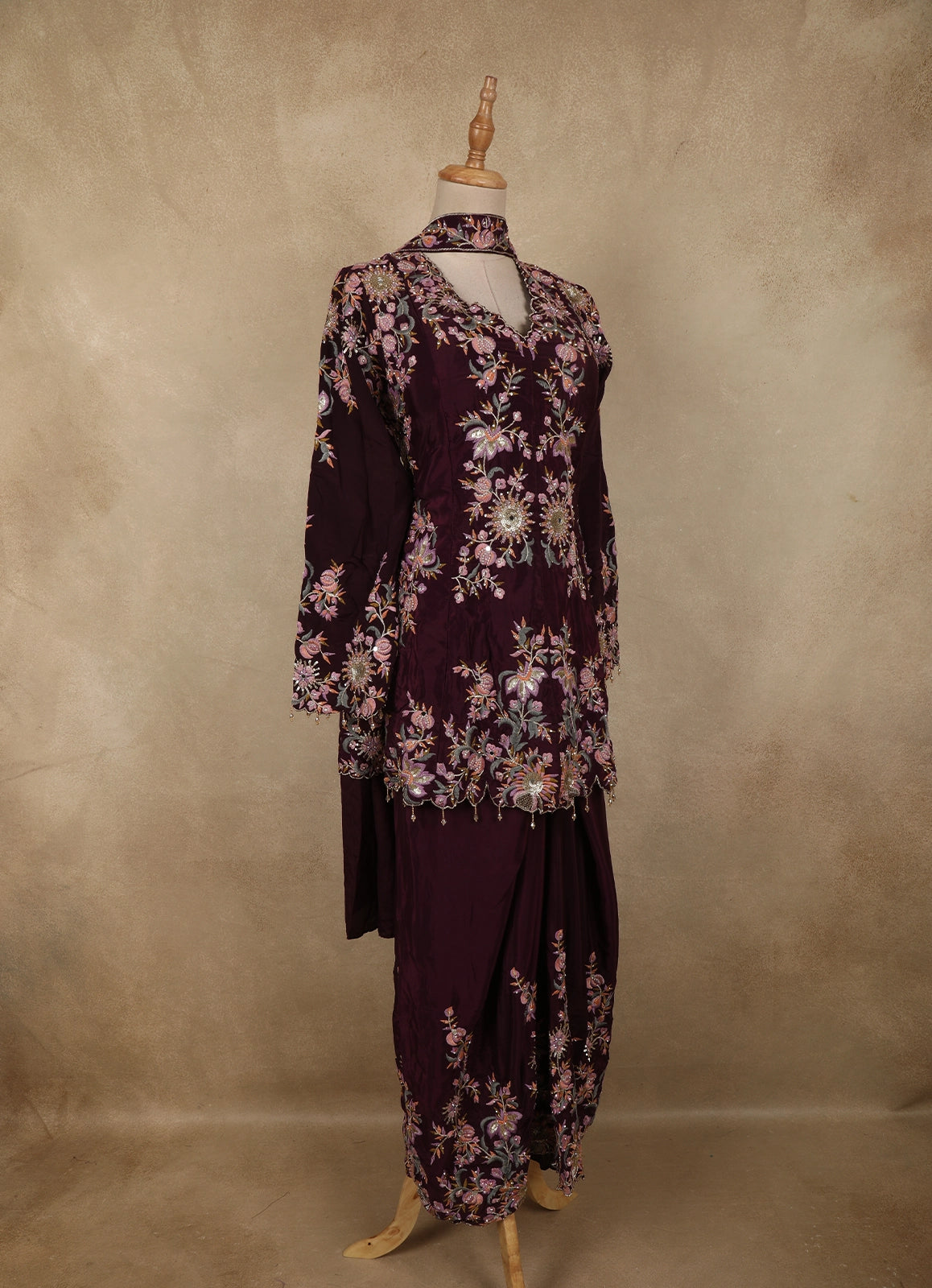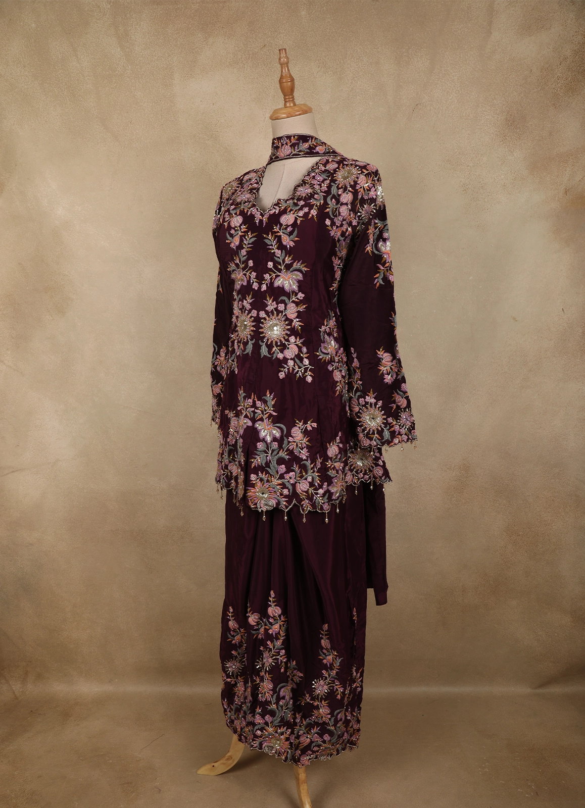 Perfect for festive celebrations, wedding functions, evening occasions, and special gatherings, this deep wine peplum palazzo suit blends contemporary styling with traditional embroidery, making it a sophisticated choice for refined occasion wear.