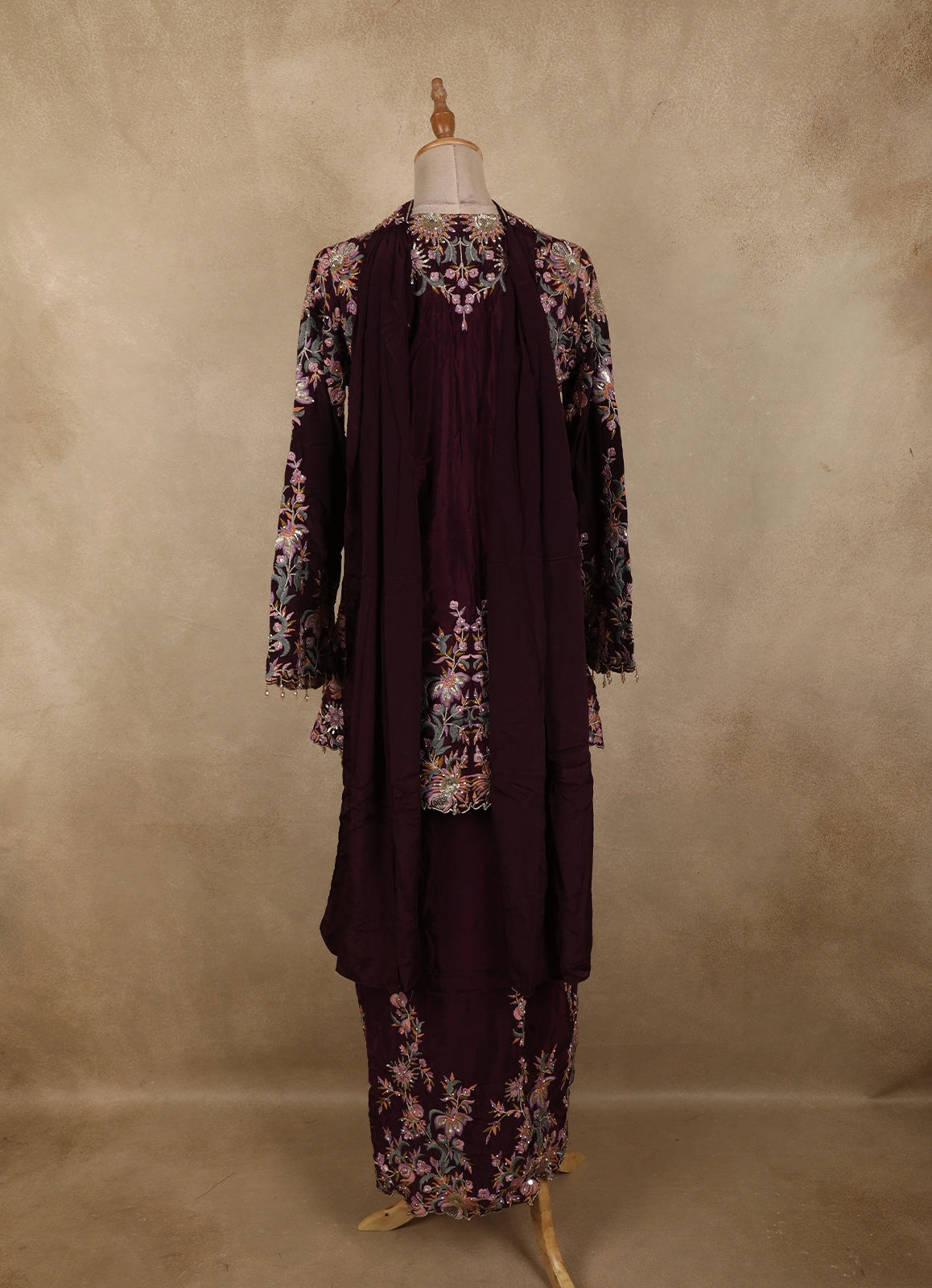 Deep Wine Floral Thread Embroidered Design Crepe Peplum Palazzo Suit with Dupatta