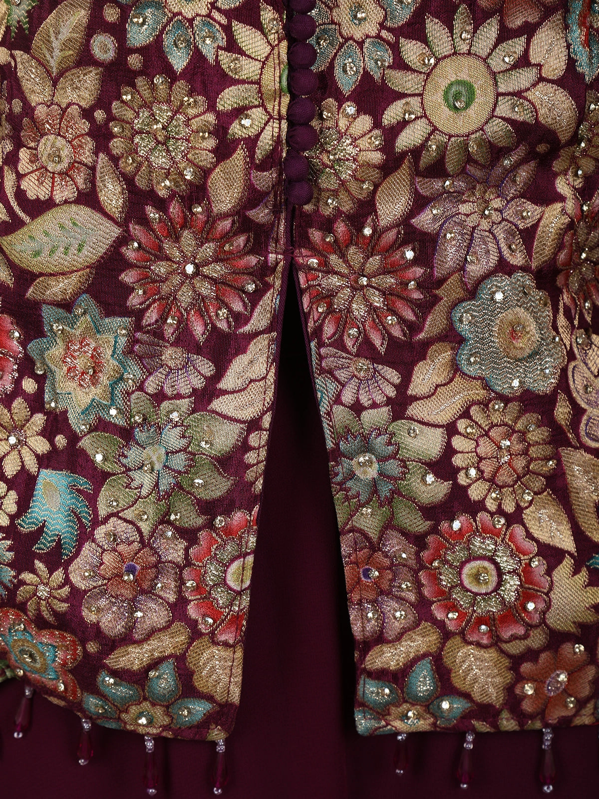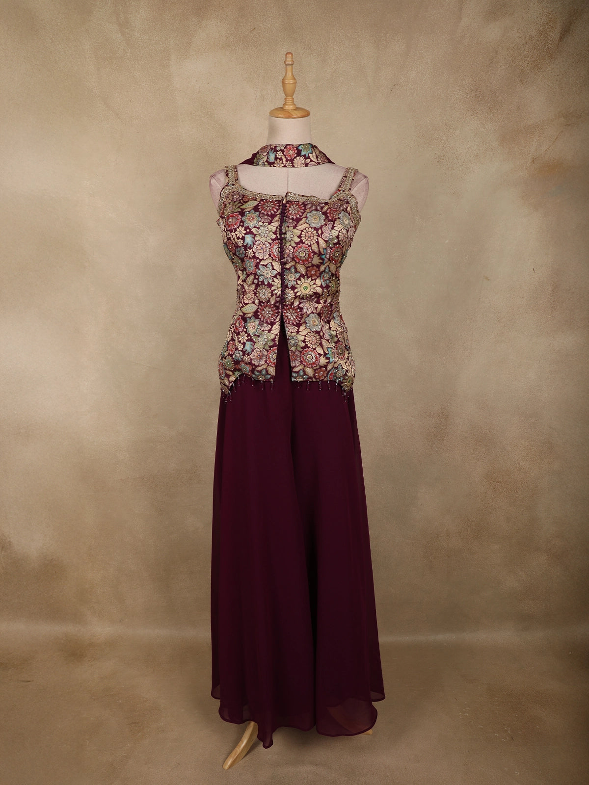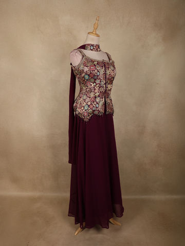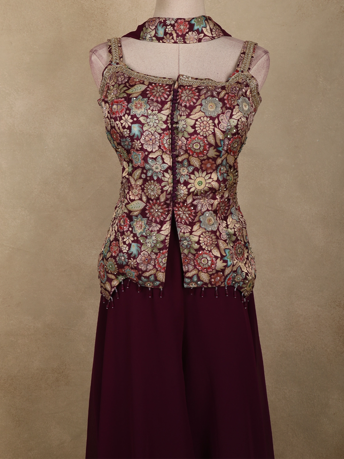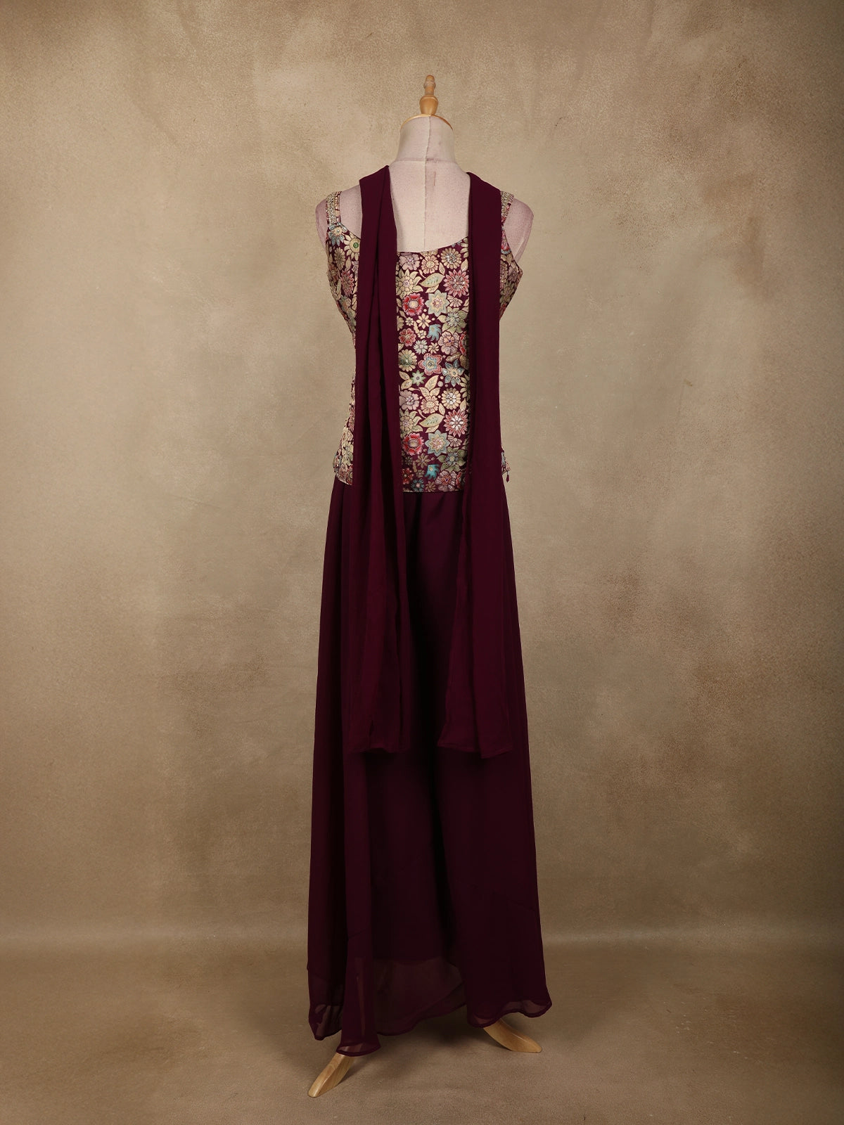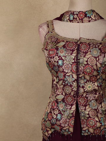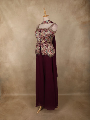 Deep Wine Floral Zari Woven Design Georgette Palazzo Suit with Dupatta
