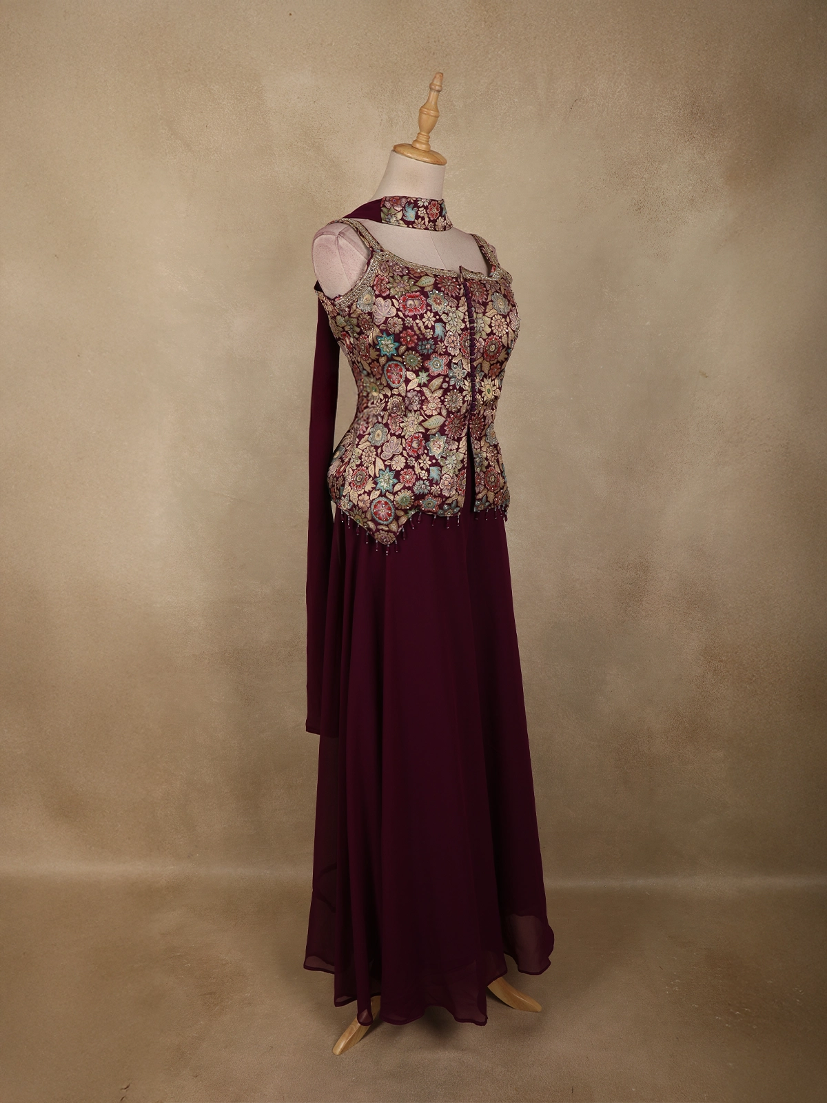 The georgette kurti is adorned with delicate floral Zari embroidery, thoughtfully highlighted with multicolour accents that create a lively, handcrafted appeal. The asymmetrical neckline and uniquely detailed front panel add a modern touch, while the soft gathers at the waist enhance the silhouette with a flattering fall. Decorative tassel accents lend a playful yet elegant finish to the design.