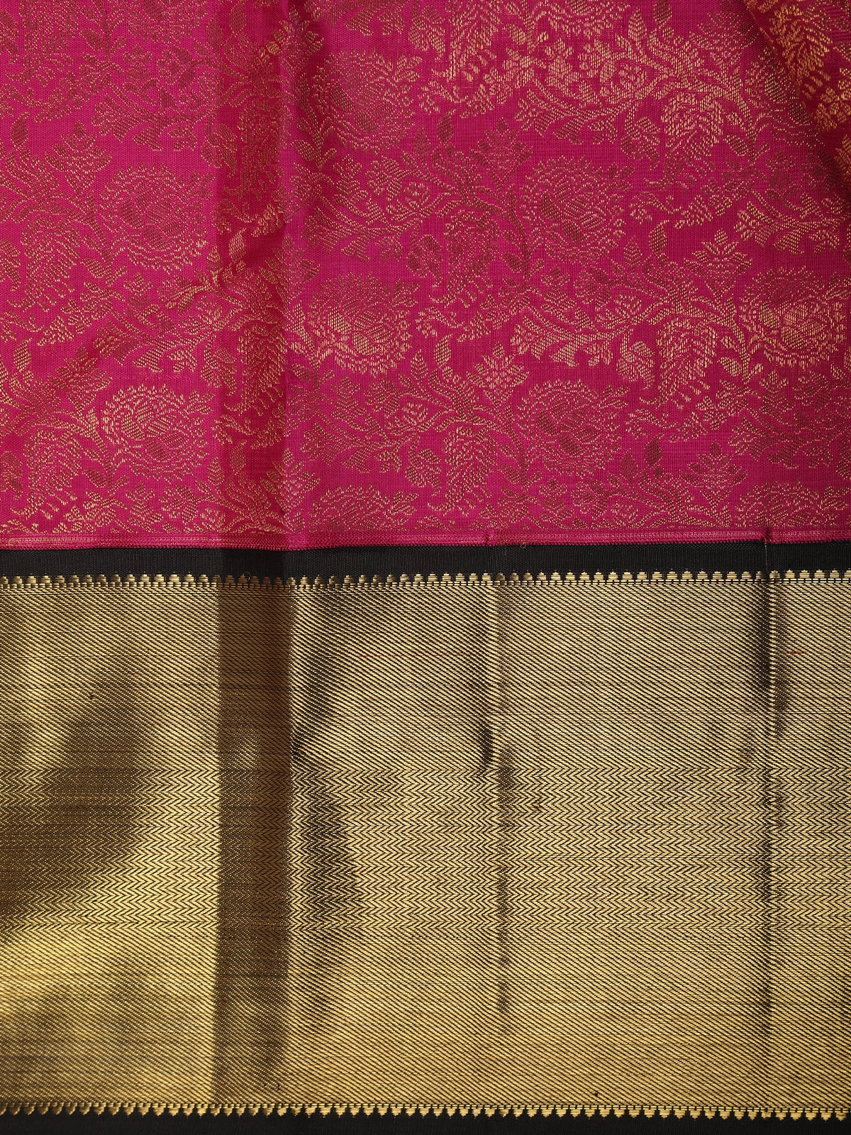The saree is adorned with intricately woven floral motifs, highlighted in luminous golden zari, adding depth and richness to the silk’s natural sheen. Each motif reflects the meticulous craftsmanship that defines authentic Kanchipuram weaving, offering both beauty and heirloom value.