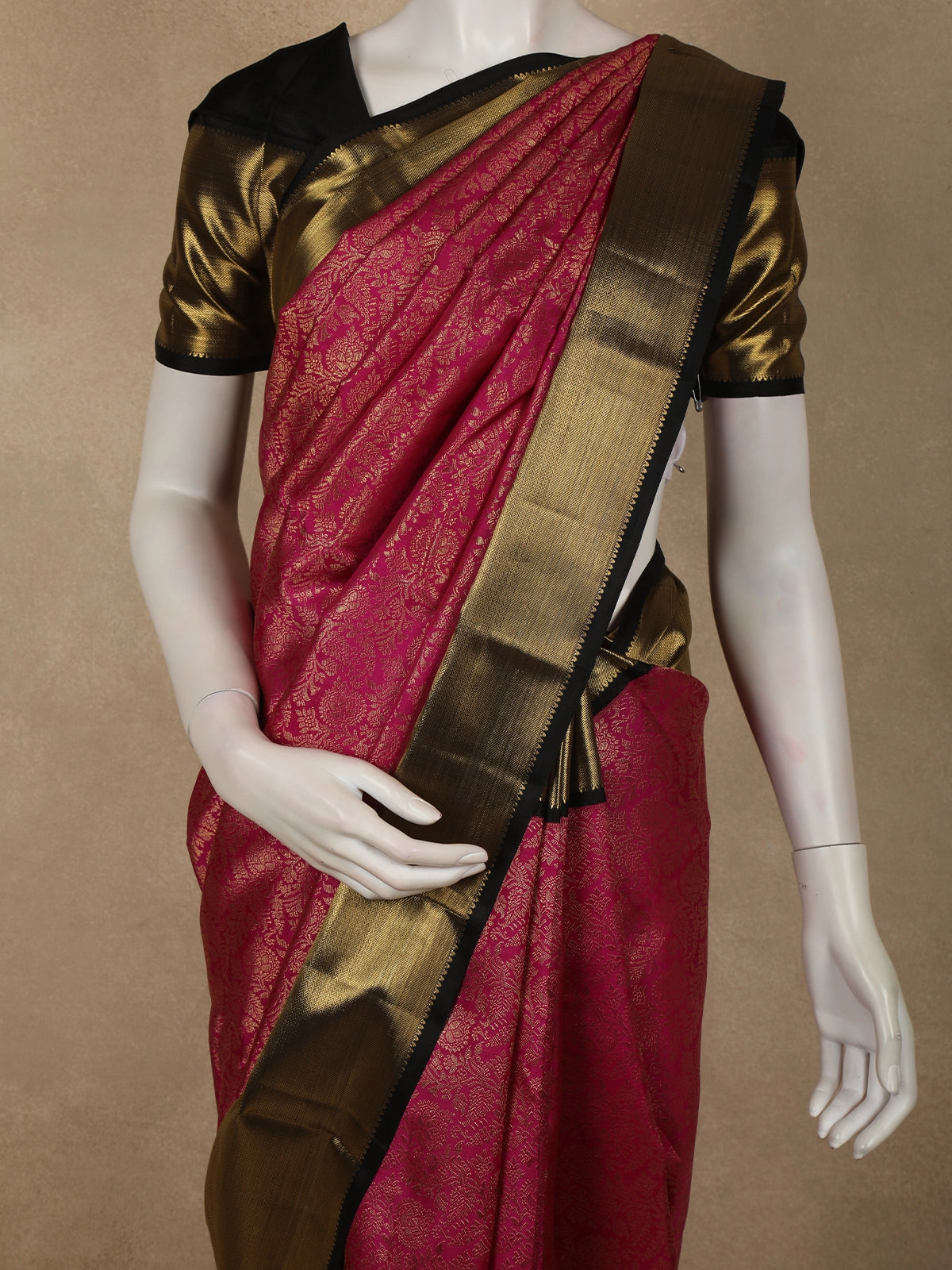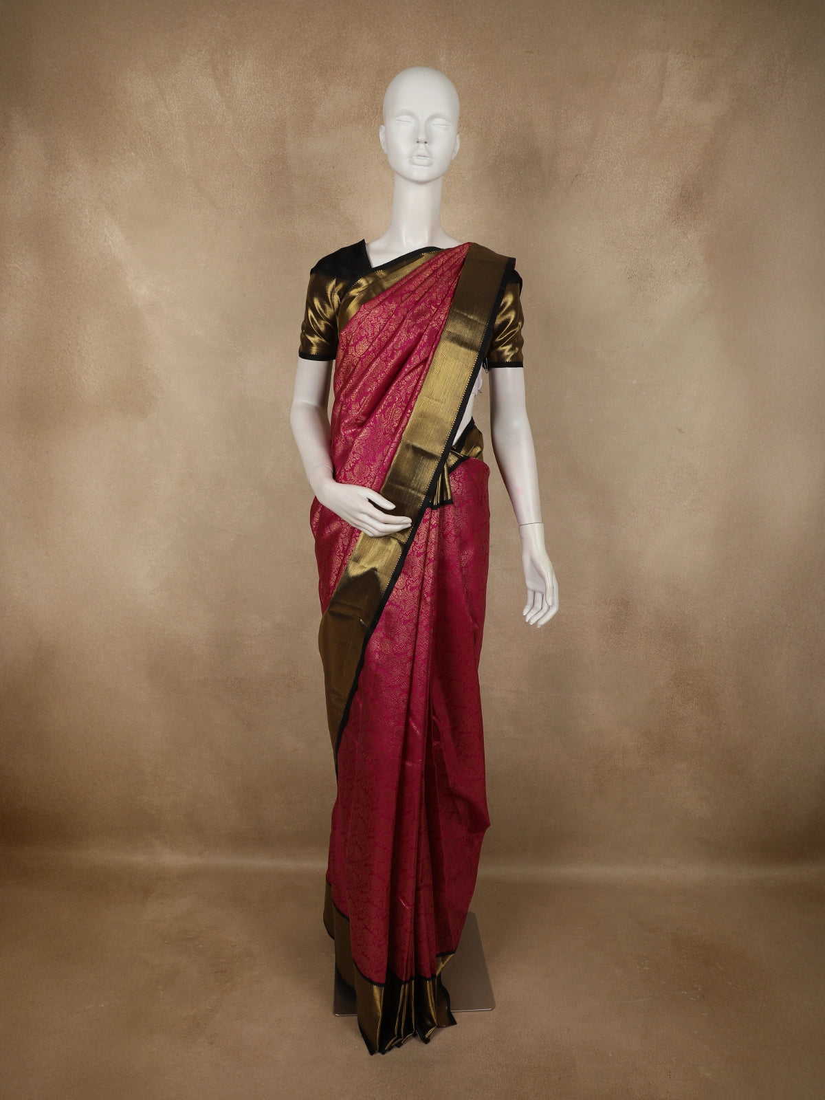 Paired with a complementing black blouse with gold detailing, this saree achieves a refined contrast that elevates the overall look. Elegant and timeless, this piece is ideal for brides, wedding guests, and anyone who appreciates classic silks with intricate zari artistry.