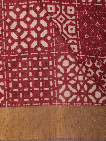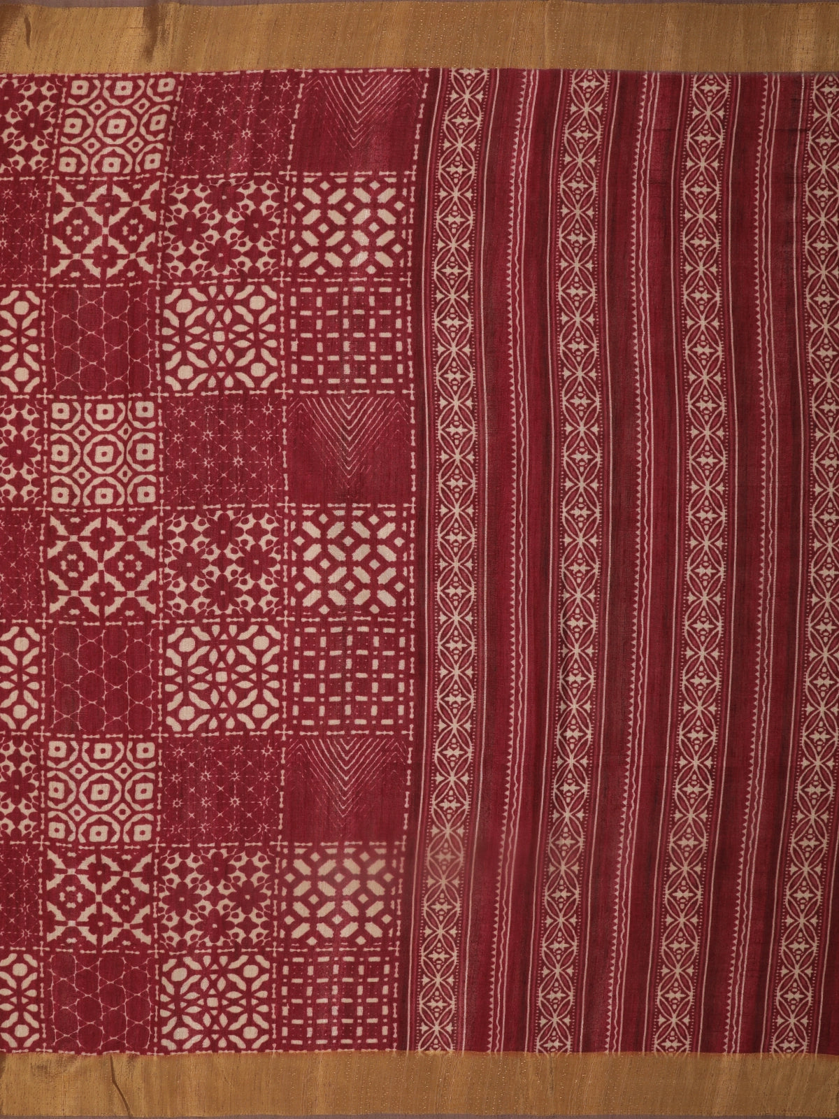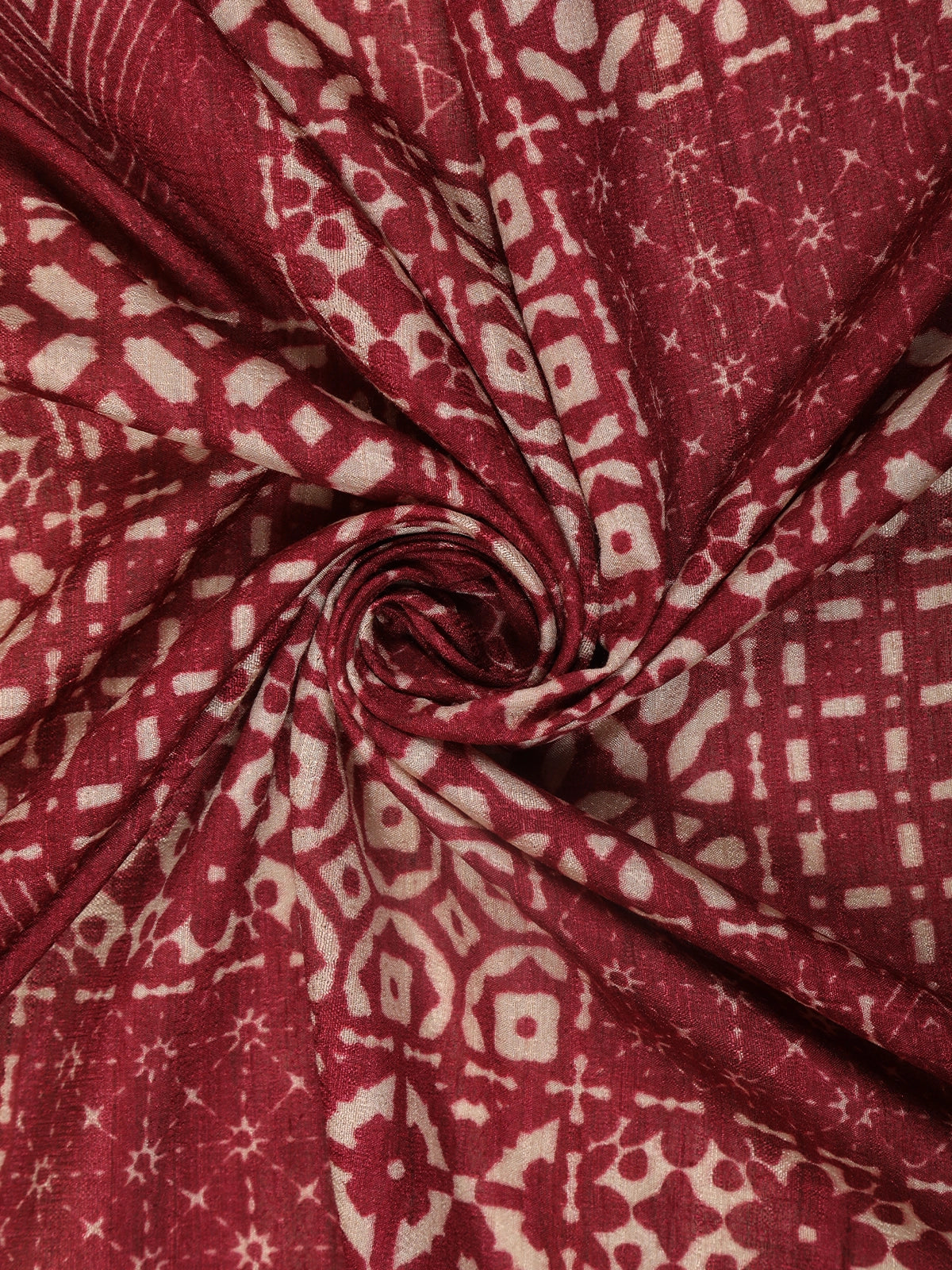 Exuding timeless elegance and traditional charm, this Deep Wine Maroon Tussar Saree is a striking blend of rich colour and classic design. The saree is adorned with intricate geometric motifs woven across the body in contrasting lighter tones, creating a bold yet balanced visual appeal that reflects heritage craftsmanship.