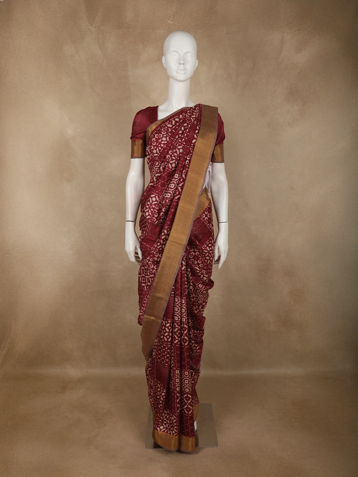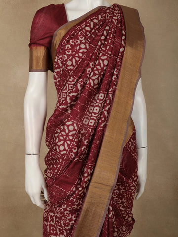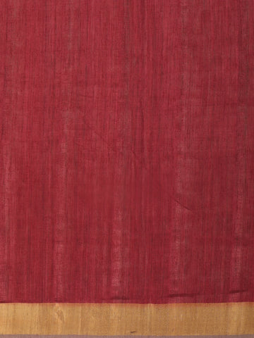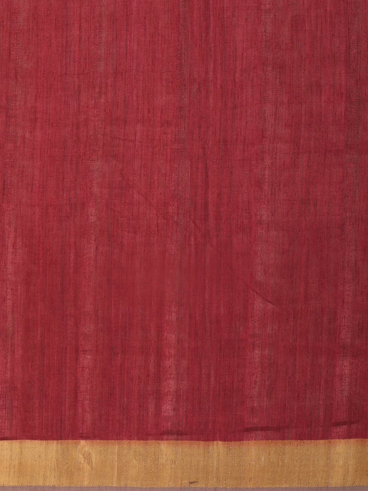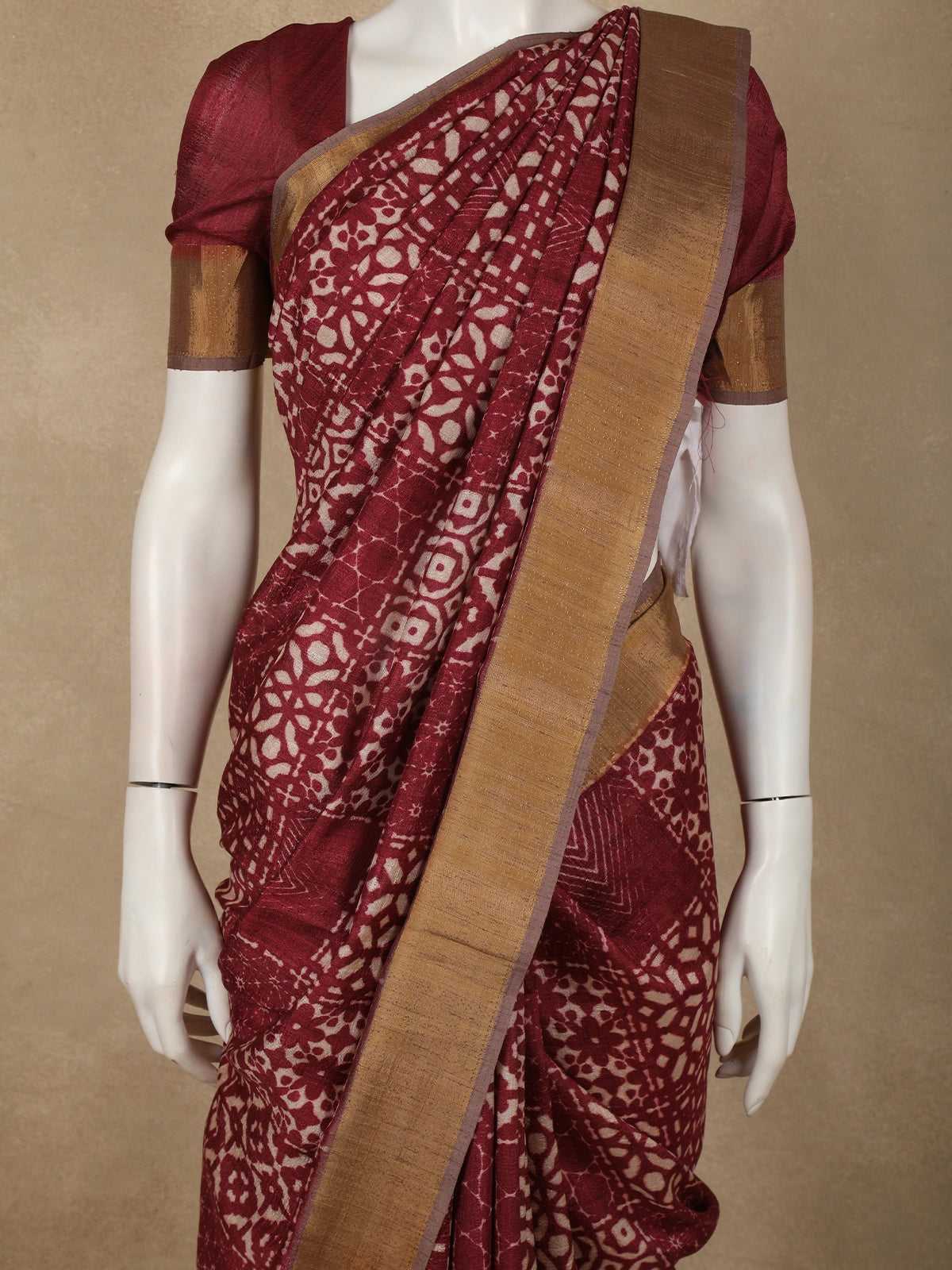 Crafted from authentic Tussar silk, the fabric features a natural texture and subtle sheen, offering a graceful drape with a refined finish. The deep wine maroon hue enhances the richness of the weave, making the saree a standout choice for special occasions.