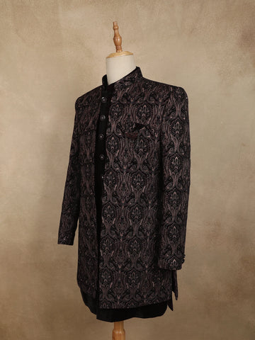 Tailored in a structured, elongated silhouette, this sherwani offers a sharp and flattering fit. The mandarin collar enhances its royal appeal, while the front button placket is adorned with statement metallic buttons that add a touch of sophistication. The sleek black inner layer provides a striking contrast, further elevating the overall ensemble.