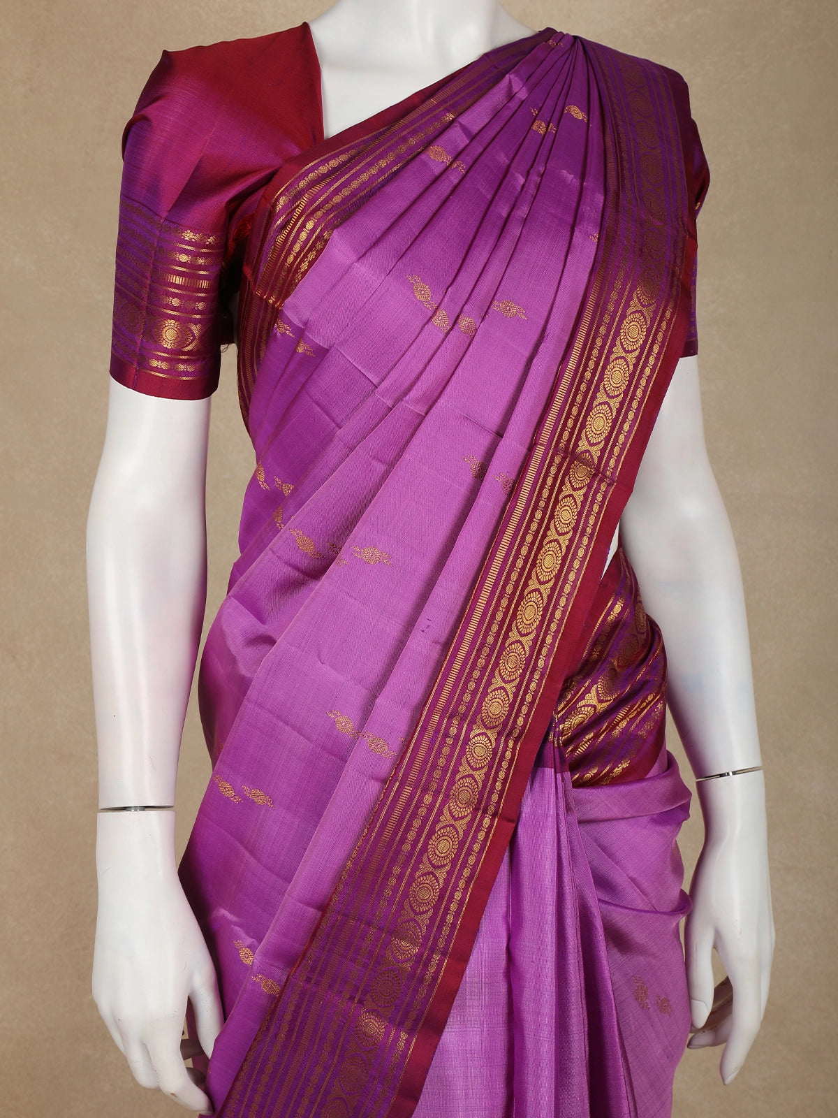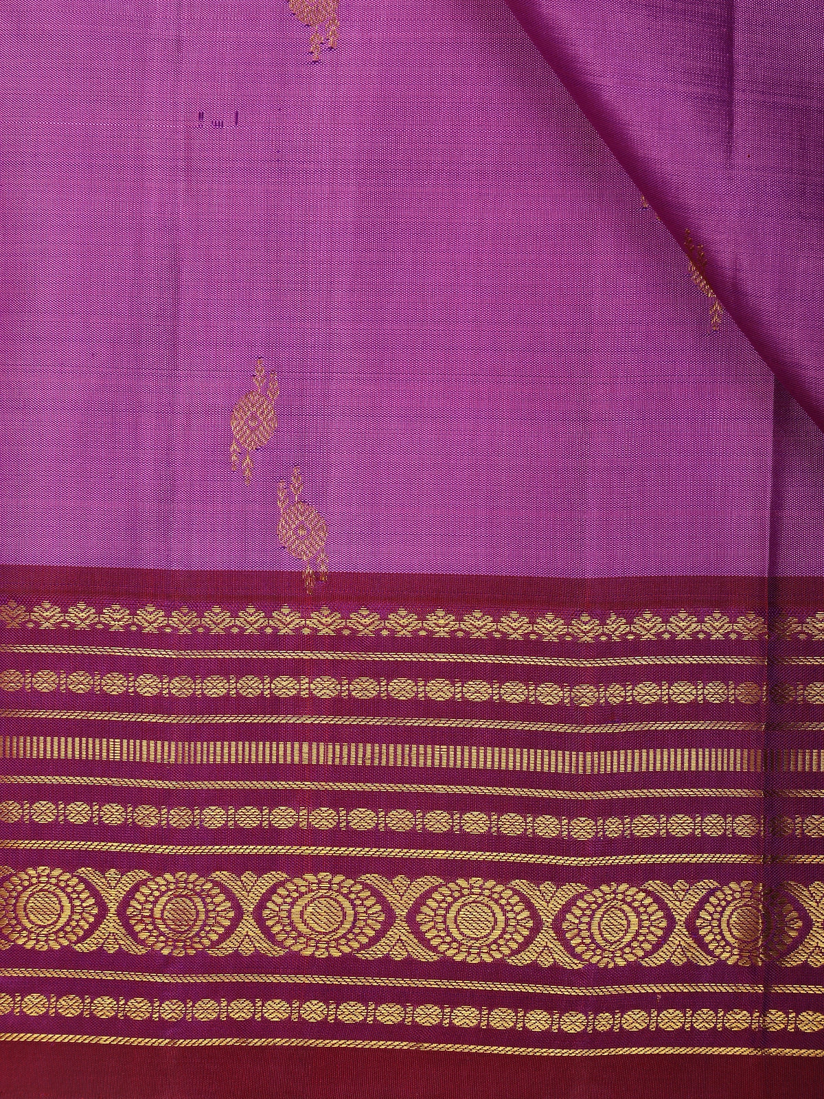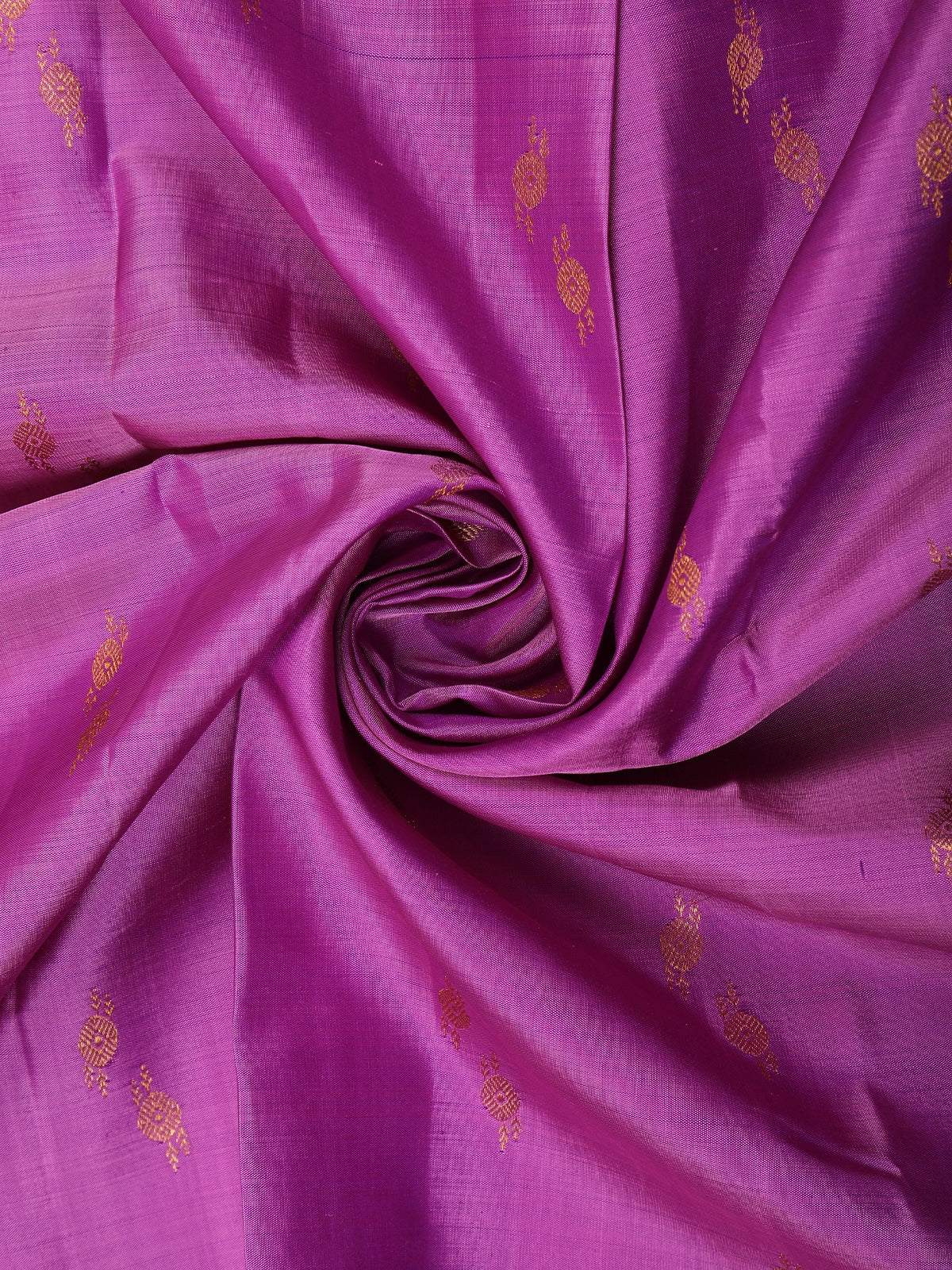 Elevate your ethnic wardrobe with this Deep Wine Purple Butta Woven Pure Kanchipuram Silk Saree, a timeless classic that reflects South Indian heritage and refined craftsmanship. The luxurious silk base is adorned with delicate gold zari butta motifs, gracefully woven across the body to create a subtle yet regal texture.