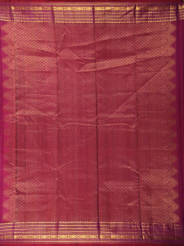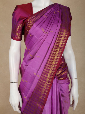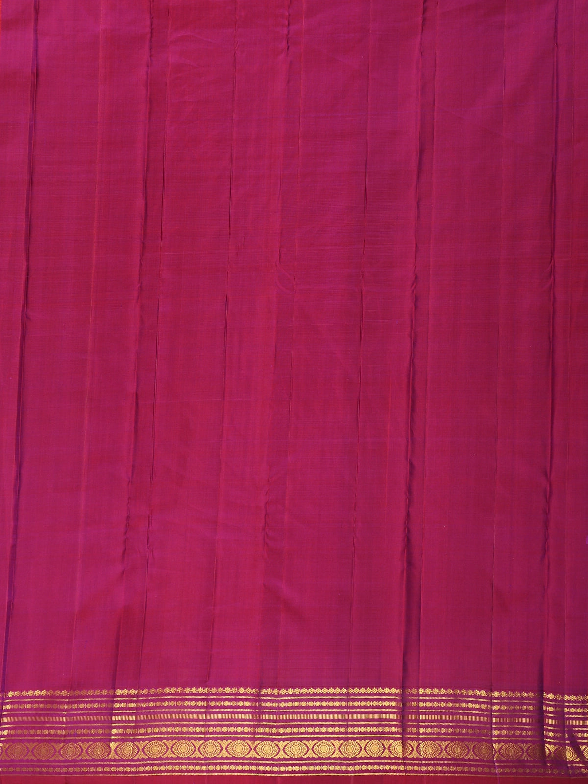 The saree is beautifully complemented by a contrast zari border, intricately detailed with traditional patterns that enhance its grandeur and lend a rich festive finish. The natural sheen of pure Kanchipuram silk adds depth to the deep wine purple hue, making it an elegant choice for weddings, temple ceremonies, and special celebrations.