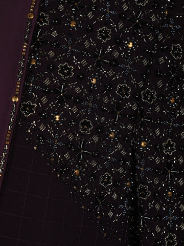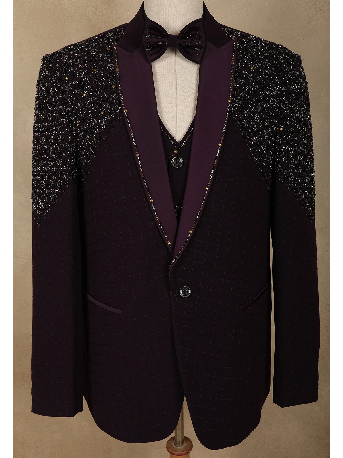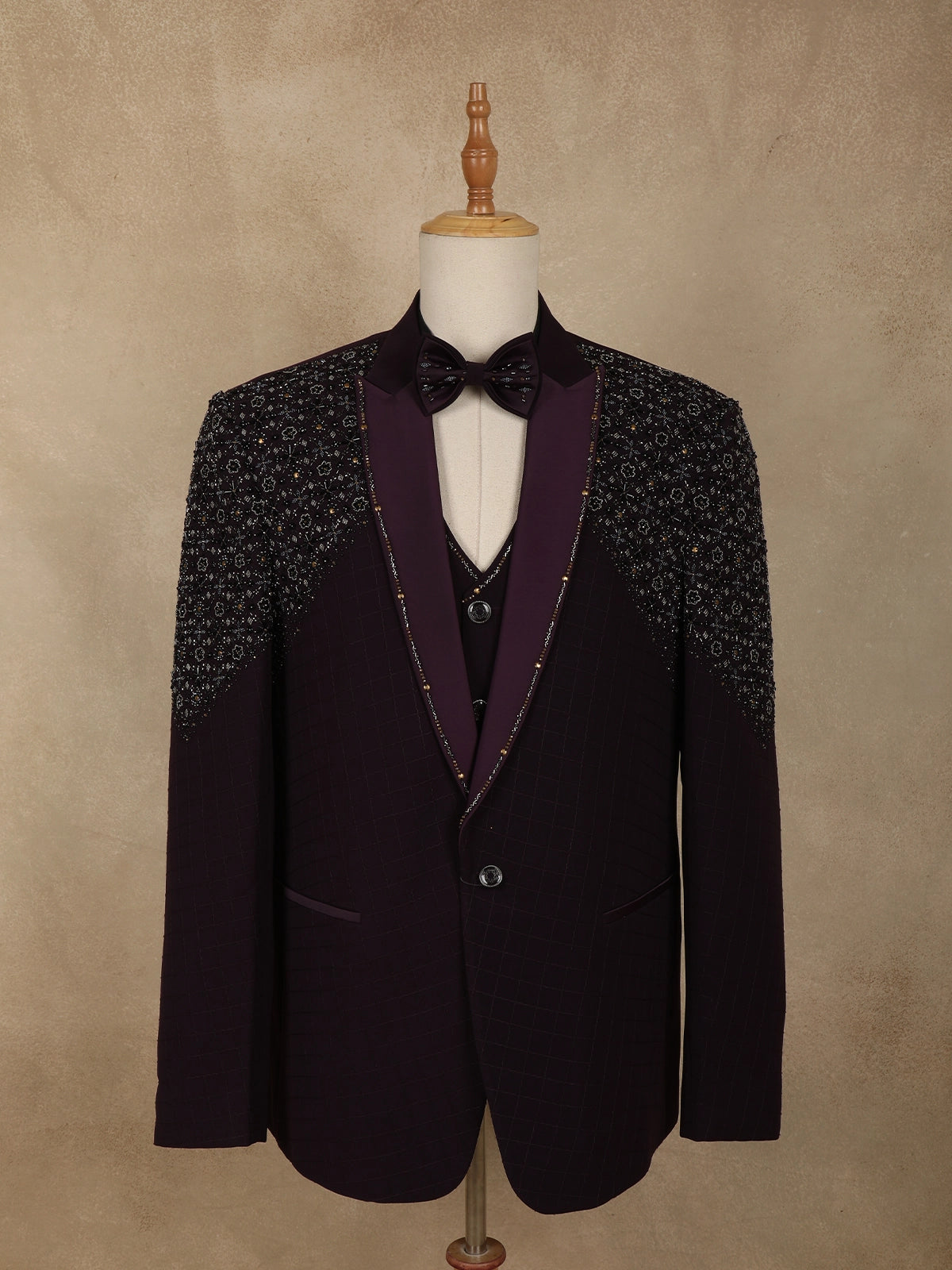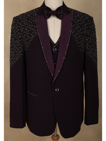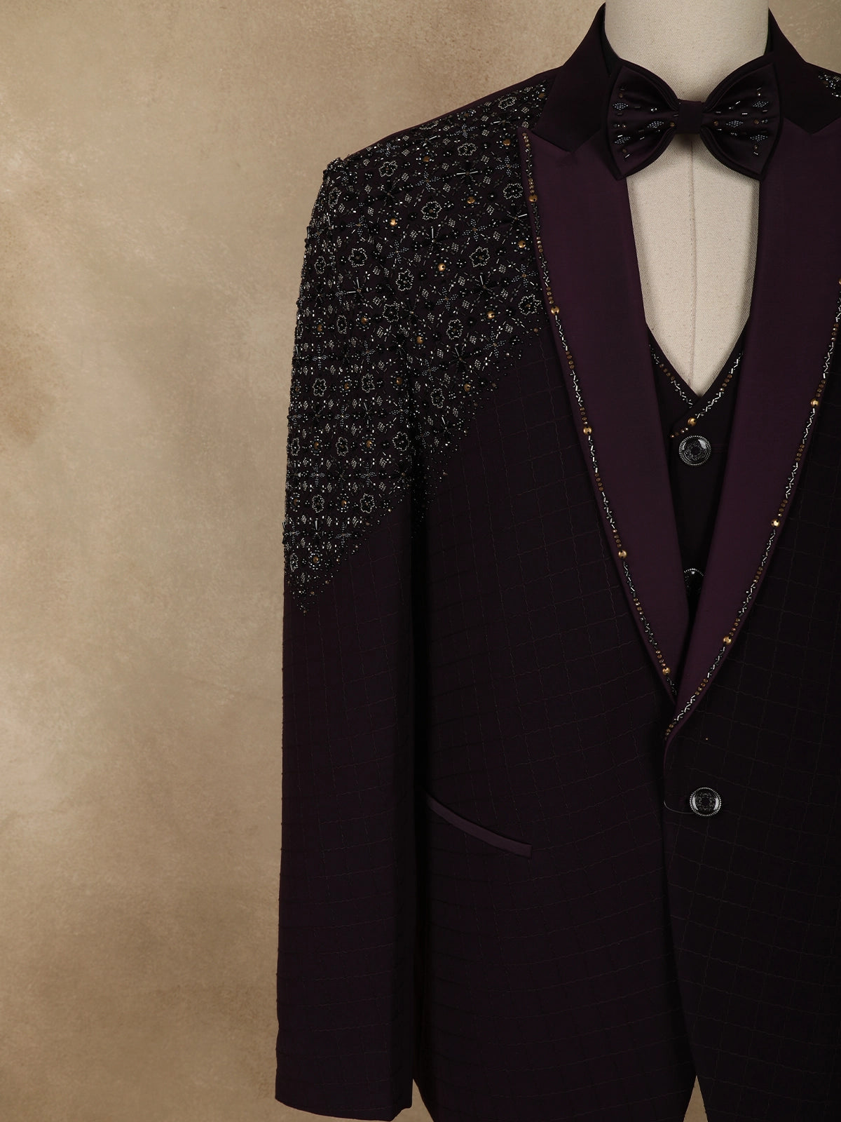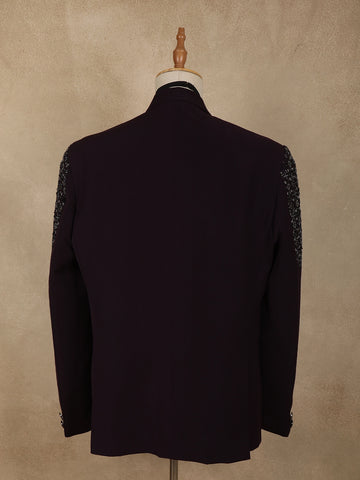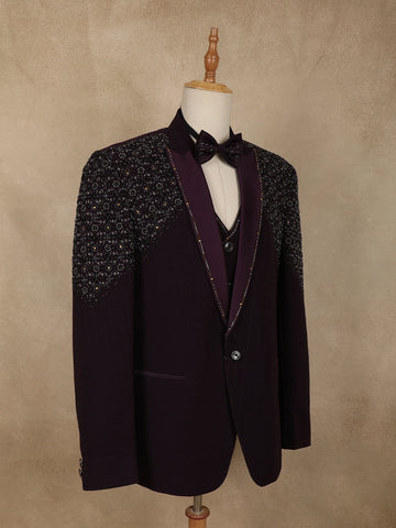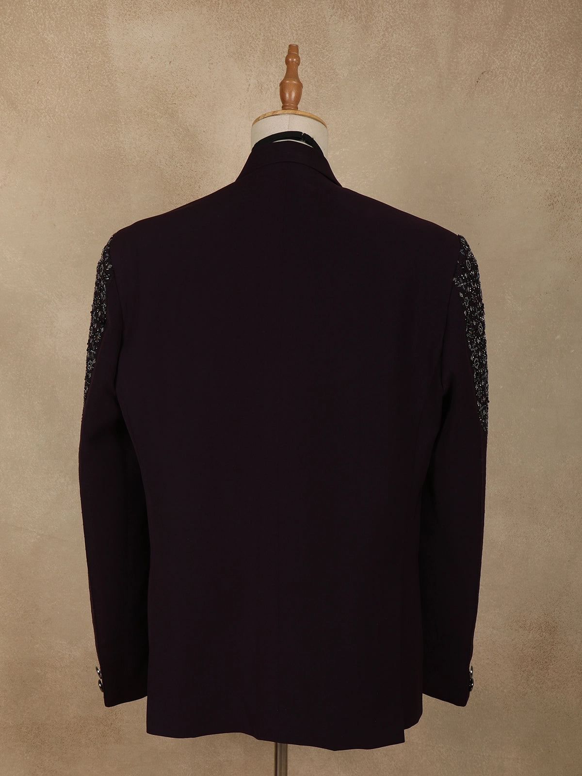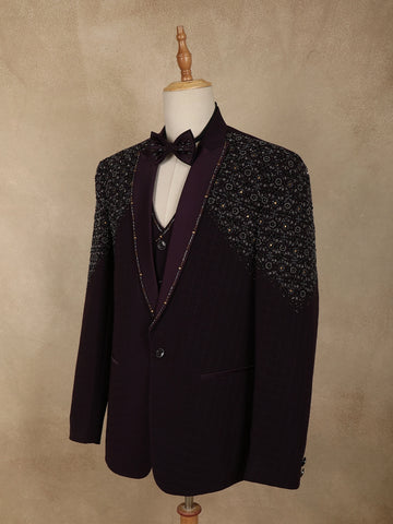 Deep Wine Purple Intricate Black Beads Embroidered Design Brocade Men's Suit