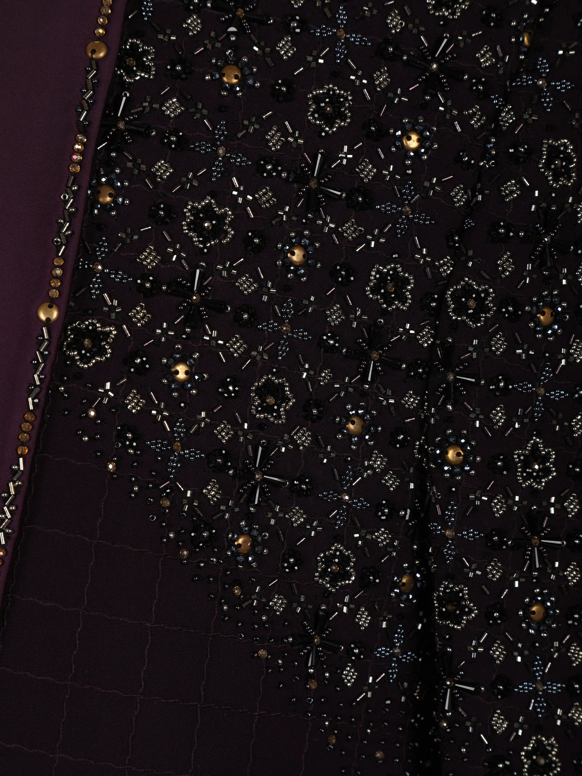 The highlight of this ensemble lies in the intricate black bead embroidery on the shoulders, meticulously detailed to create a regal, high-fashion appeal. Complementing this is the contrasting satin shawl lapel in a deep plum tone, which frames the silhouette beautifully and adds a polished, contemporary finish.