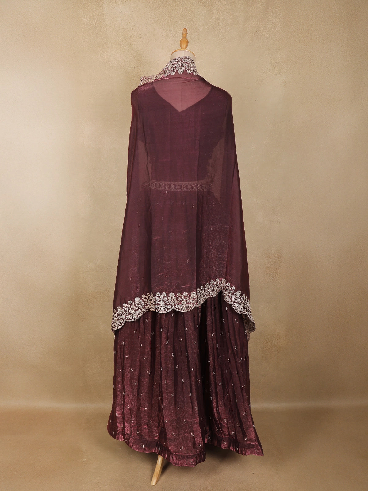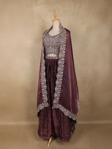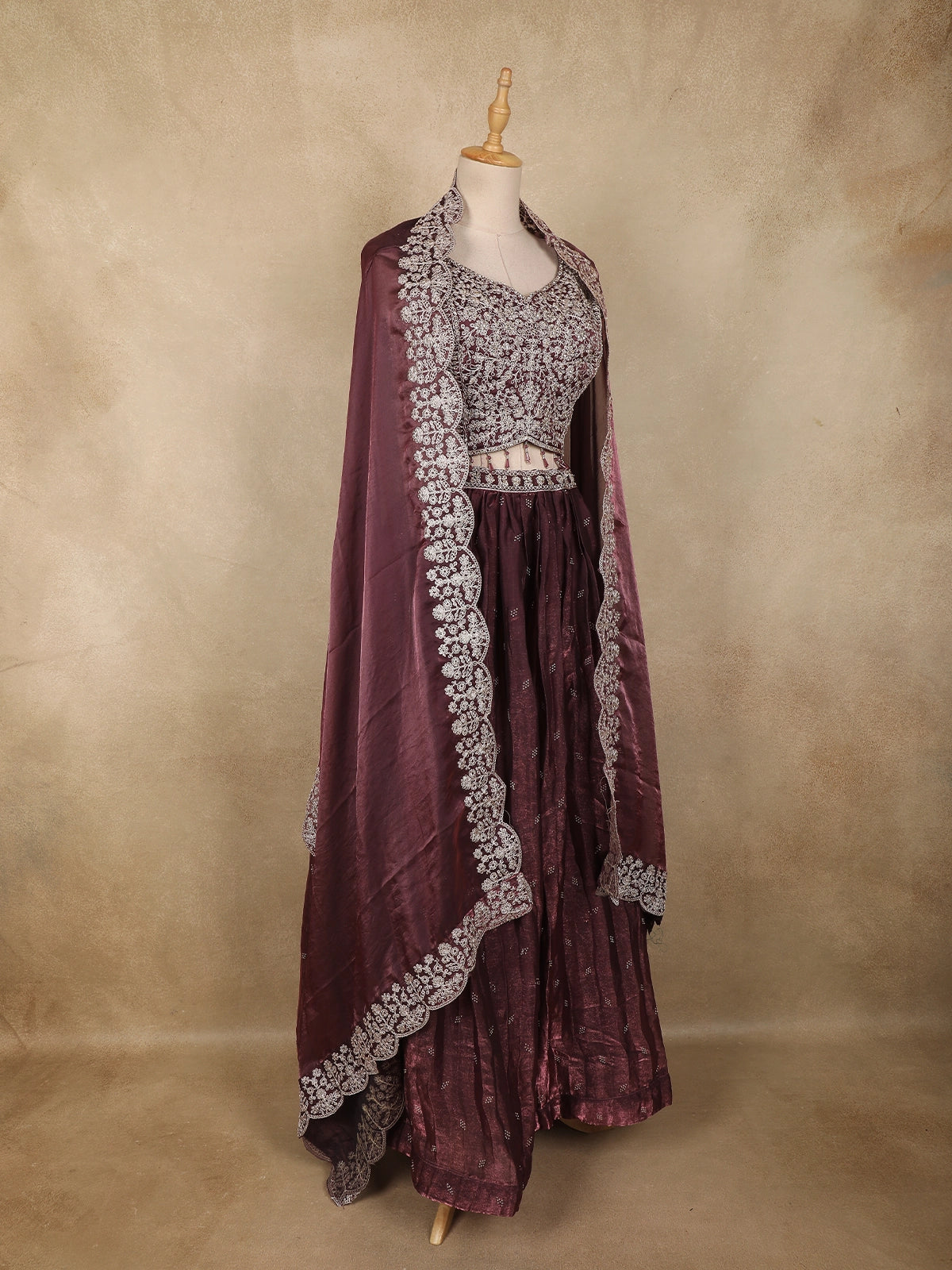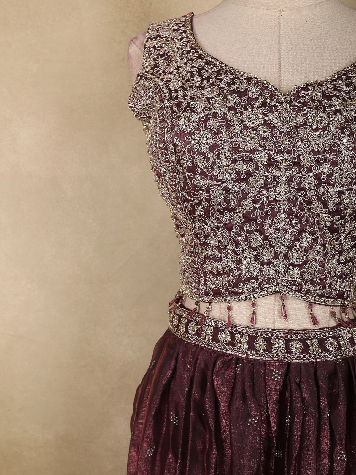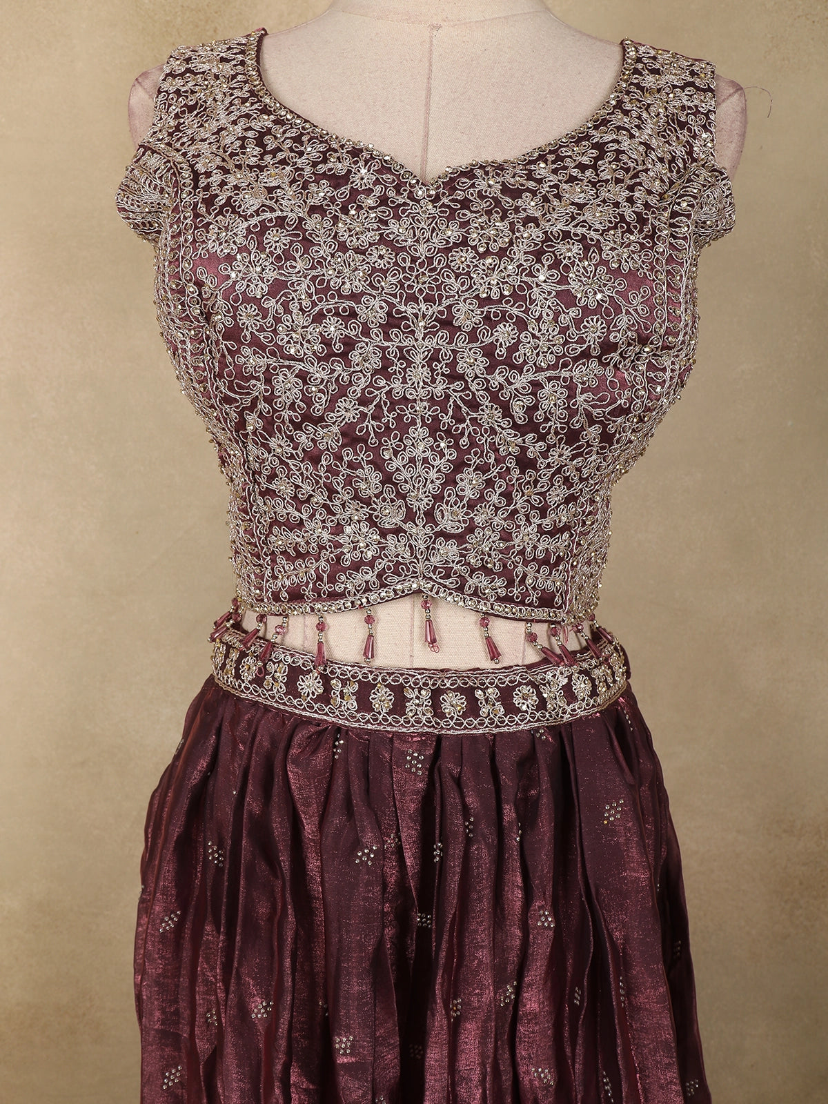 Deep Wine Sequins and Beads Embroidered Design Organza Bridesmaid Lehenga with Dupatta