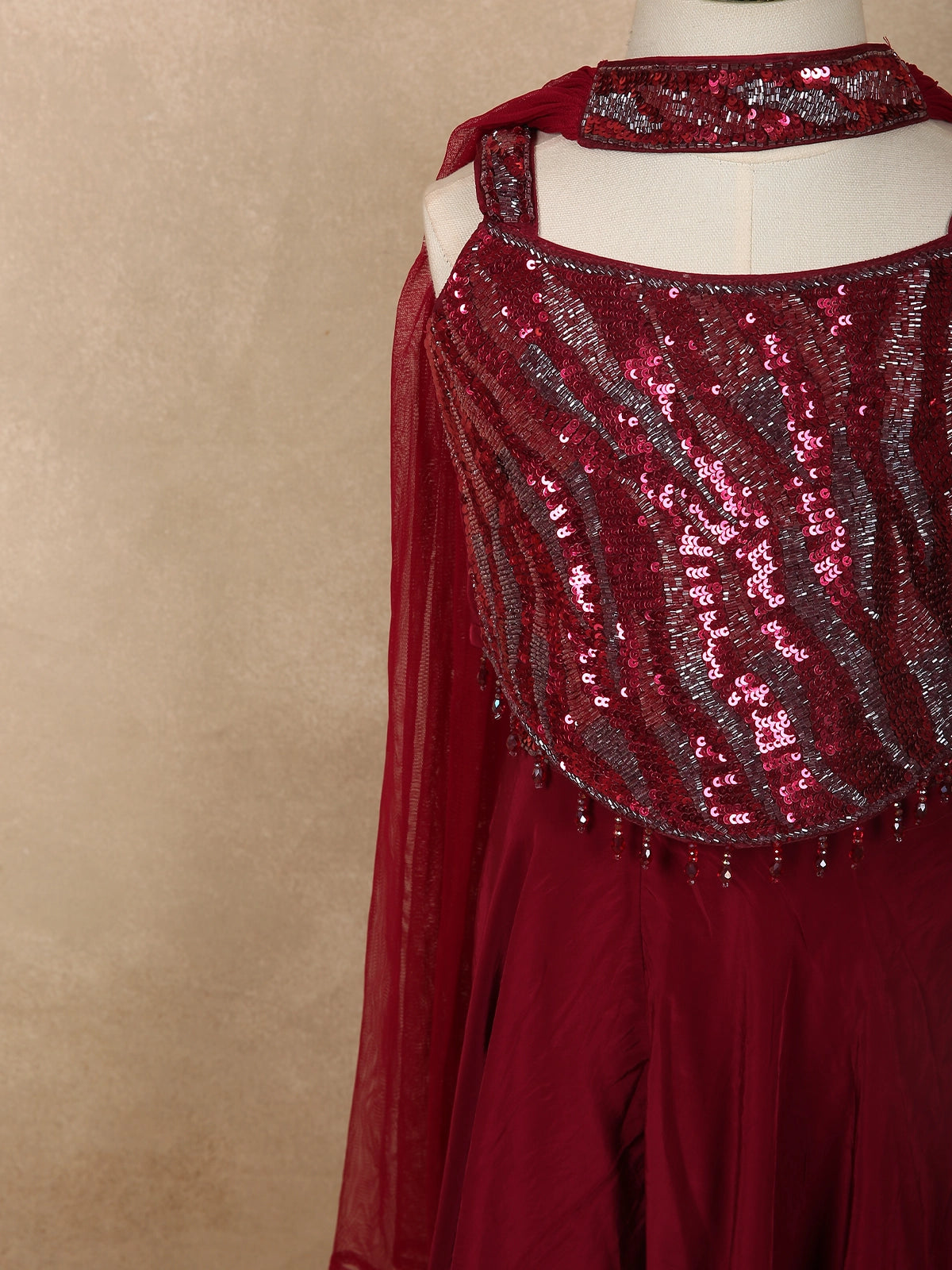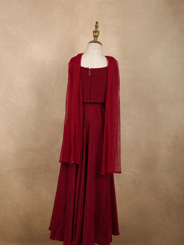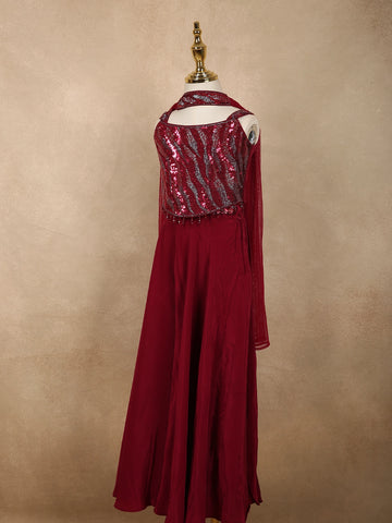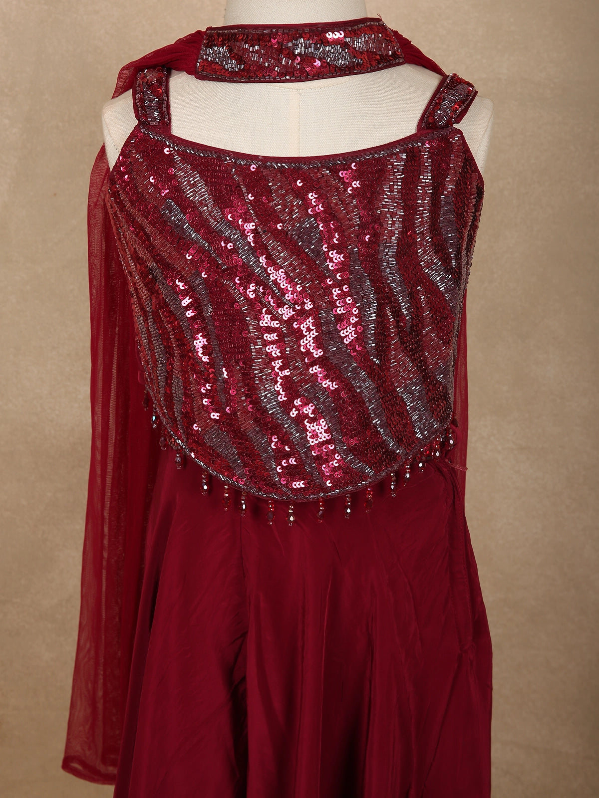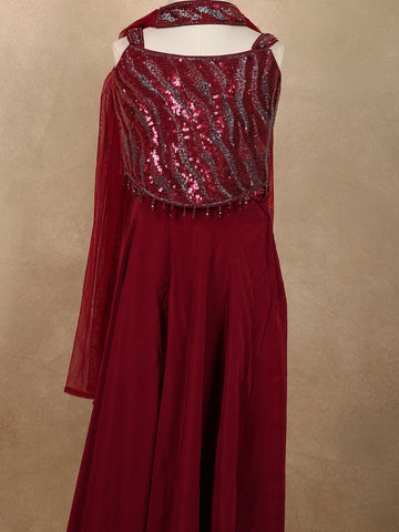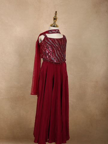 Deep Wine Sequins Design Satin Kids Palazzo Suit with Dupatta
