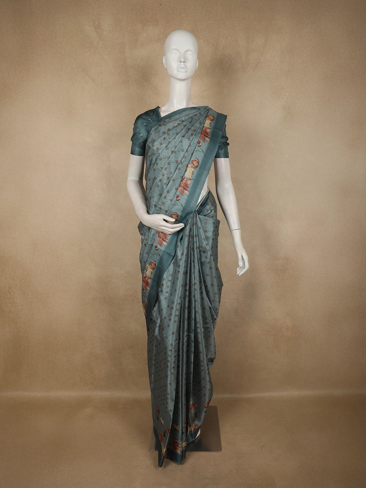 Enhancing the overall look is a coordinated floral printed border, designed to complement the body seamlessly while adding definition and elegance to the drape. The thoughtful placement of motifs and the harmonious color palette make the saree visually captivating yet subtle.