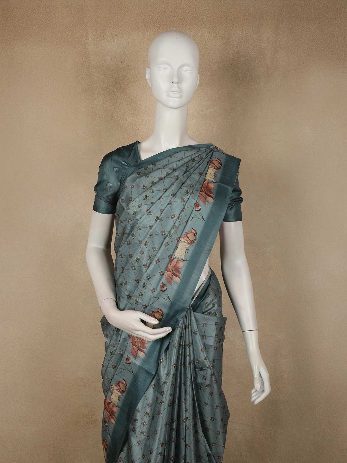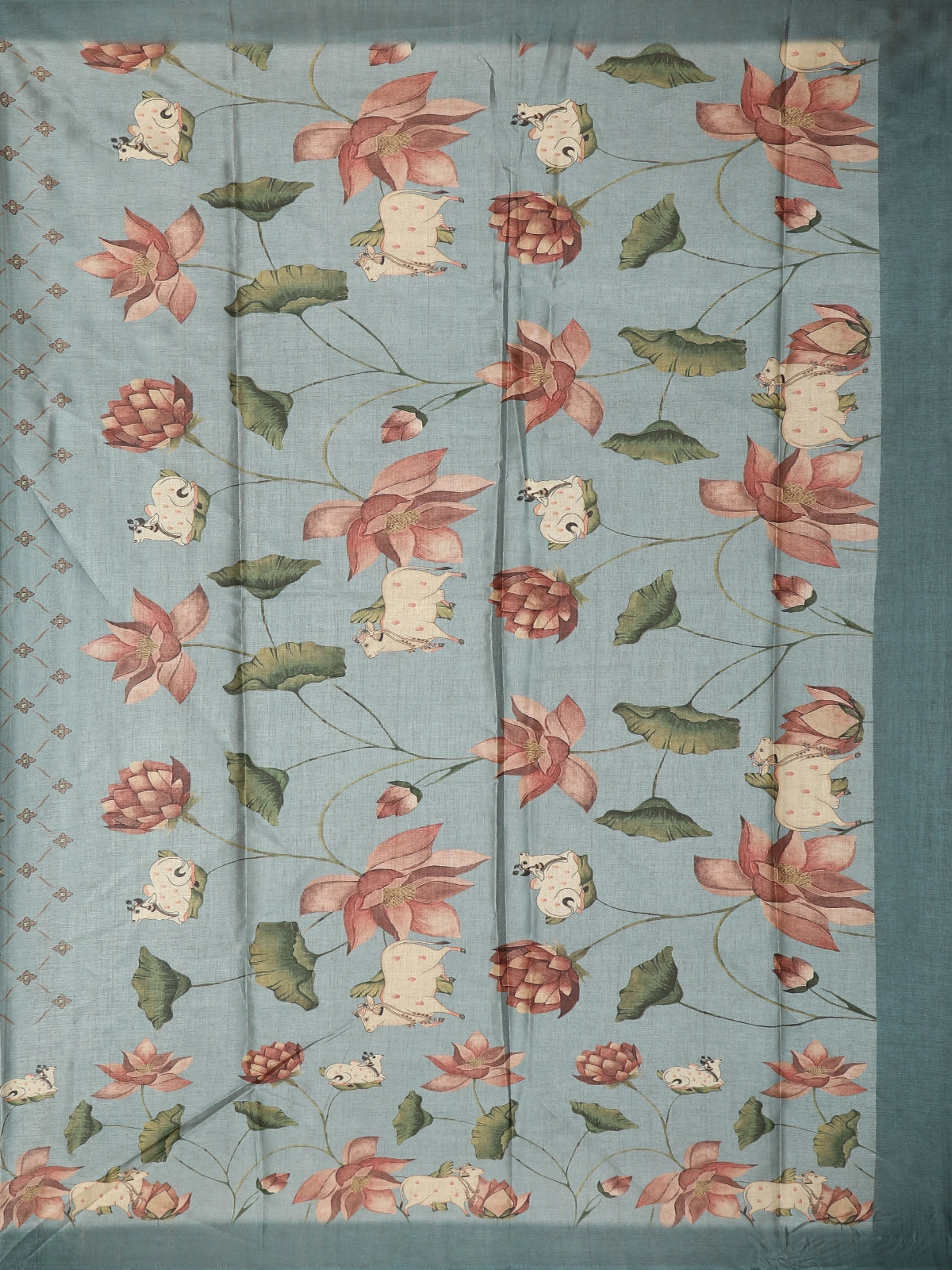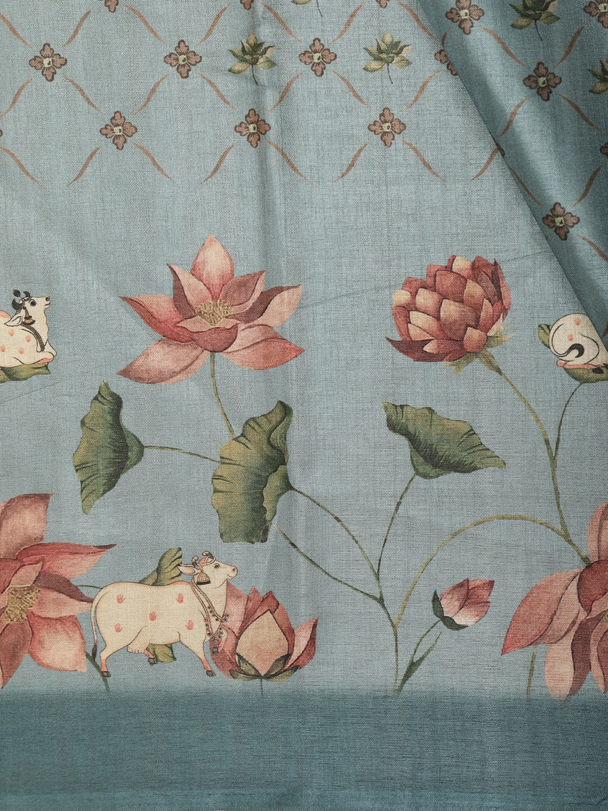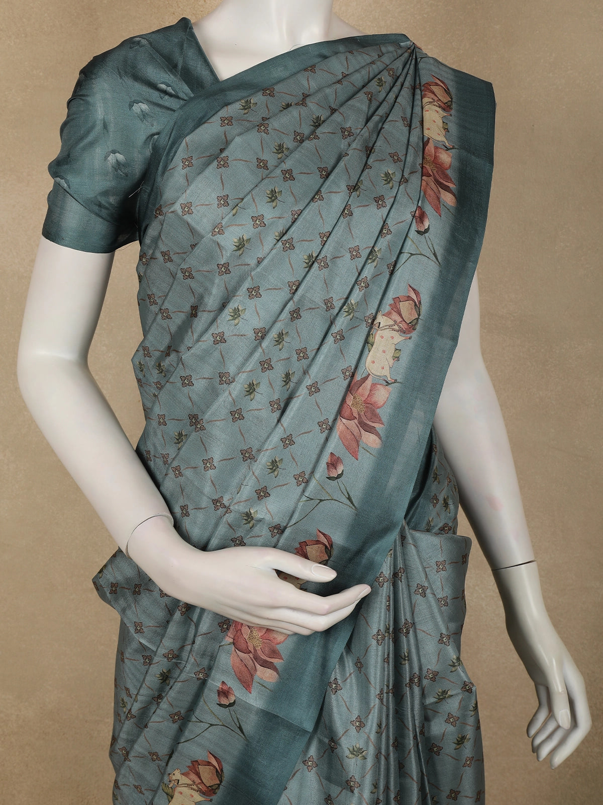 Crafted from semi tussar fabric, the saree carries a natural textured finish with a soft sheen, offering both comfort and visual richness. The body is adorned with beautifully printed floral motifs, inspired by hand-painted artistry, in warm tones of dusty rose, peach, muted coral, and soft olive green. These florals are delicately balanced with charming traditional cow motifs, adding a unique storytelling element rooted in heritage aesthetics.