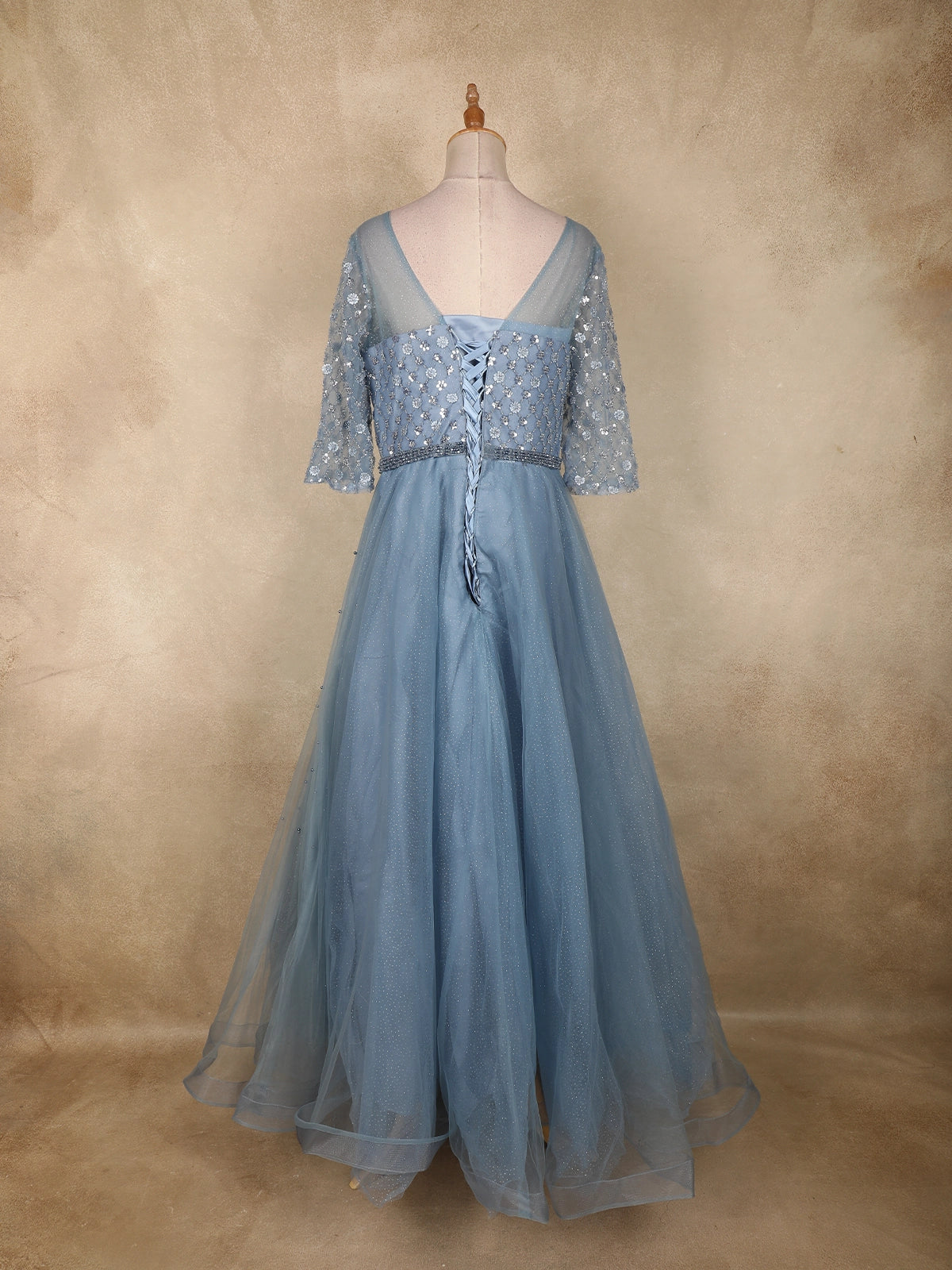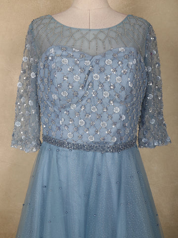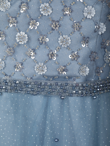 Embrace soft elegance with this beautifully crafted dusty blue designer gown, designed to exude grace and sophistication. Made from delicate net fabric, the gown features an intricately embellished bodice adorned with floral sequin embroidery and fine beadwork, creating a subtle shimmer that enhances its refined appeal.