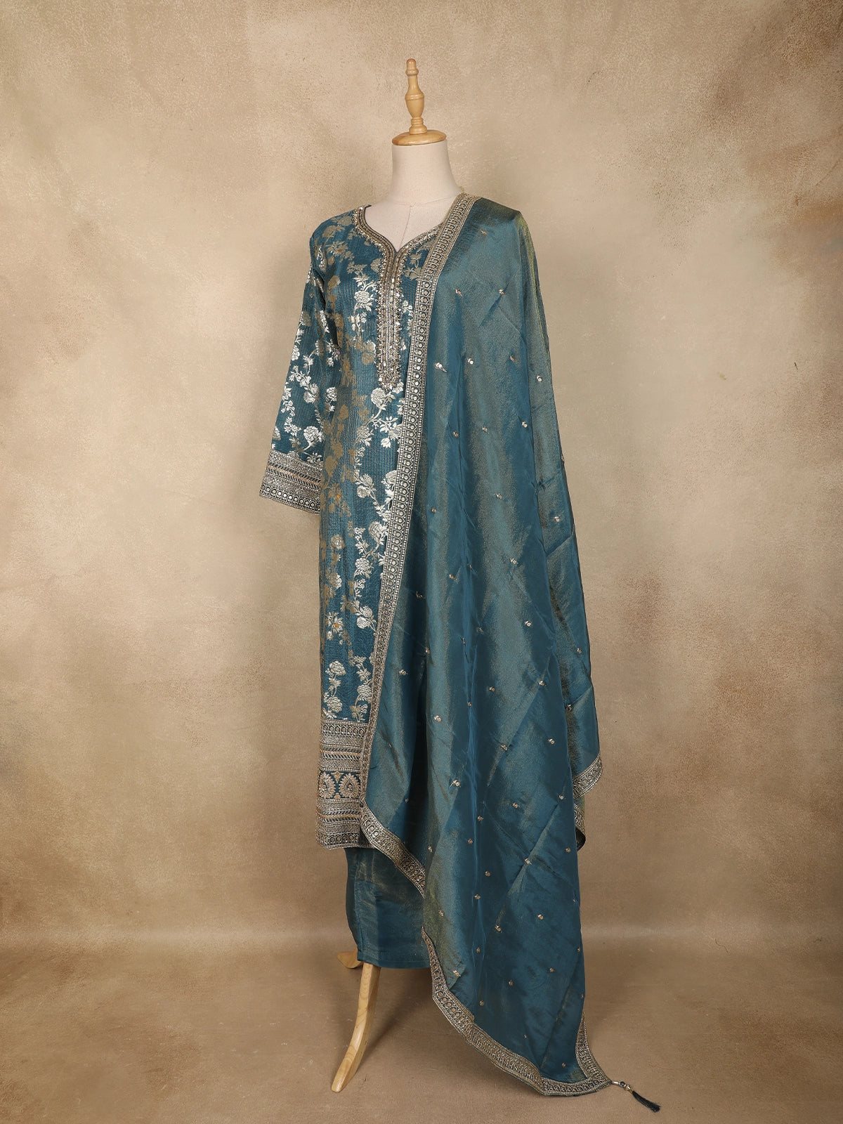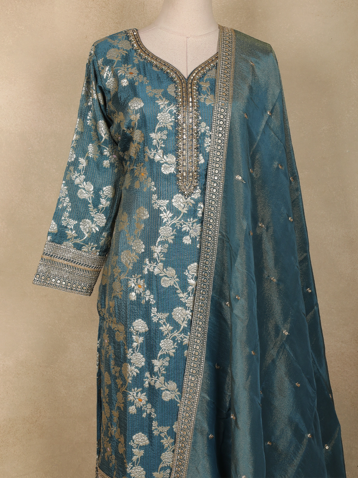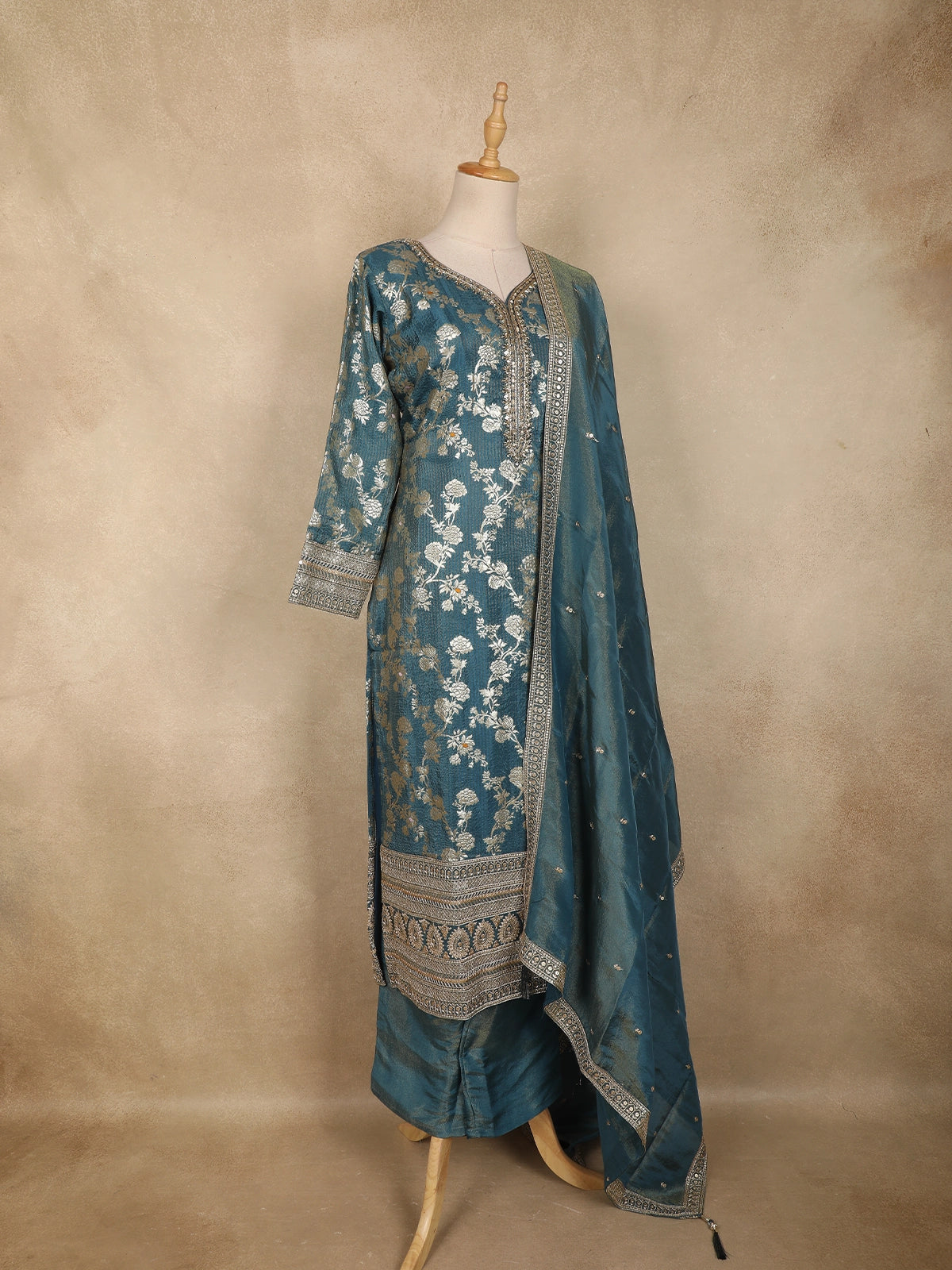 Exuding timeless elegance, this dusty blue Anarkali salwar suit is beautifully crafted in luxurious Banarasi silk, showcasing exquisite floral zari woven detailing throughout the kurta. The rich texture of the fabric combined with intricate metallic motifs lends a regal charm, making it a standout ensemble for special occasions. The delicately designed V-neckline with ornate zari borders adds a refined traditional touch, perfectly complementing the overall silhouette.
