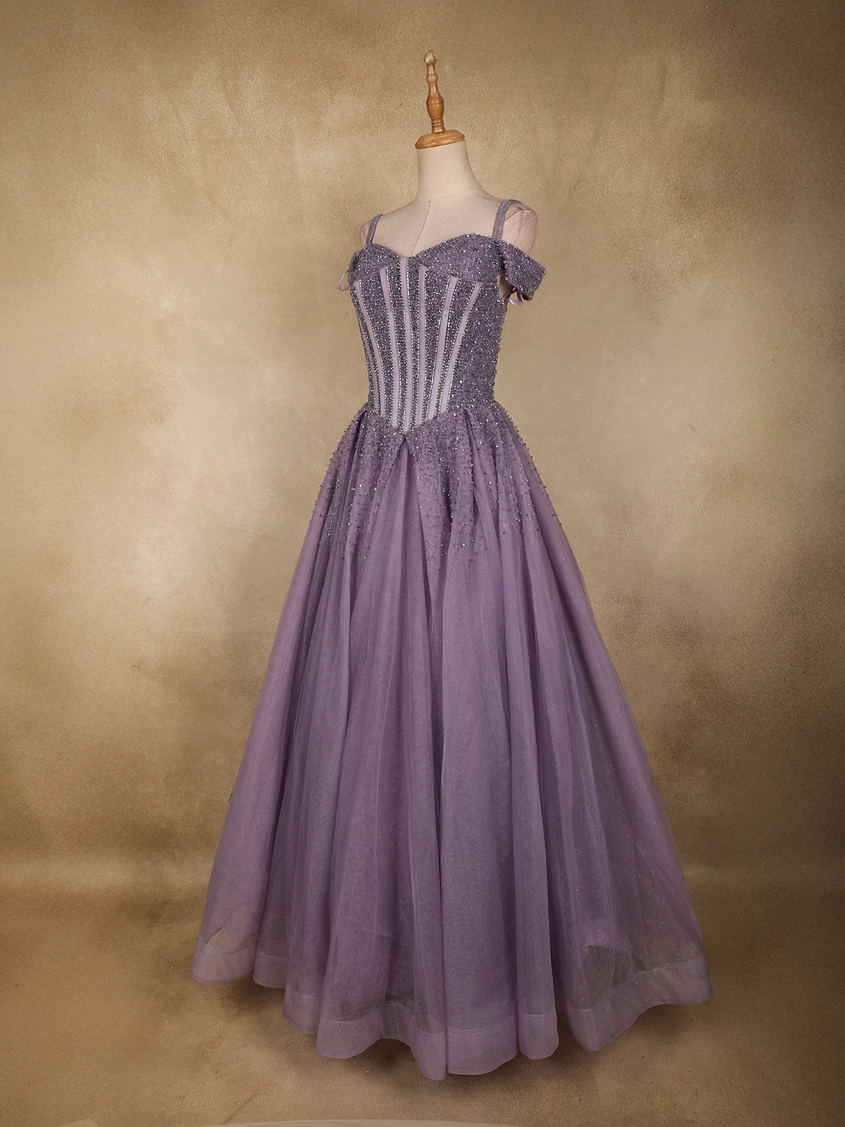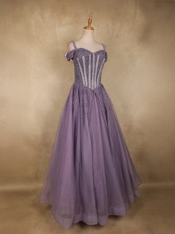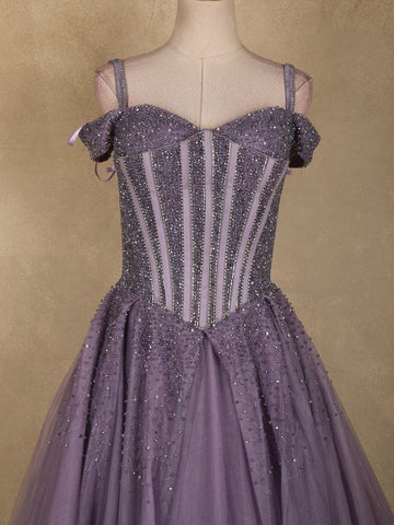 Dusty Lavender Sequins and Beads Embellished Design Net Ball Gown with Cold Shoulder Straps