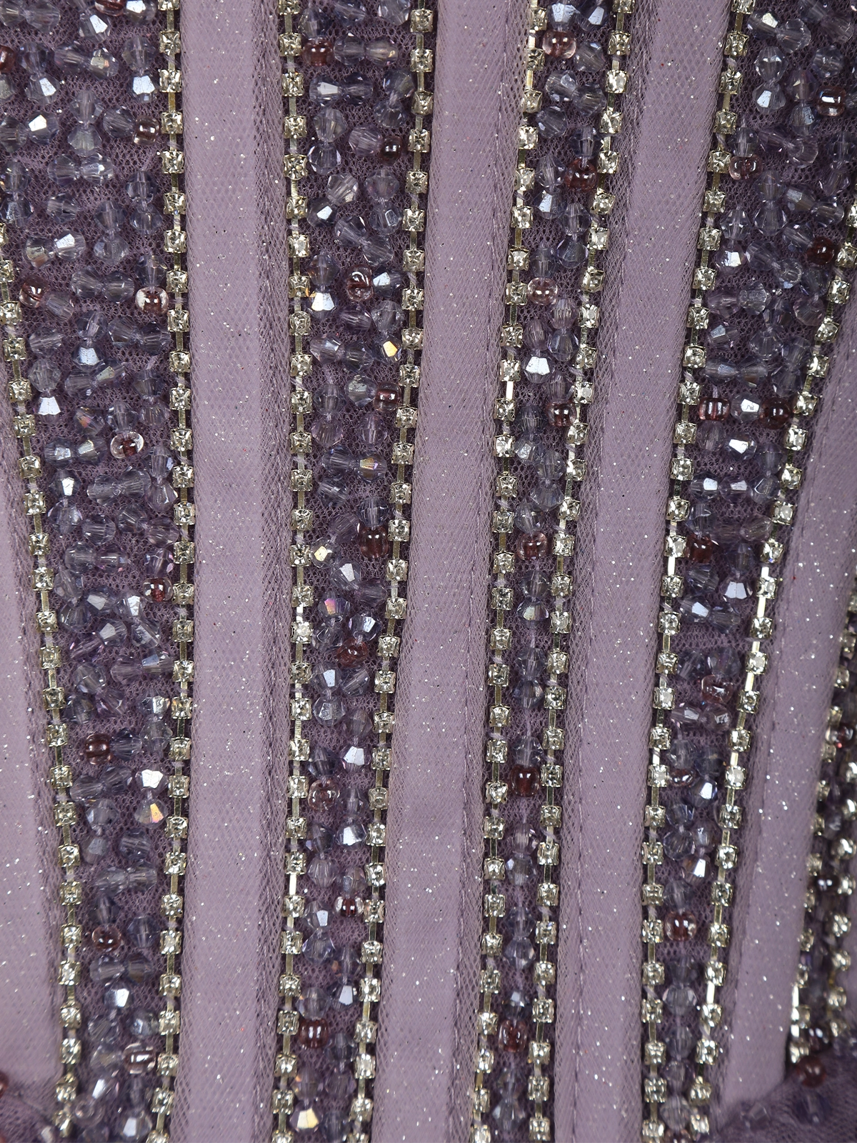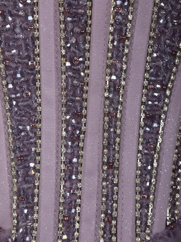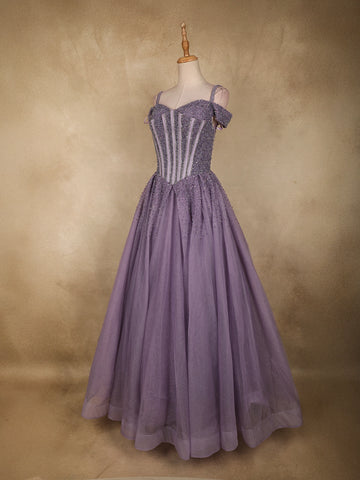 Step into a fairytale moment with this Dusty Lavender net ball gown, designed to captivate with its soft elegance and glamorous detailing. Crafted in airy net fabric, the gown features intricate sequins and bead embellishments that shimmer gracefully with every movement. The beautifully structured corset-style bodice is enhanced with vertical embellished panels, offering a flattering silhouette while adding a couture finish.