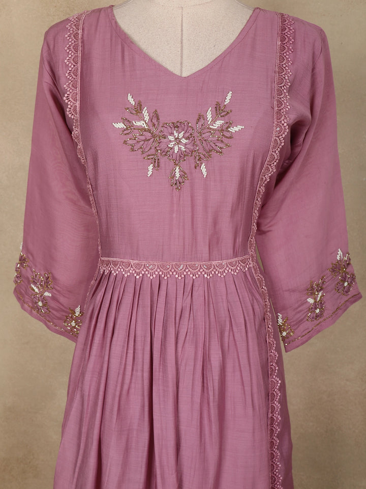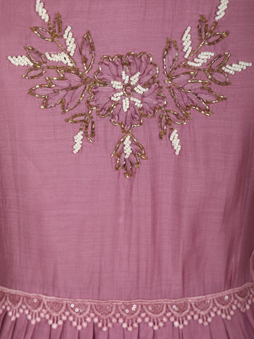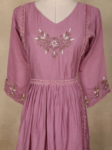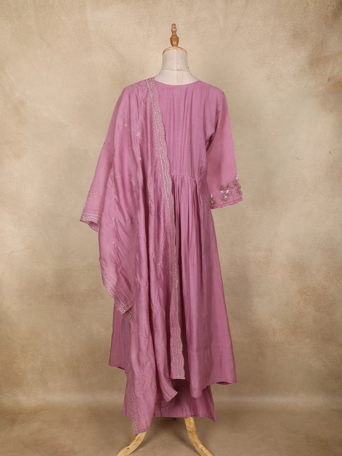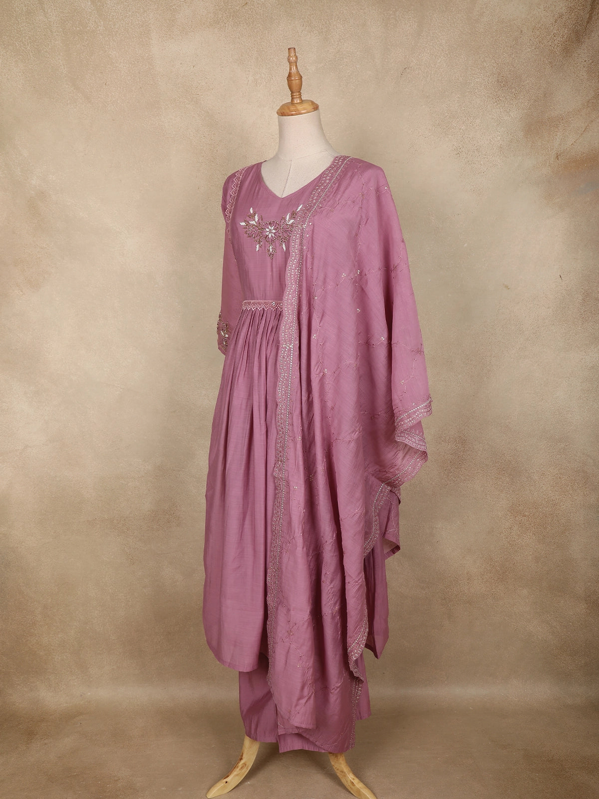 Dusty Mauve Floral Embroidered Cotton Anarkali Salwar Suit with Dupatta