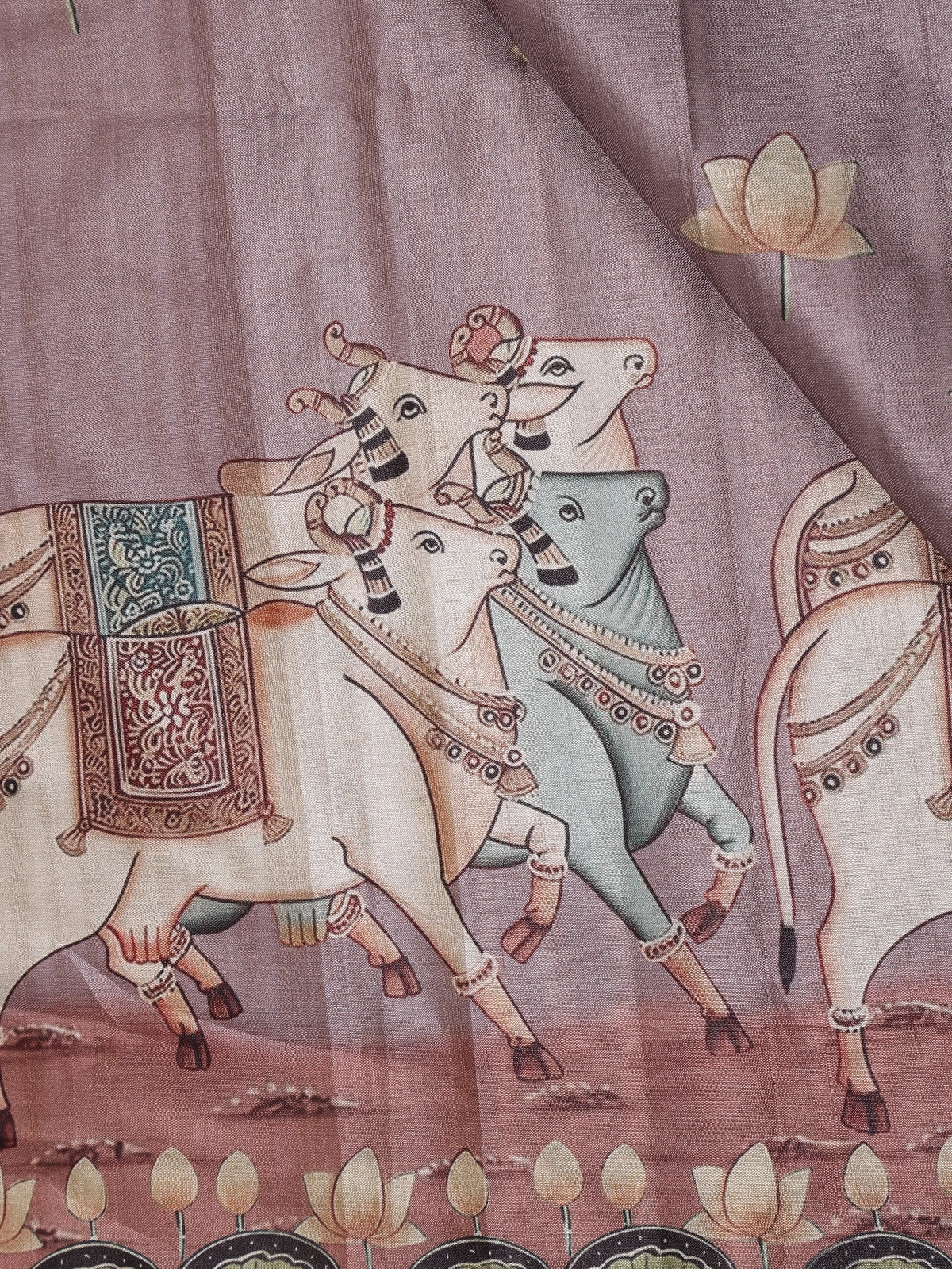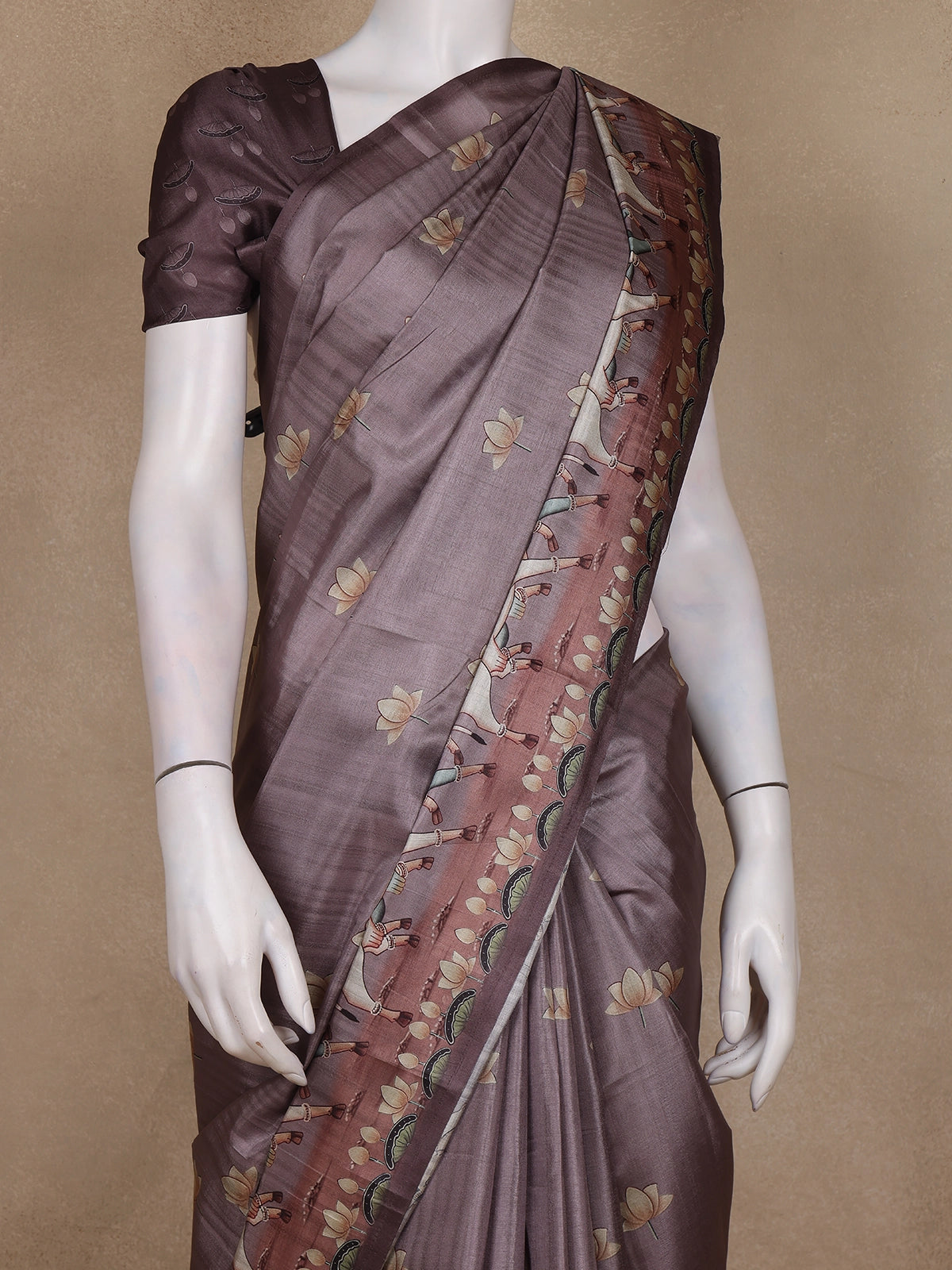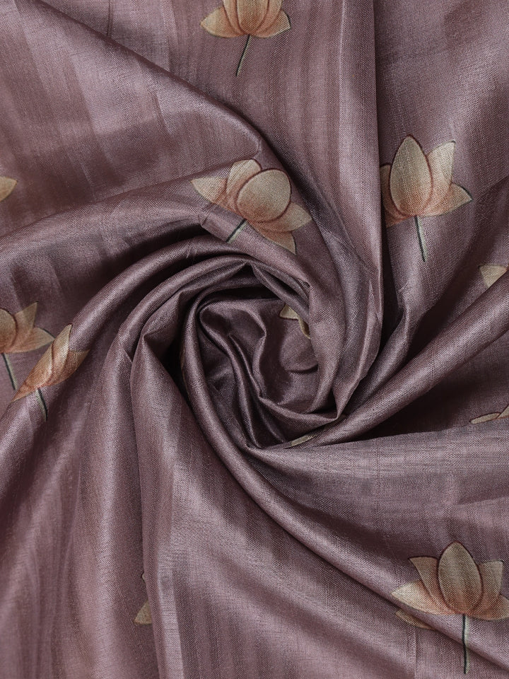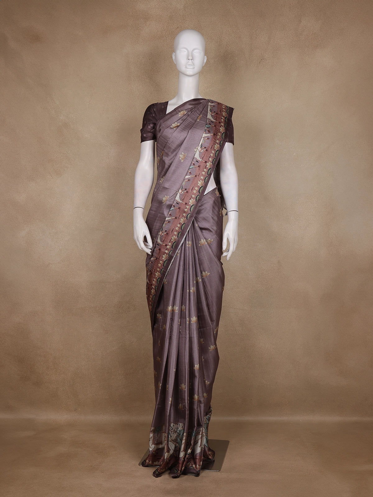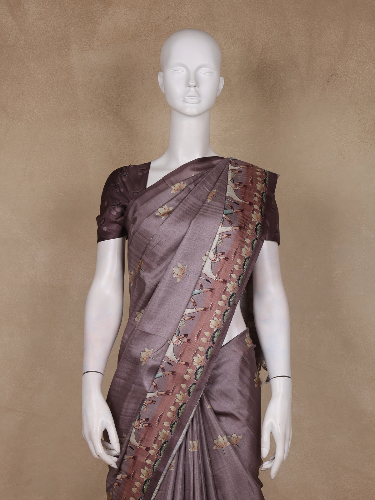 Dusty Mauve Floral Printed Design Tussar Saree with Contrast Border