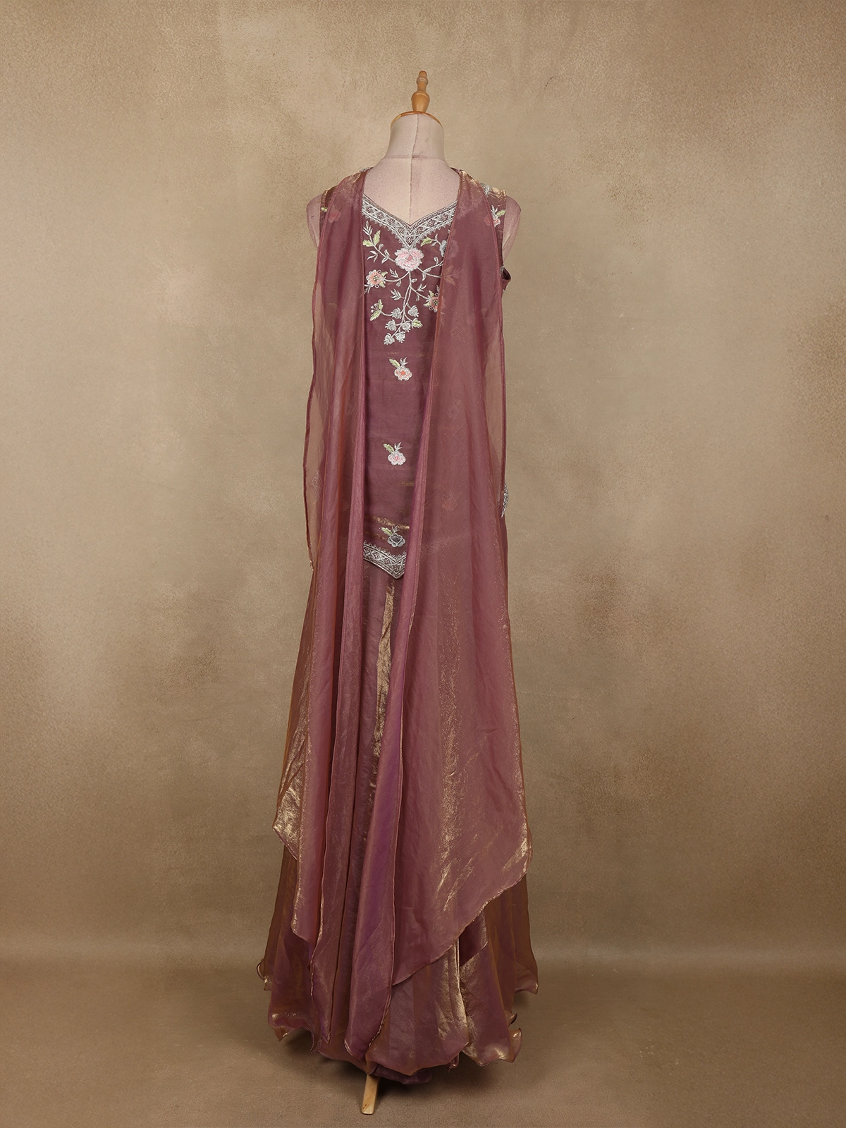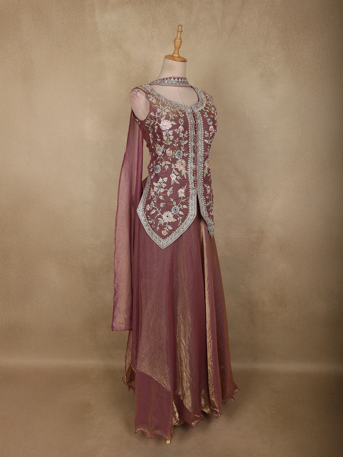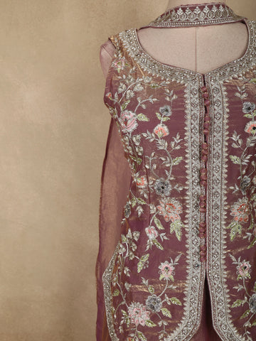 Dusty Mauve Purple Thread Embroidered Design Organza Lehenga with Dupatta