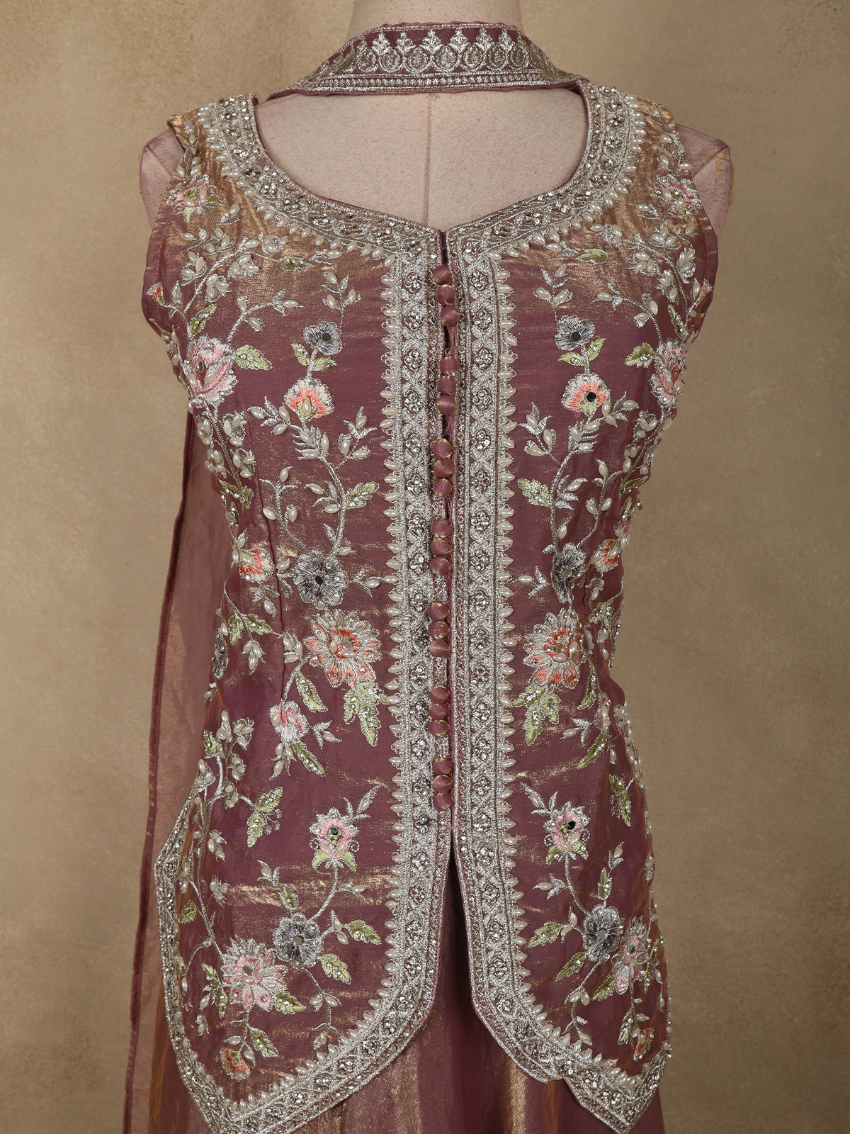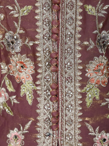 Exude understated elegance with this Dusty Mauve Purple Floral Thread Embroidered Design Organza Lehenga with Dupatta, a graceful ensemble crafted for refined festive and wedding occasions. The beautifully tailored blouse features intricate floral thread embroidery, delicately highlighted with subtle embellishments that add depth and artisanal charm. The soft olive green hue lends a calm, sophisticated appeal, perfect for day and evening celebrations.