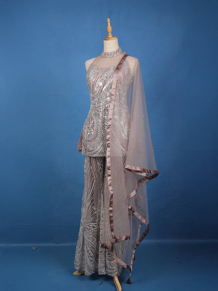 Dusty Mauve Sequins Embroidered Net Palazzo Suit With Dupatta