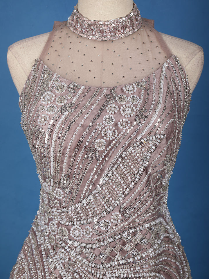 Radiate sophistication and allure with this Dusty Mauve Sequins Embroidered Net Palazzo Suit, a stunning ensemble that seamlessly blends modern charm with traditional finesse. Crafted from luxurious net fabric, this outfit is adorned with intricate sequin and bead embroidery arranged in graceful patterns that shimmer beautifully under the light.