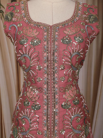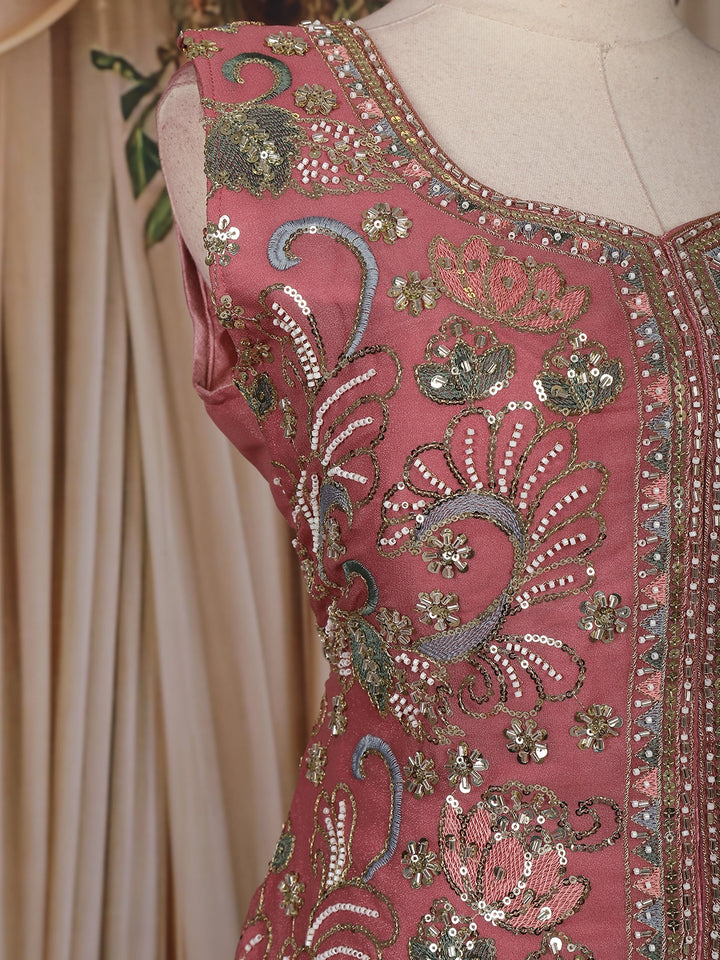 Grace your festive and party occasions with the captivating charm of this Dusty Pink Mirror Embroidered Georgette Palazzo Suit with Dupatta. Designed to exude elegance, this sleeveless ensemble features a square neckline and an intricately embroidered floral pattern enhanced with shimmering mirror work, adding a radiant festive sparkle to its soft pink tone.