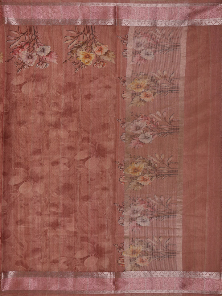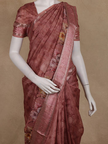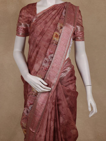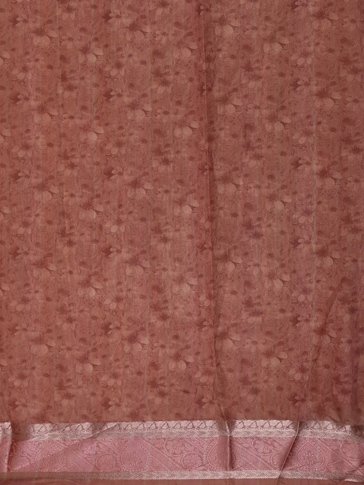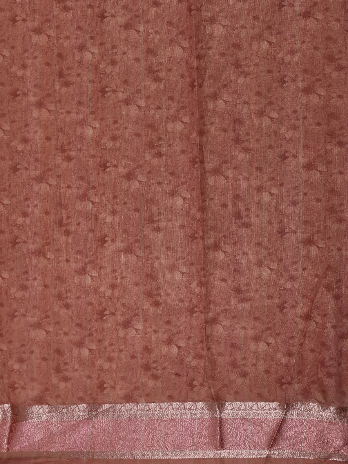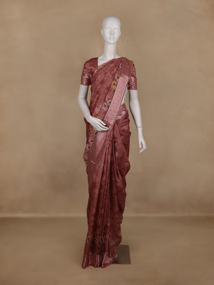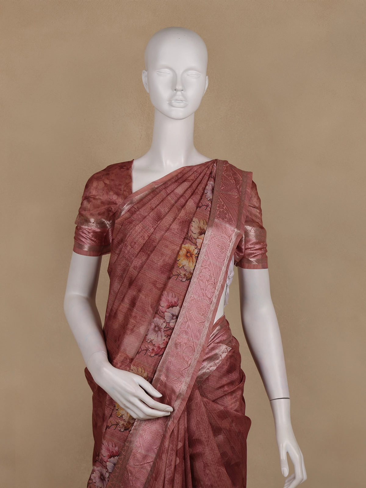 The soft dusty pink base is adorned with delicate floral prints, evoking the charm of hand-painted artistry. A matching pallu and blouse enhance the saree’s graceful continuity, while the golden zari border adds a hint of shimmer, elevating it from everyday elegance to festive finesse.