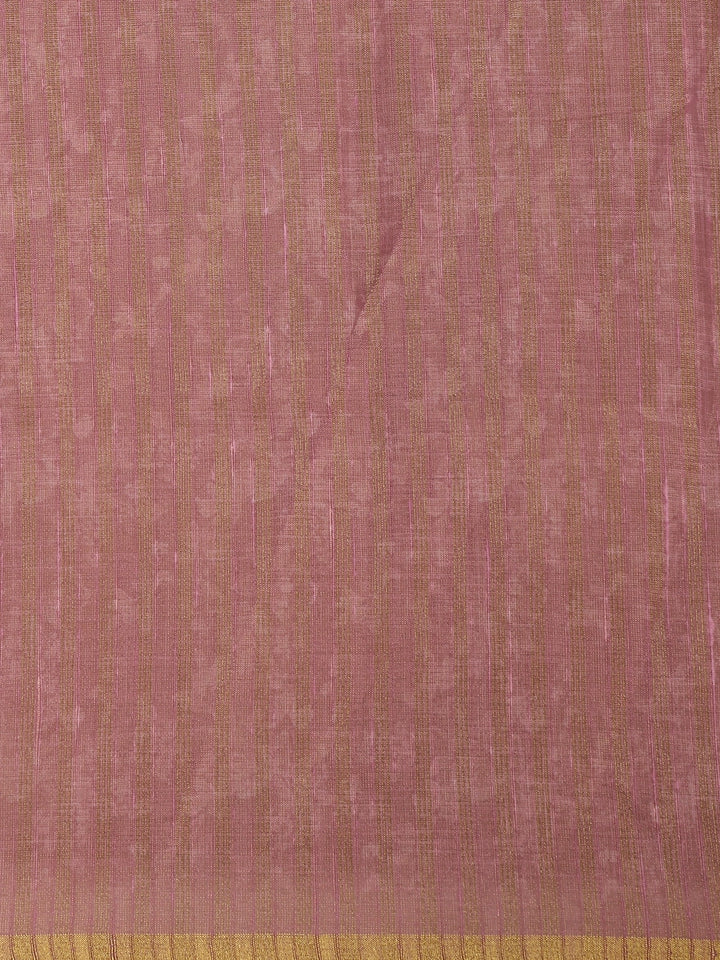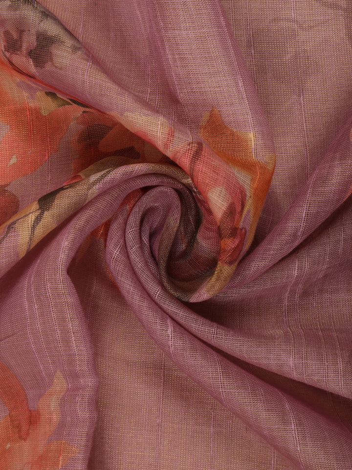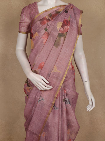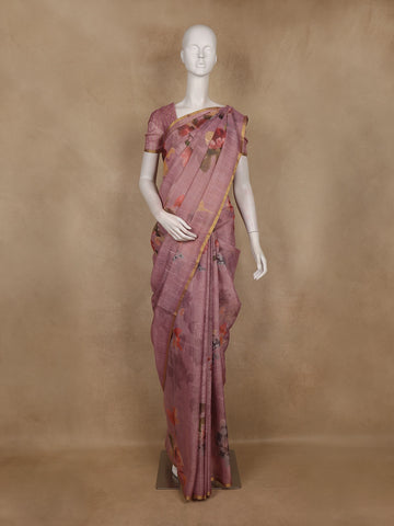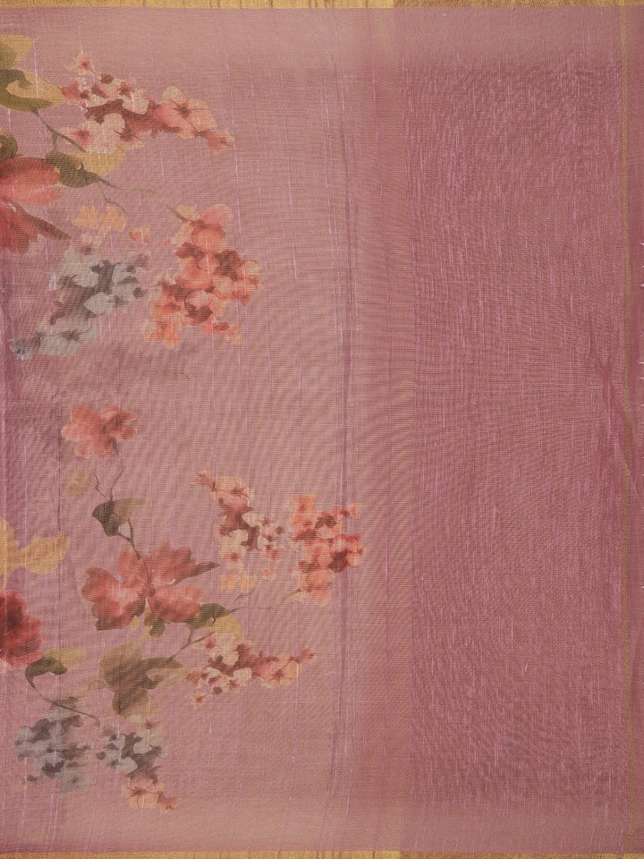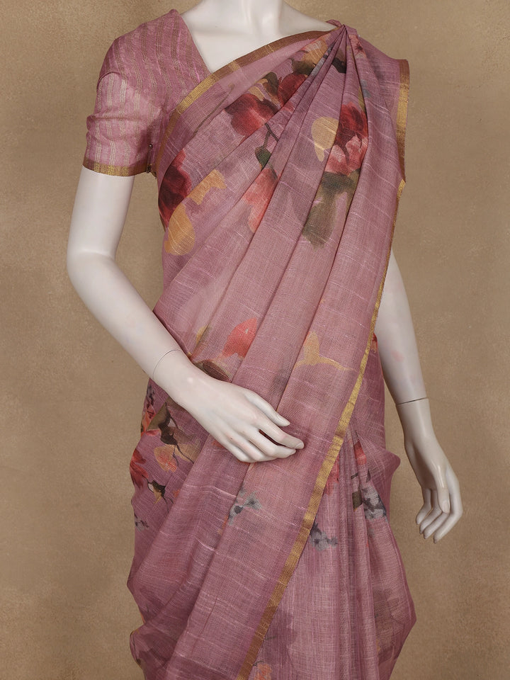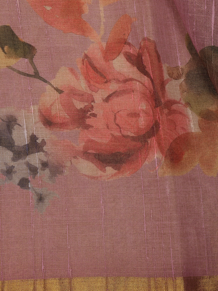 Dusty Rose Floral Printed Cotton Saree with Subtle Golden Zari Border