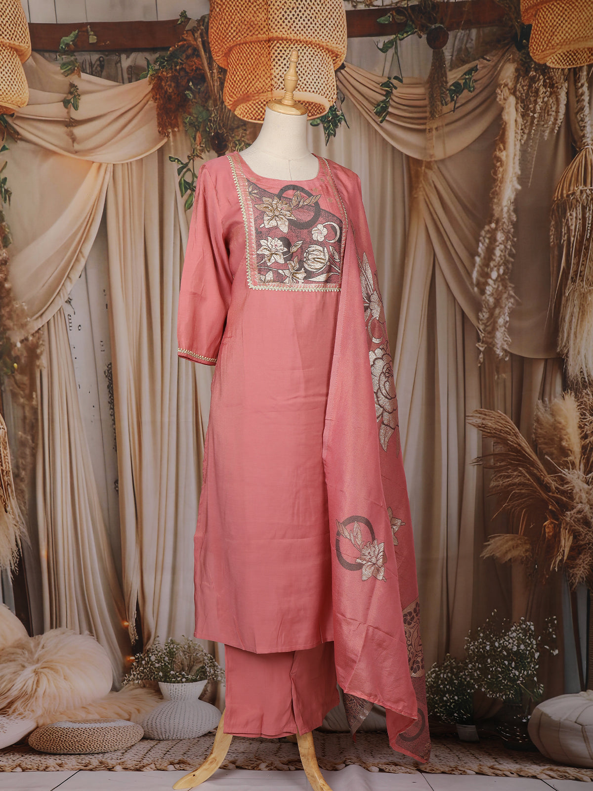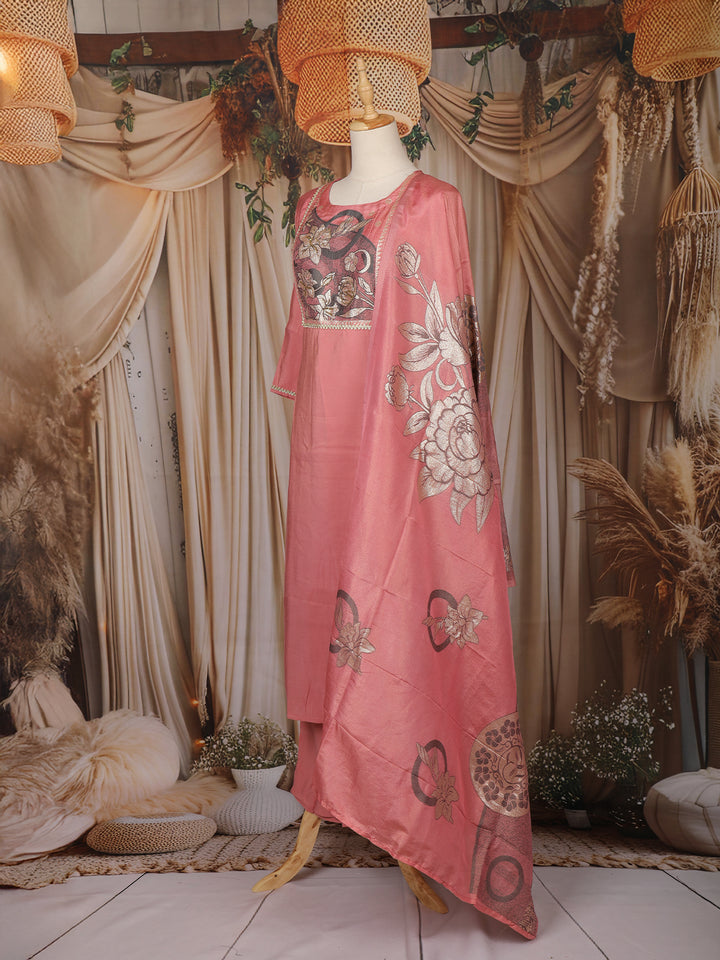 Breathe elegance into your everyday ethnic wear with this Dusty Rose Pink Floral Embroidered Cotton Straight Cut Salwar Suit. Crafted from soft and breathable cotton fabric, this ensemble beautifully combines comfort with understated sophistication.