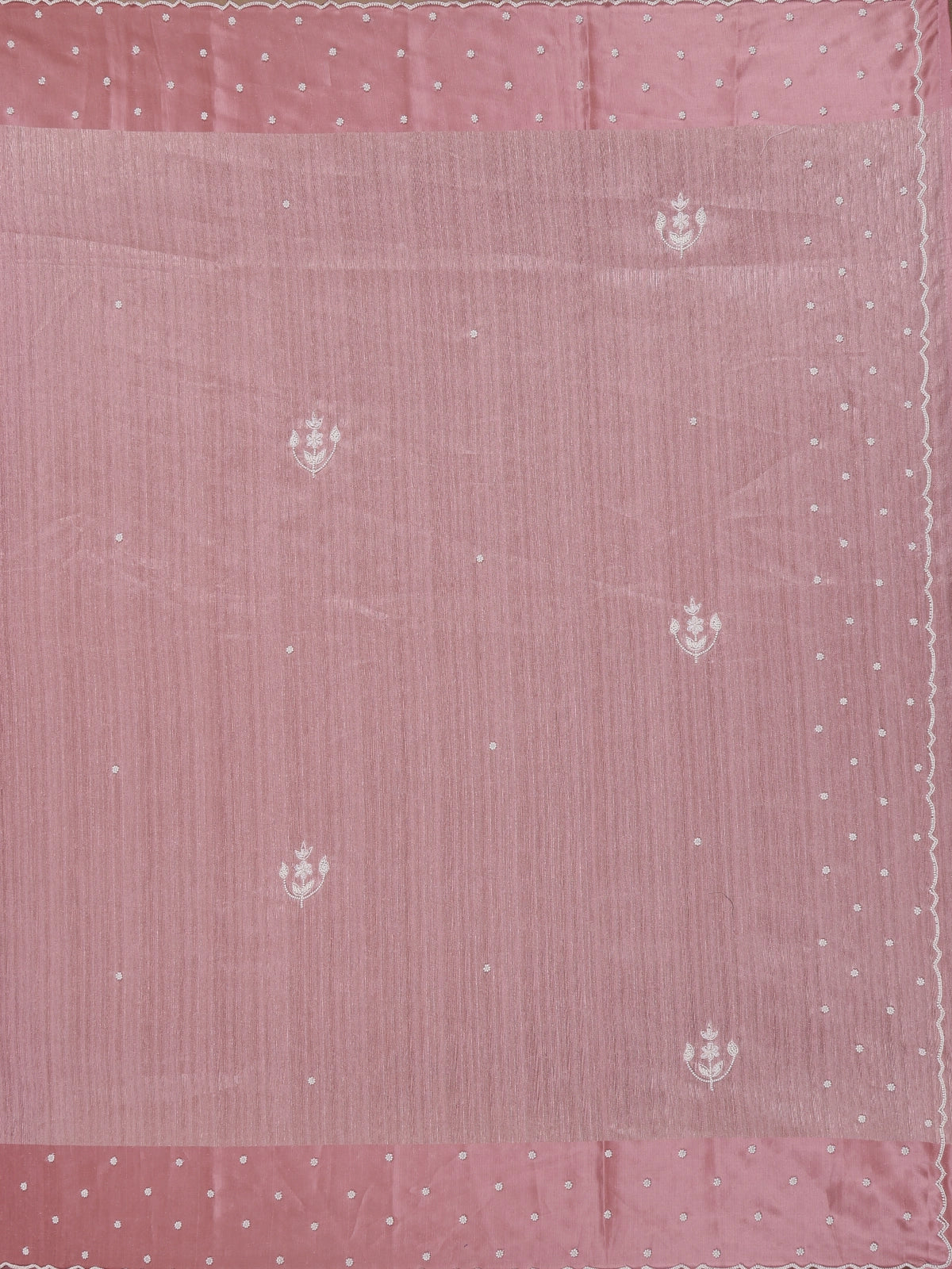 The saree is adorned with delicate floral thread embroidery and tiny buttas spread gracefully across the body, while the scalloped embroidered border adds a graceful edge that defines elegance. The matching pallu and blouse complete the look, ensuring seamless harmony in color and design.
