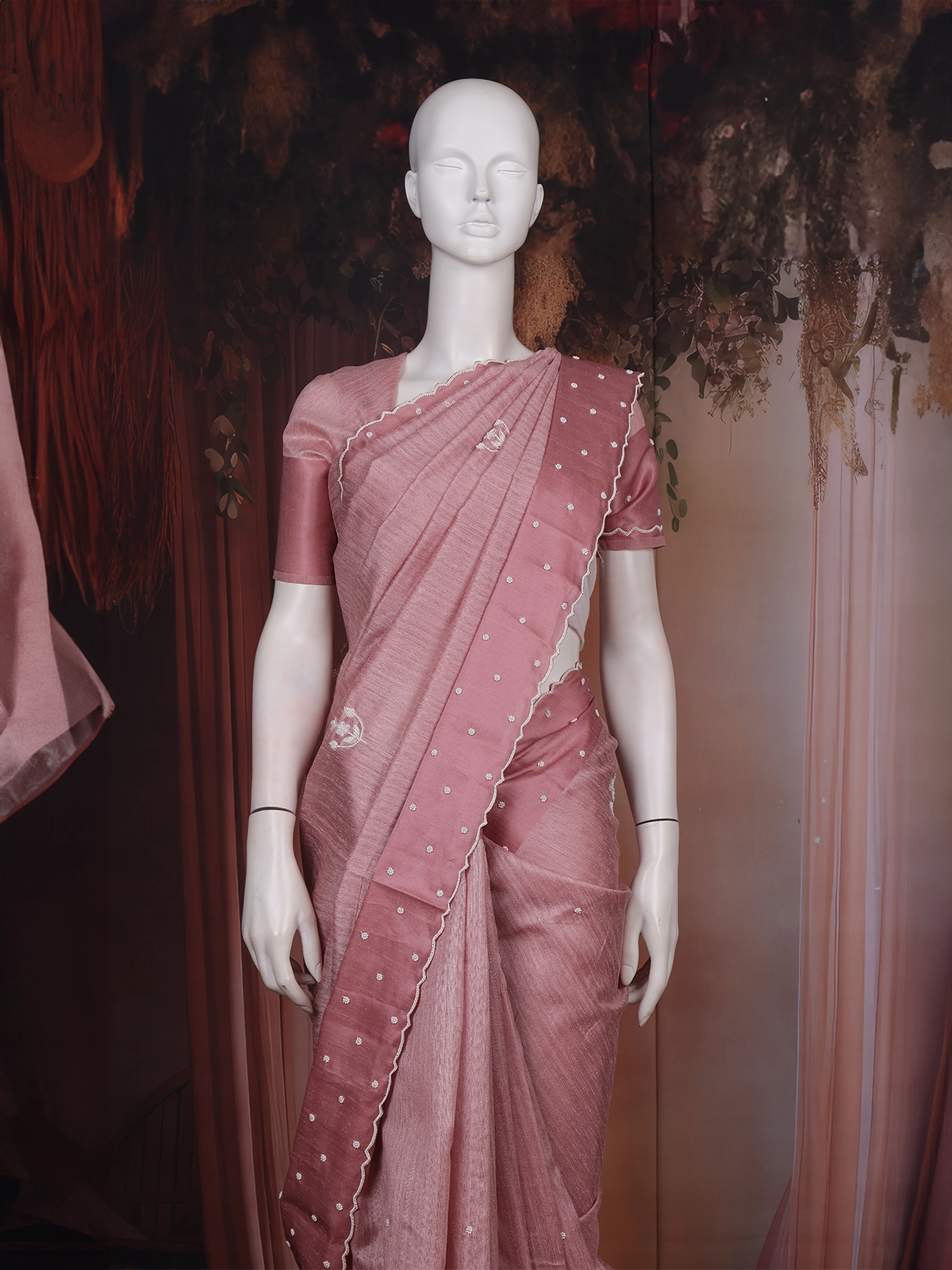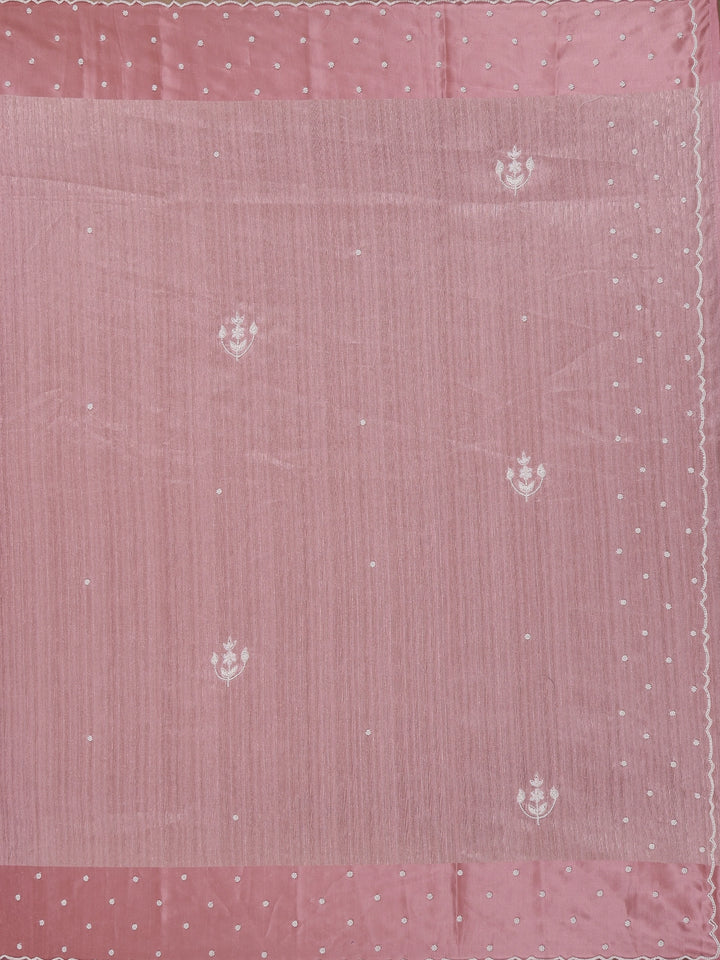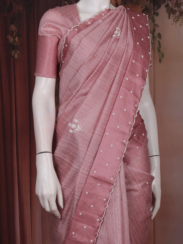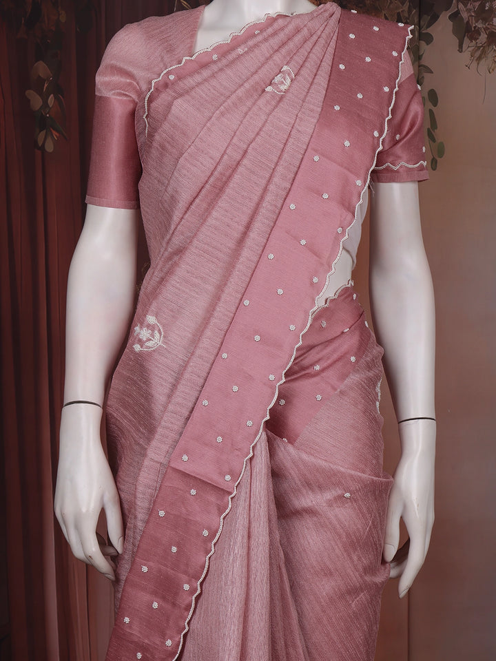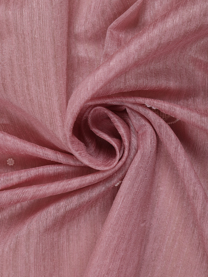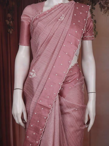 Dusty Rose Pink Floral Embroidered Raw Silk Saree