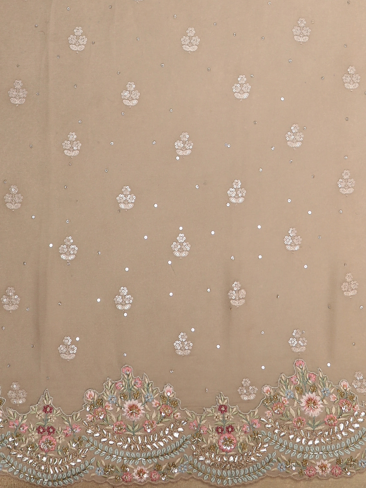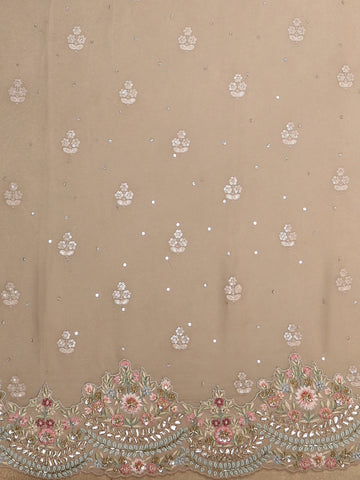 The body is beautifully enhanced with intricate floral embroidery, meticulously adorned using sequins, beads, and fine threadwork. The embroidery flows along the border in an elegant scalloped pattern, extending gracefully into the pallu and lower drape, creating a seamless visual harmony. Delicate embellishments scattered across the saree add a gentle shimmer, catching the light without overwhelming the softness of the fabric.